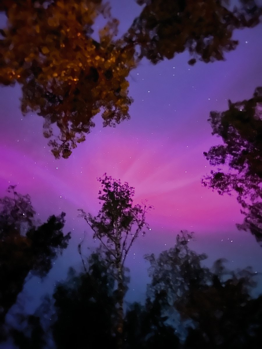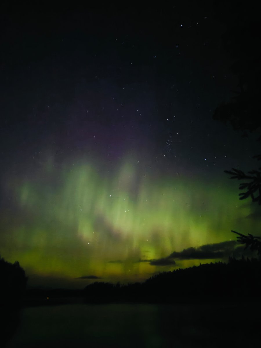 Am Abend gab es Stockbrot in süßer und herzhafter Variante, ein einfaches, aber leckeres Essen am Lagerfeuer. Während wir unser Mahl genossen, wanderte Valentins Blick plötzlich zum Himmel. Was wir dann sahen, verschlug uns die Sprache: Nordlichter! Der Himmel war von grünen, teilweise pink-lila schimmernden Lichtern durchzogen, die wie magische Strahlen über uns tanzten. Wir standen da, voller Ehrfurcht, und konnten kaum glauben, was sich vor unseren Augen abspielte. Wir machten einige Fotos, aber die wahre Schönheit dieses Naturphänomens ließ sich kaum festhalten. Noch überwältigt von dem, was wir erlebt hatten, krochen wir schließlich in unsere Schlafsäcke und schliefen zufrieden ein.