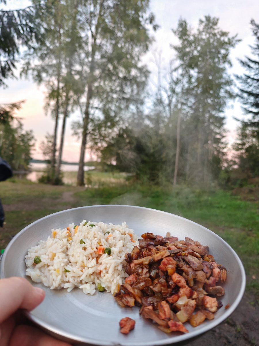 Gegen 17 Uhr erreichten wir Dano 8 und waren sofort begeistert. Die Insel lag etwas erhöht, und von dort oben hatte man einen atemberaubenden Blick über den See und die umliegenden Wälder. Wir bezogen die Wetterschutzhütte, die uns für die Nacht Unterschlupf bot. Am Lagerfeuer bereiteten wir unsere erste richtige Mahlzeit des Urlaubs zu: Bratkartoffeln mit Speck und Zwiebeln. Während die Sonne langsam unterging, fühlten wir uns angekommen – nicht nur in Schweden, sondern auch im Herzen der Natur. Nach diesem ereignisreichen Tag fielen wir in einen tiefen, erholsamen Schlaf und holten den Schlafmangel der Anreise nach.