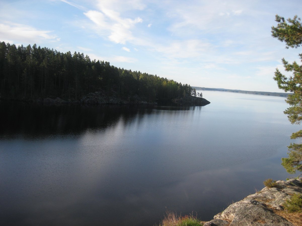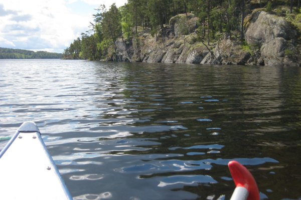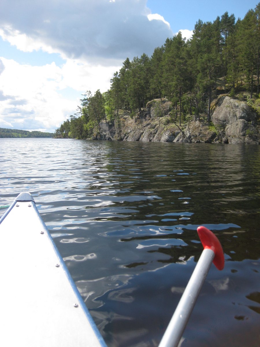 Das Kanu schaukelte bereits in der kleinen Bucht auf den kleinen Wellen und der Seegang würde wohl wesentlich härter werden, sobald wir den Schutz der kleinen Bucht verlassen hätten. Von unserer Startposition aus mussten wir in südöstliche Richtung über eine weitläufige Wasserfläche zur Einfahrt ins Basislager paddeln. Uns erschien es als klügste Variante nah an der westlichen Uferlinie zu bleiben und schließlich erst nah bei der Südlichen einzuschwenken. Von dort würden wir die Landspitze zu unserer Rechten behalten und, nach Umrundung selbiger, nah an der Westseite in die Bucht von Lennartsförs einbiegen.