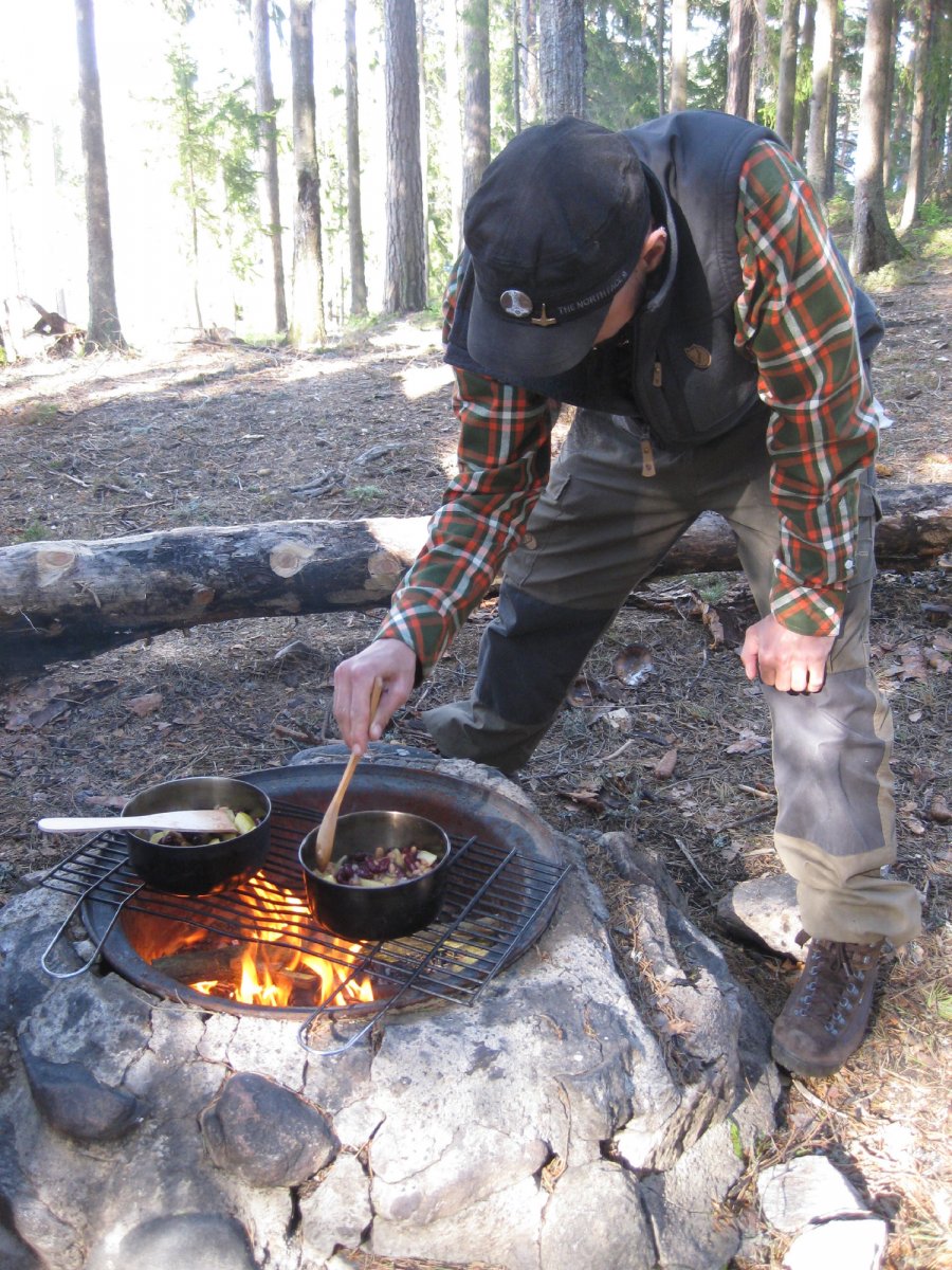 Die junge Birke verging schnell in den gierigen Flammen und hinterließ eine wohlig-warme Weißglut. Die verbliebenen Teigreste drückten wir flach in eine kleine, gefettete Pfanne und belegten sie mit Apfelstücken. Die Pfanne kam direkt in die Glut und wurde mit Steinen abgedeckt.