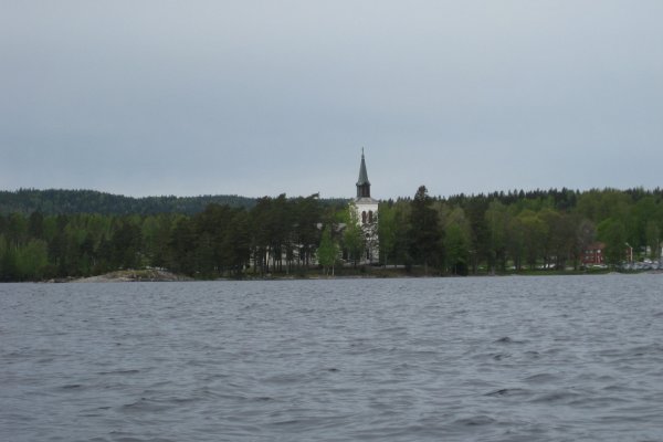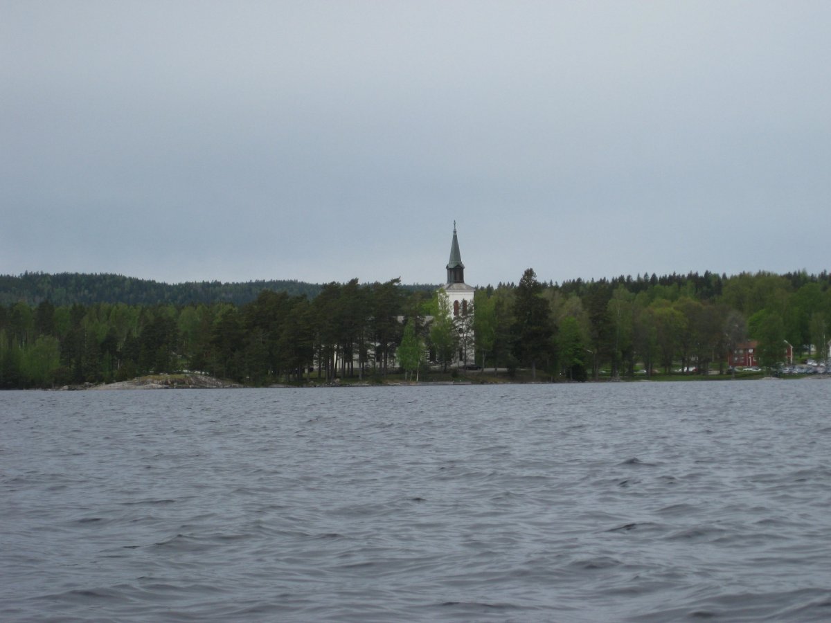 Den ersten Part per Karte und Kompass zu navigieren, war eine einfache Aufgabe. Zwei gut sichtbare Landmarken waren uns hierbei behilflich. Um vom nördlichen Ausläufer in den weitläufigen Mittelteil des Foxen zu gelangen, mussten wir eine große, blaue Brücke durchfahren. Diese Brücke bei Fagelvik war, wenn man sich in der richtigen Sichtachse befand, viele Kilometer weit zu sehen. Nach der Brücke wollten wir uns an der westlichen Uferlinie halten und gen Süden den Foxen hinab paddeln. Der Beginn der Uferlinie wurde von der sehr exponierten, auf einer kleinen Halbinsel gebauten Fagelsviker Kirche markiert. Eine prima Landmarke! In diesem Bereich des Sees erreicht er auch seine größte Tiefe von knapp 100 Metern.
