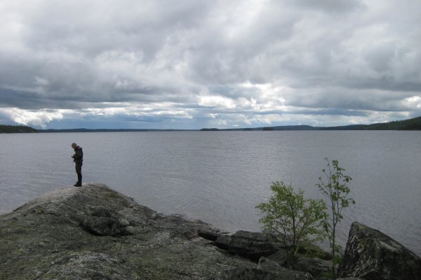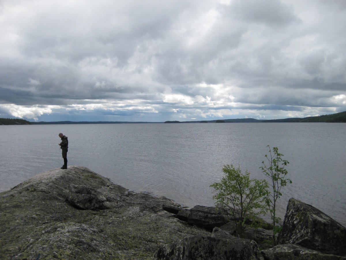 Nun wurde die Navigation ungleich schwerer. Der Foxen wird immer breiter und weitläufiger. Inselchen inmitten der Wasserfläche sind erst weiter südlich wieder zu finden und die bloße Orientierung anhand von Ufermerkmalen (Buchten, Einkerbung, etc.) ist, über die Distanz vom Kanu aus, schwierig und ungenau. Wir beschlossen daher eine Orientierungspause auf der Landzunge vor der großen Bucht Vangsviken einzulegen.