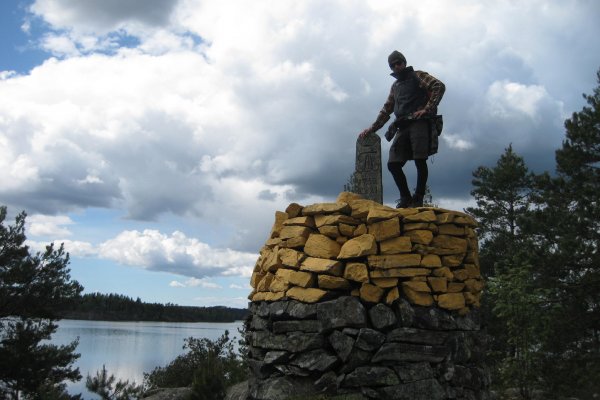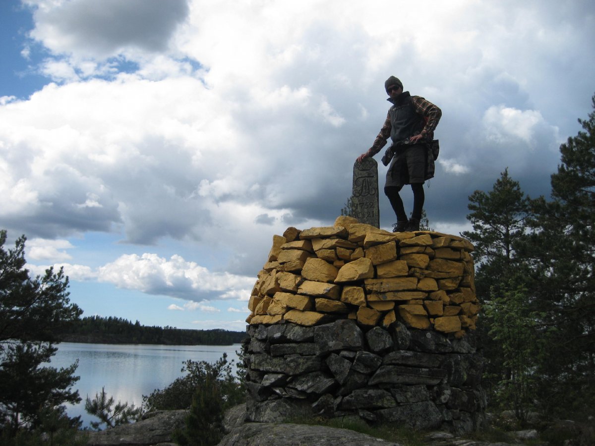 Das Wetter war wieder einmal sehr durchwachsen und wir taten uns bei immer stärker werdendem Wellengang schwer, trockenen Fußes Trollöns felsige Uferkante zu betreten. Das Kanu wurde an einer kleinen Birke vertäut und trieb wankend auf den Wellen, während wir uns zu Fuß durch dichtes Unterholz schlugen. Auf dem südlichen Inselausläufer, erhaben und weit sichtbar, fanden wir schließlich den gelb getünchten Grenzsteinhaufen.