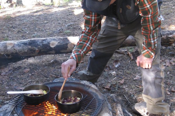 Wie schon zu viele Abende zuvor keimte dennoch die Hoffnung unter den Strahlen der Sonne, die durch die Wolkenbänke brach. Wir beschlossen, uns mental erst wieder morgen Früh mit dem Rückweg zu befassen. Es ging nun vorerst daran, neben den Holzresten auch einige angebrochene Lebensmittel aus unserer Essenstonne zu verbrauchen. Es gab noch einiges an Mehl und Backpulver. Zusammen mit Zucker und Wasser ergab das nun eine perfekte Teigmischung für Stockbrot. Während der geknetet Teig im Blechtopf noch etwas gehen konnte, suchten wir uns zwei leidlich frisch geschlagen Äste. Die Holzstöcke durften nicht zu trocken sein, um nicht Feuer zu fangen, wenn sie über den Flammen gedreht würden. Mit meinem guten Finnenmesser zur Hand entrindete ich einen Ast großzügig und schnitzte eine Spitze an sein Ende. Hannah hatte interessiert zugesehen, schnappte sich hierauf das Messer und verfuhr mit ihrem Stock genauso.
