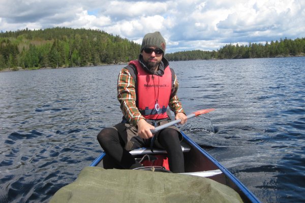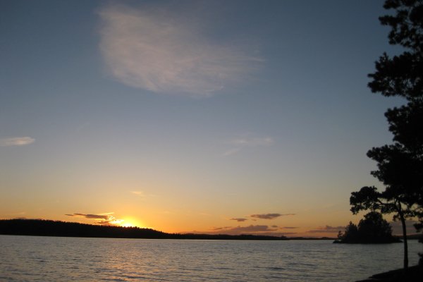 Dann stachen wir endlich mit unserem Kanu in See, vor einigen anderen, die sich noch durch die Organisation am Check-In kämpfen mussten. Wir orientierten uns mit Karte und Kompass gen Norden. Grundsätzlich bin ich mit derartiger Navigation vertraut und doch barg die Landschaft vom Start weg ein paar Schwierigkeiten. Zum einen war es ohne elektrische Hilfsmittel schwer, die zurückgelegte Streckendistanz zu ermitteln. Zum anderen war durch die riesenhaften Wasserflächen und breit zerklüfteten, waldgesäumten Küsten-/Inselstreifen eine Übertragung unserer Lage auf die Karte mitunter kompliziert und ungenau.