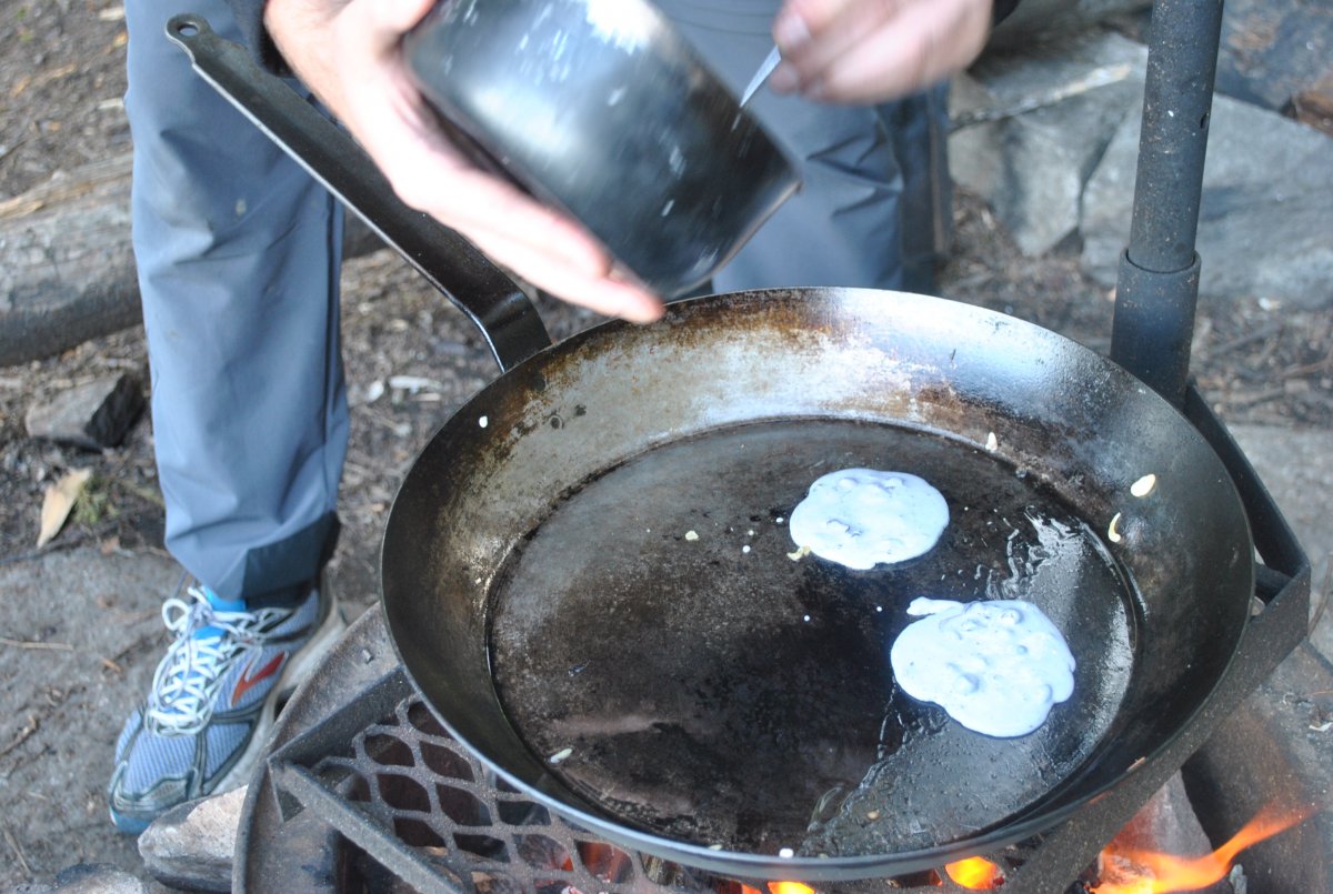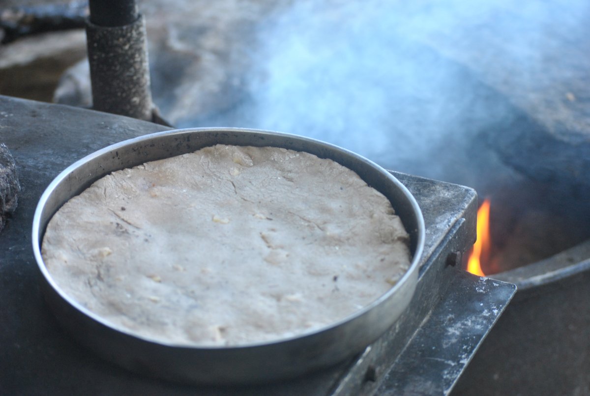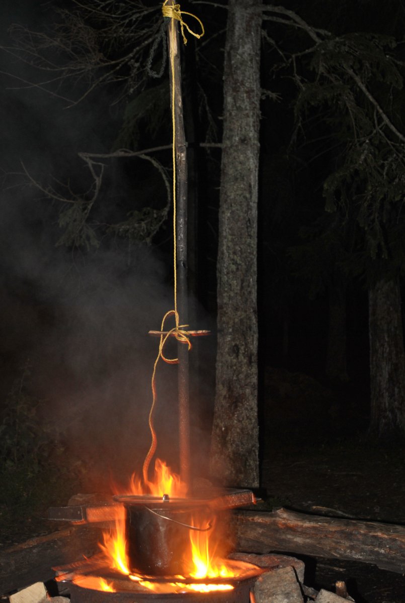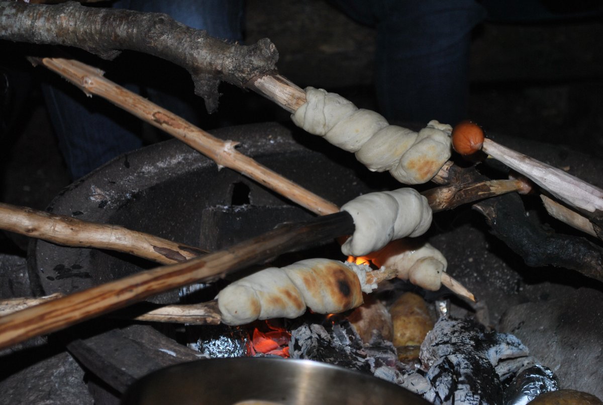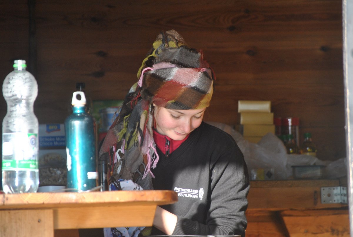 Als wir unsere Essenspakete ausgepackten und alles fein säuberlich in Kategorien sortiert haben kamen uns ungefähr solche Schlagwörter in den Sinn: „Wer soll das alles essen“, „Reicht das?“, „Was ist das?“, „Passt das mit dem zusammen?“, „Wie in Gottes Namen sollen wir das denn für 8!!! Personen gleichzeitig kochen und heiß bekommen?“…die Kulinarität hat dann tatsächlich den Tag ein Stück weit mitbestimmt. Vom Gedanken spontan also mal kurz den Kühlschrank aufzumachen hatten wir uns schnell verabschiedet. Wir haben das Outdoor-Kochbuch fein säuberlich studiert, uns tageweise in Gruppen eingeteilt und dann wurde mit Kochbuch, Fantasie, vollem Körpereinsatz erst mal Holz gesägt, geschlagen, Büchsen geöffnet, Wasser geholt und gekocht. Wir haben in den 7 Tagen komplette 2 Netze Zwiebeln verarbeitet, ne Menge Vollkornbrot gegessen, welches wir mittlerweile echt meiden und alle Münder glücklich und die Mägen satt gemacht. Highlights waren natürlich die Stockbrotabende süß oder salzig, die Outdoorpizza, die gebackenen Brötchen und natürlich der von uns so genannte: „ Candierte-Outdoorapfel-Preiselbeerkompott-Blaubeergeburtstagskuchen“. Sage und schreibe 8 Stunden habe ich an diesem Kuchen rumgemacht bis er dann von uns 8 in ca. 20 Sekunden verspeist wurde. Das waren die besten 20 kulinarischen Sekunden meines Lebens!!!