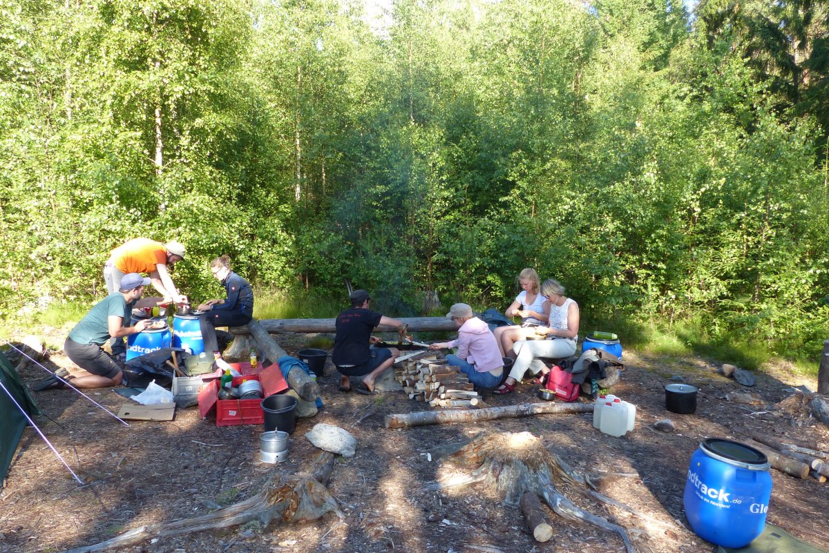 Und auch kulinarisch haben wir einige Höhepunkte gehabt. Auf einer Insel haben wir mit großen Steinen über eine Feuerstelle einen Steinofen gebaut und haben ihn gleich genutzt für einen PizzaAbend. Die Teigproduktion wurde gleich gestartet und jeder hat sich seine Lieblingspizza gebaut, als Dessert sogar mit Nutella bestrichen. Neben Milchreis (mit selbstgeschnitztem Löffel der Gruppe) mit Erdbeersoße, Bratkartoffeln, Mischgemüse und selbstgeangeltem Fisch, war der selbstgebackene Schokokuchen die Krönung. Der zweite Ofen wurde nicht nur aus Steinen gebaut, sondern auch noch mit Lehm verkleidet und mit Rentier und Teddybär verschönert. Die Holztür musste zwischendurch mal abgekühlt werden, da sie leicht Feuer fing, aber das brachte uns nicht davon ab einen Kuchenteig anzurühren und zu backen. Trotz leicht rauchigem Aroma schmeckte der Kuchen richtig klasse.