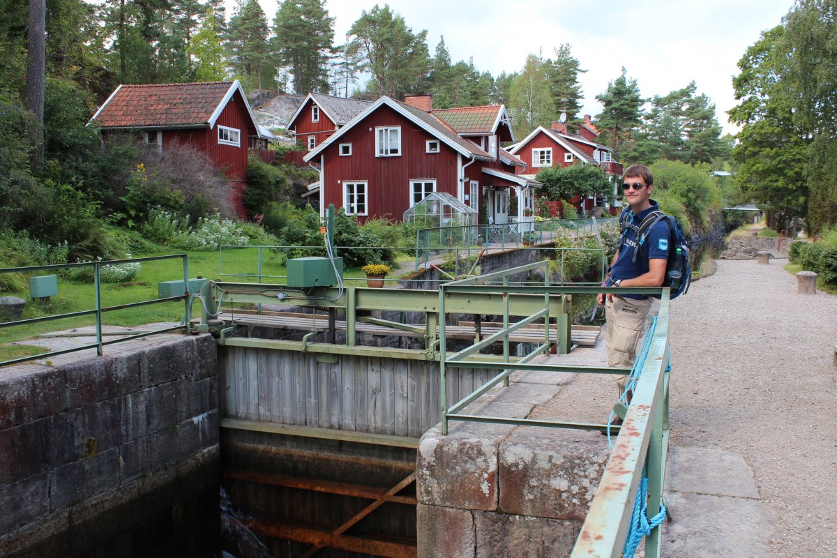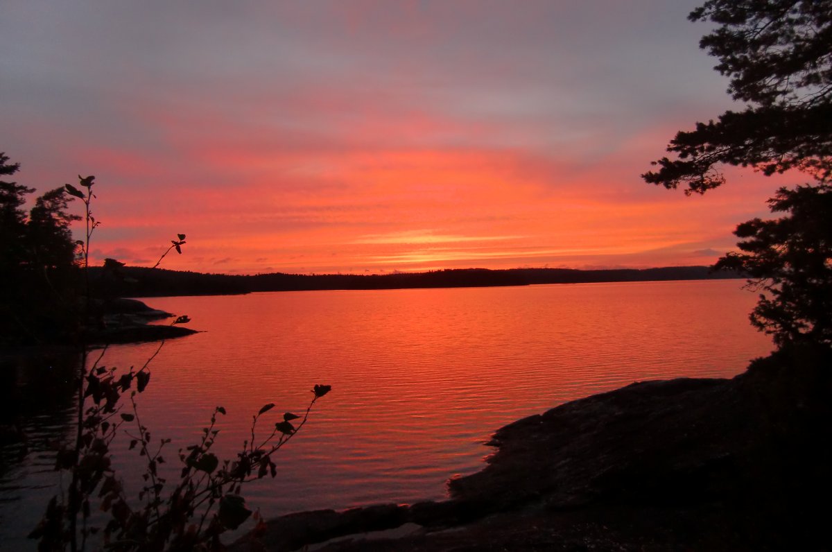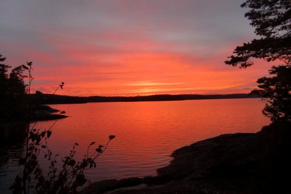 Am nächsten Morgen fuhren wir bei strahlendem Sonnenschein weiter bis nach Lennartsfors. Hier entdeckten wir etwas, das wir längst für ein Märchen gehalten hatten: Zivilisation!! Das Dorf hat nicht nur eine sehr schöne Schleuse zu bieten, sondern darüber hinaus auch noch eine Tankstelle sowie ein Café. Vom Anleger auf der anderen Seite des Dorfes machten wir eine Wanderung in den Wald, wo wir ein einsames, kleines Haus fanden, welches seit 1950 unbewohnt aber immer noch im damaligen Stil voll möbliert ist. Nachmittags fuhren wir auf dem Foxen weiter und fanden in einer Bucht die beste Lagerstelle unserer Reise. Vor uns hatte dort bereits jemand einen Tisch aus Steinen gebaut mit einem Baumstamm als Bank. Von der Bucht aus hatte man einen tollen Blick über den See auf den Sonnenuntergang.