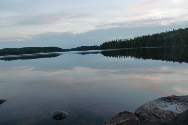 Die erste Paddeletappe am nächsten Morgen war nur sehr kurz. Nach weniger als einer Stunde mussten wir unser Kanu auf den Kanuwagen laden und über Land weiterziehen. Auch wenn die Wanderung etwas anstrengend war, konnten wir doch die sehr schöne Landschaft genießen, durch die leichter Kamilleduft wehte. Am nächsten See angekommen, ließen wir das Kanu ins Wasser und gingen bei herrlichem Sonnenschein erstmal ausgiebig schwimmen. Auf dem Övre Blomsjön sind wir anschließend keinen anderen Kanus begegnet, ebenso waren heute (Montag) auch keine Motorboote mehr unterwegs. In Ed mussten wir unser Kanu dann zum zweiten Mal umtragen, vorbei an einer ehemaligen Wassermühle und einem Steinbruch. Auf dem Nedre Blomsjön paddelten wir noch bis Rastplatz 32. Nachdem wir dort unser Nachtlager aufgeschlagen und zu Abend gegessen hatten, bewunderten wir den See, dessen Oberfläche von Minute zu Minute glatter wurde, bis schließlich überhaupt keine Bewegung mehr auszumachen war.