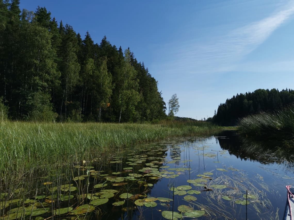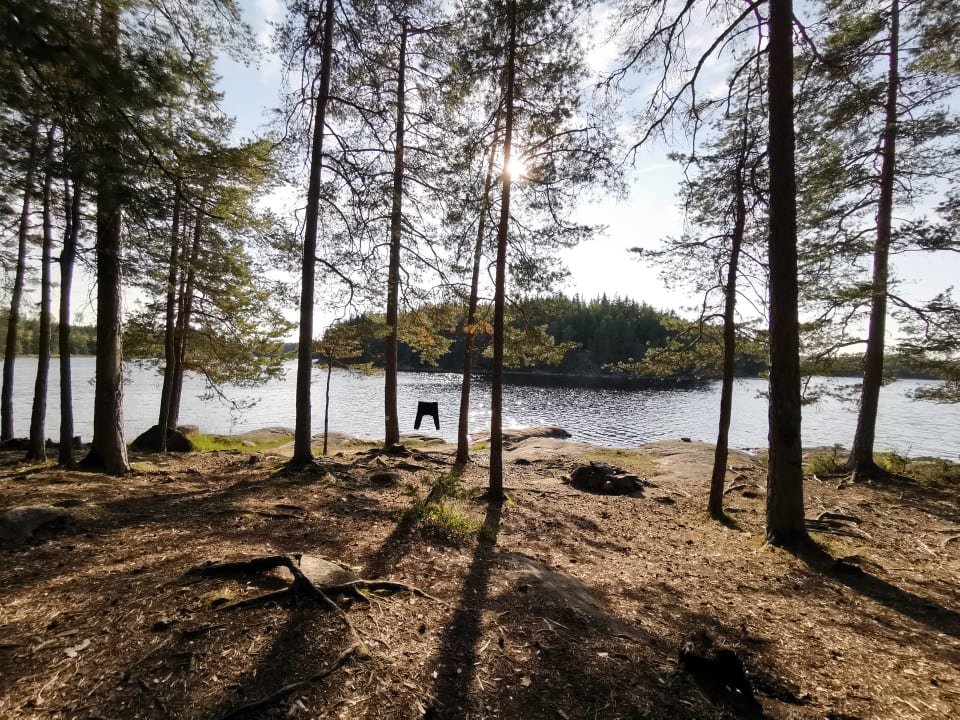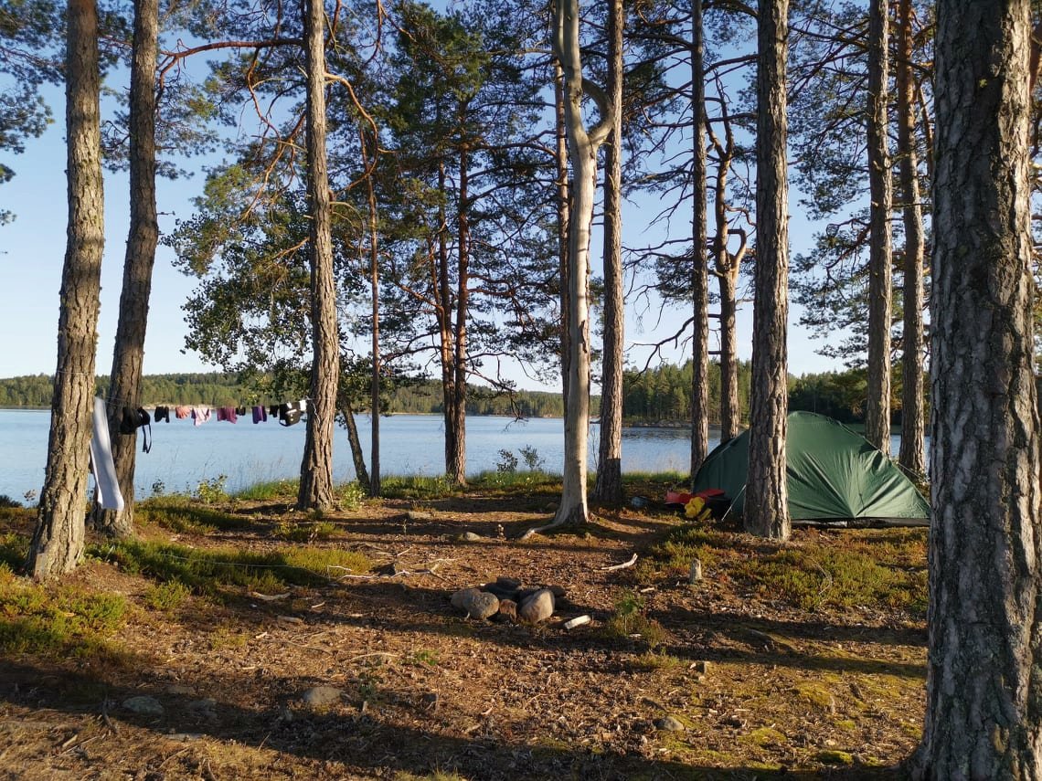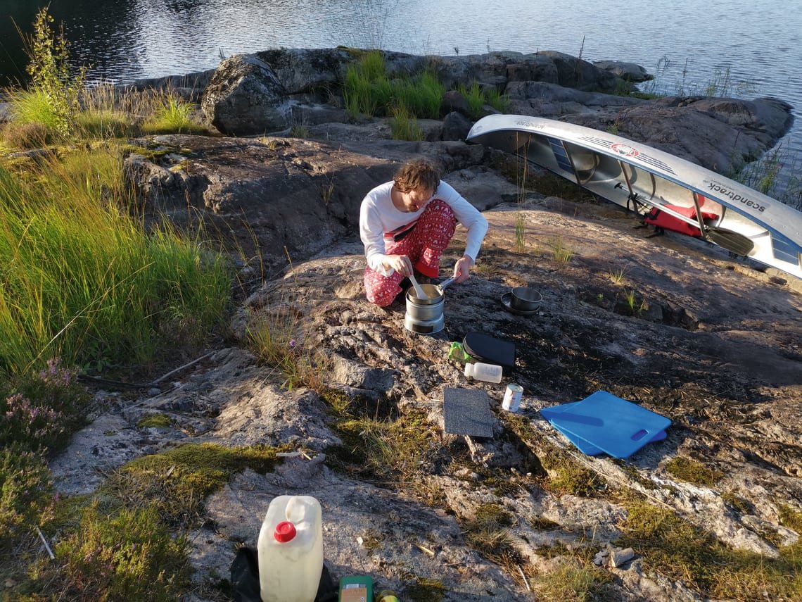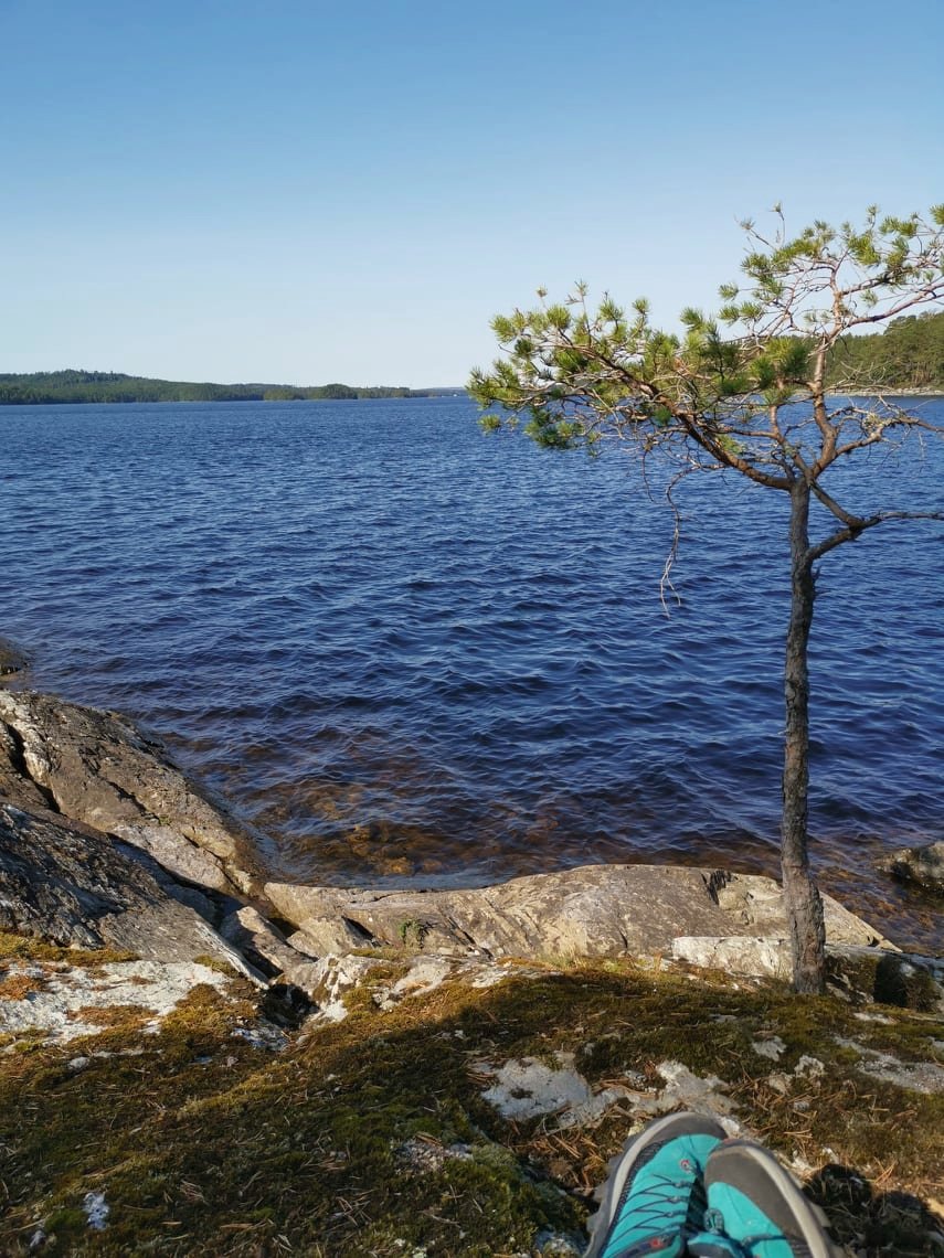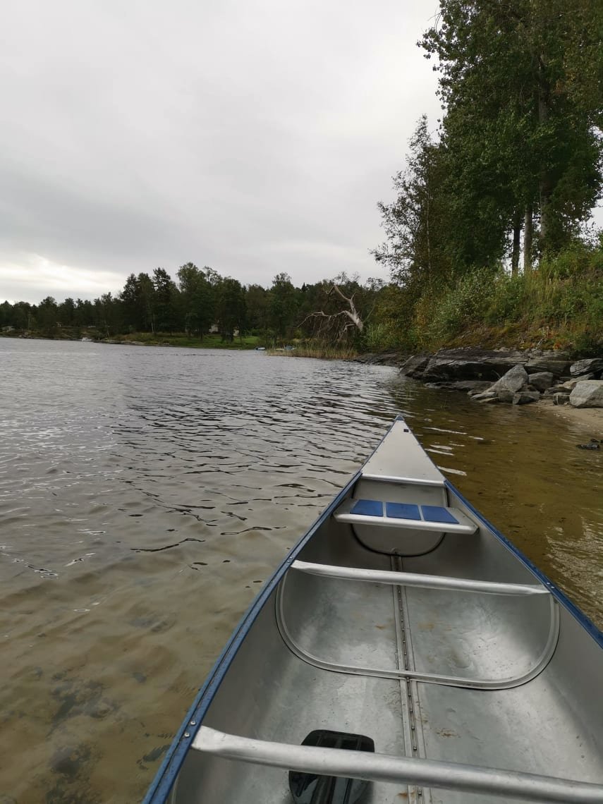 Die weitere Fahrt im Bus war vor allem davon geprägt, eine geeignete Schlafposition zu finden, um zumindest ein paar Stunden schlummern zu können. Dies gelang auch, wurde jedoch durch verschiedene Störungen unterbrochen. Darunter beispielsweise ein laut meckernder Scandi, weil die Bustoilette verstopft war und (nach seinen Aussagen) „der ganze Bus unter Wasser“ stand. Dies führte dazu, dass wir vor der zweiten Fährüberfahrt erst einmal ein wenig standen, um das Wasser wieder loszuwerden. Die „Frühstückspause“ an einer Tankstelle konnten wir leider nicht für ein Frühstück nutzen, da drei oder vier Busse gleichzeitig ankamen, sodass die Schlange viel zu lang war, um noch etwas zu ergattern. Zudem begrüßte Schweden uns mit Kälte, sodass ich froh war, als es endlich weiterging. Am Lager Höglund angekommen, mussten wir erst ein wenig warten, bis unsere Hütte am See fertig war. Dann wurde uns diese gezeigt, wir bekamen die Essenstonne und die Ausrüstung und nachdem wir uns ein wenig eingerichtet hatten, genossen wir zuallererst ein gemütliches Frühstück auf unserer kleinen Terrasse. Nachdem wir den ersten Tag damit verbrachten, uns an das Kanu zu gewöhnen und die Gegend ein wenig zu erkunden, war das Ziel des nächsten Tages, nach Norwegen zu reisen. Wenn man schon mal die Gelegenheit hat, sich an einem Tag in zwei unterschiedlichen Ländern aufzuhalten, möchte man das schließlich auch nutzen. Die Fahrt war lang (vor allem weil wir am Abend wieder an der Hütte ankommen wollten), aber definitiv lohnenswert. Zudem konnten wir einige Wanzen vorm Ertrinken retten und fanden eine „Heidelbeerinsel“, die uns leckere Heidelbeerpfannkuchen bescherte. Für die darauffolgenden Tage, sprich Montag und Dienstag, hatten wir Größeres vor: Es sollte eine längere Tour werden mit Übernachtung im Zelt oder Dano-Unterstand. Wir besorgten uns also für zwei Nächte eine Nature Card im Camp und fuhren los. Die Flötefjorden sollten es werden. Dort wollten wir am liebsten eine der vielen Danos nutzen, um zu übernachten und natürlich die Gegend erkunden. Mein Freund hatte, obwohl dies bereits von mehreren Quellen widerlegt wurde, weiterhin die Hoffnung, dass wir irgendwo dort einen Wasserfall sehen, sodass wir jeden möglichen Winkel erkunden wollten. Nach einer langen Fahrt und einer ewigen Sucherei nach einer Dano, mussten wir uns leider damit abfinden, kein Stockbrot machen zu können und suchten uns einen Zeltplatz auf einer sehr kleinen und schnuckeligen Insel. Zunächst war noch nicht sicher, ob dies tatsächlich unser Schlafplatz wird, doch nachdem eine der Taschen samt Wechselunterwäsche Lust hatte, baden zu gehen (war ja auch sehr heiß, daher taten wir es ihr wenig später gleich), ließen wir uns dort nieder und nutzten die Ausrüstung, um uns eine Wäscheleine zu bauen. Die Nacht war kalt, sodass so manche Schlafsackwahl noch einmal überdacht wurde und zukünftig der Zwiebellook herhalten musste. Am nächsten Tag ging die Suche nach Wasserfällen weiter, führte uns allerdings nur zu unerwarteten Umtragestellen, fast ausgetrockneten Flüssen und anderen Sackgassen. Die Flüsse waren zwar sehr idyllisch und voller Fische, Libellen, Enten und Seerosen, brachten uns aber nicht weiter.