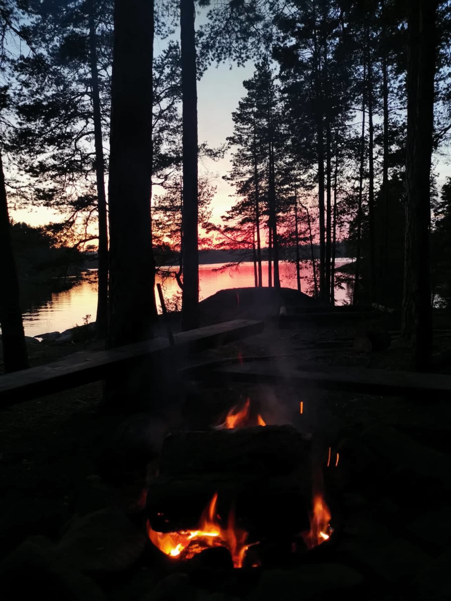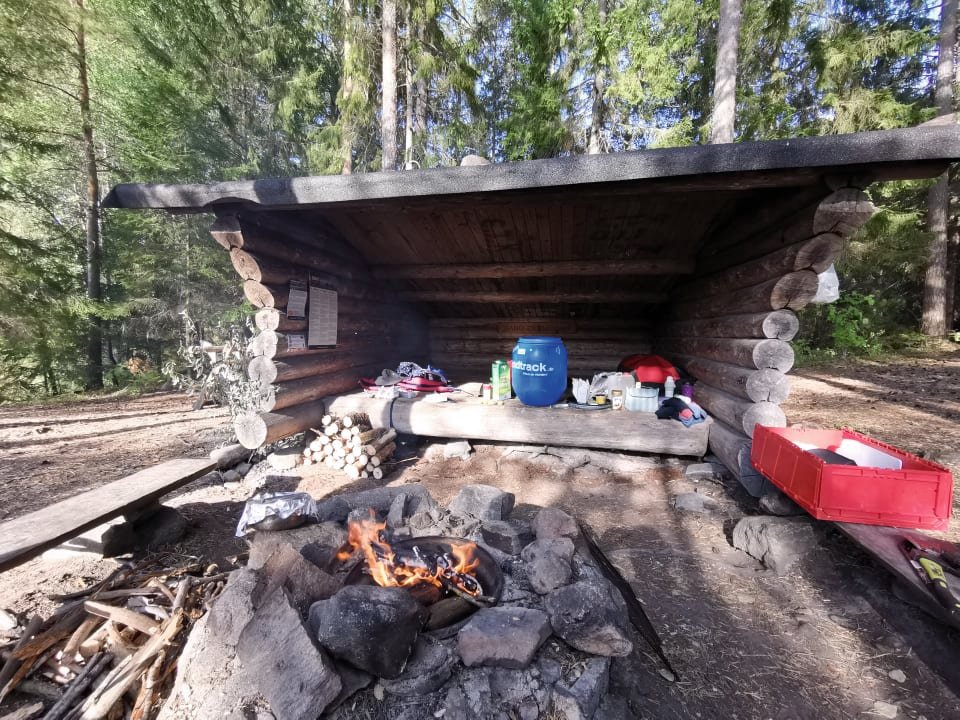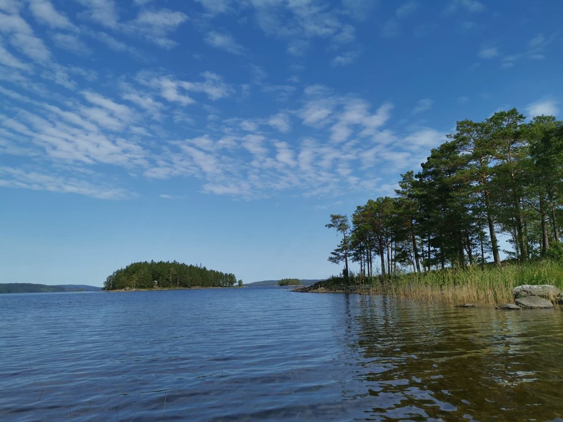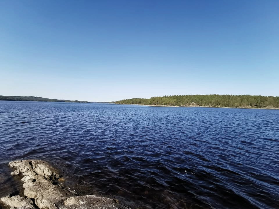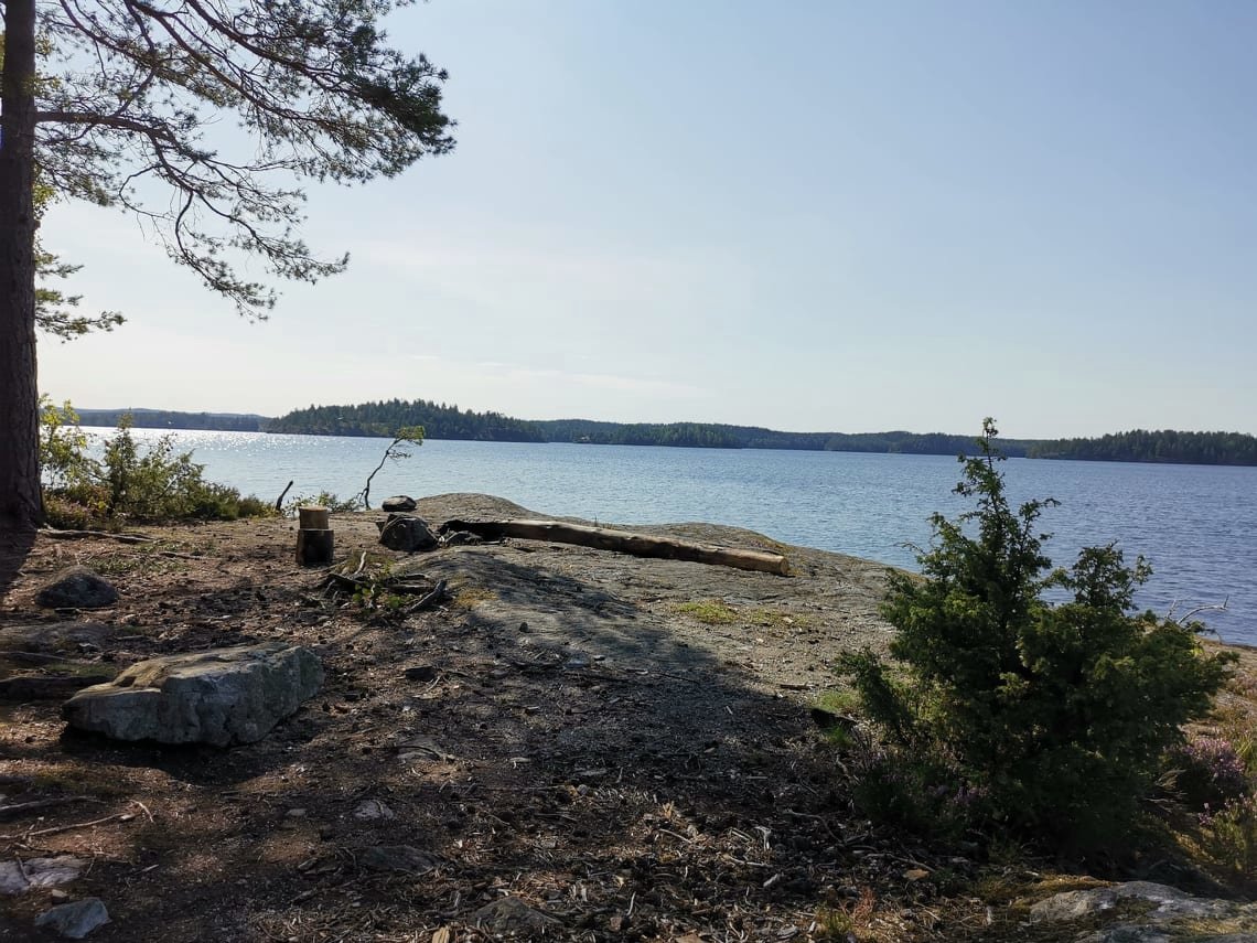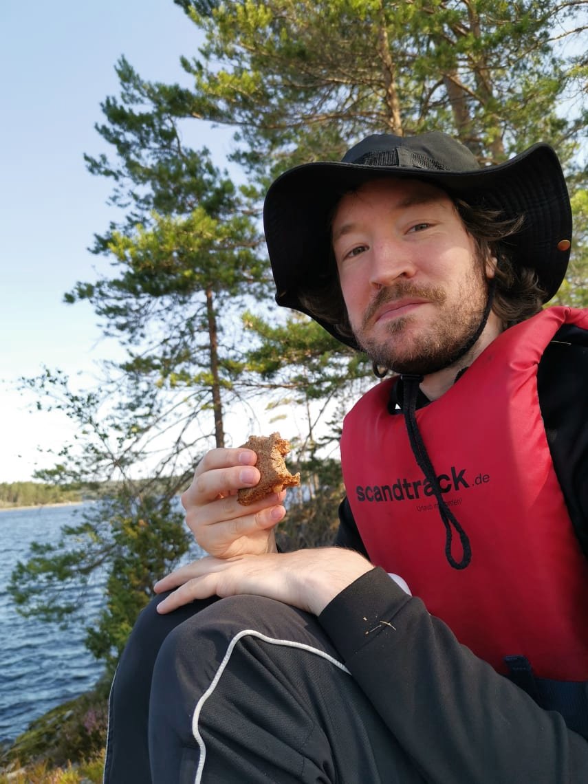 Die weitere Fahrt im Bus war vor allem davon geprägt, eine geeignete Schlafposition zu finden, um zumindest ein paar Stunden schlummern zu können. Dies gelang auch, wurde jedoch durch verschiedene Störungen unterbrochen. Darunter beispielsweise ein laut meckernder Scandi, weil die Bustoilette verstopft war und (nach seinen Aussagen) „der ganze Bus unter Wasser“ stand. Dies führte dazu, dass wir vor der zweiten Fährüberfahrt erst einmal ein wenig standen, um das Wasser wieder loszuwerden. Die „Frühstückspause“ an einer Tankstelle konnten wir leider nicht für ein Frühstück nutzen, da drei oder vier Busse gleichzeitig ankamen, sodass die Schlange viel zu lang war, um noch etwas zu ergattern. Zudem begrüßte Schweden uns mit Kälte, sodass ich froh war, als es endlich weiterging. Am Lager Höglund angekommen, mussten wir erst ein wenig warten, bis unsere Hütte am See fertig war. Dann wurde uns diese gezeigt, wir bekamen die Essenstonne und die Ausrüstung und nachdem wir uns ein wenig eingerichtet hatten, genossen wir zuallererst ein gemütliches Frühstück auf unserer kleinen Terrasse. Nachdem wir den ersten Tag damit verbrachten, uns an das Kanu zu gewöhnen und die Gegend ein wenig zu erkunden, war das Ziel des nächsten Tages, nach Norwegen zu reisen. Wenn man schon mal die Gelegenheit hat, sich an einem Tag in zwei unterschiedlichen Ländern aufzuhalten, möchte man das schließlich auch nutzen. Die Fahrt war lang (vor allem weil wir am Abend wieder an der Hütte ankommen wollten), aber definitiv lohnenswert. Zudem konnten wir einige Wanzen vorm Ertrinken retten und fanden eine „Heidelbeerinsel“, die uns leckere Heidelbeerpfannkuchen bescherte. Für die darauffolgenden Tage, sprich Montag und Dienstag, hatten wir Größeres vor: Es sollte eine längere Tour werden mit Übernachtung im Zelt oder Dano-Unterstand. Wir besorgten uns also für zwei Nächte eine Nature Card im Camp und fuhren los. Die Flötefjorden sollten es werden. Dort wollten wir am liebsten eine der vielen Danos nutzen, um zu übernachten und natürlich die Gegend erkunden. Mein Freund hatte, obwohl dies bereits von mehreren Quellen widerlegt wurde, weiterhin die Hoffnung, dass wir irgendwo dort einen Wasserfall sehen, sodass wir jeden möglichen Winkel erkunden wollten. Nach einer langen Fahrt und einer ewigen Sucherei nach einer Dano, mussten wir uns leider damit abfinden, kein Stockbrot machen zu können und suchten uns einen Zeltplatz auf einer sehr kleinen und schnuckeligen Insel. Zunächst war noch nicht sicher, ob dies tatsächlich unser Schlafplatz wird, doch nachdem eine der Taschen samt Wechselunterwäsche Lust hatte, baden zu gehen (war ja auch sehr heiß, daher taten wir es ihr wenig später gleich), ließen wir uns dort nieder und nutzten die Ausrüstung, um uns eine Wäscheleine zu bauen. Die Nacht war kalt, sodass so manche Schlafsackwahl noch einmal überdacht wurde und zukünftig der Zwiebellook herhalten musste. Am nächsten Tag ging die Suche nach Wasserfällen weiter, führte uns allerdings nur zu unerwarteten Umtragestellen, fast ausgetrockneten Flüssen und anderen Sackgassen. Die Flüsse waren zwar sehr idyllisch und voller Fische, Libellen, Enten und Seerosen, brachten uns aber nicht weiter.