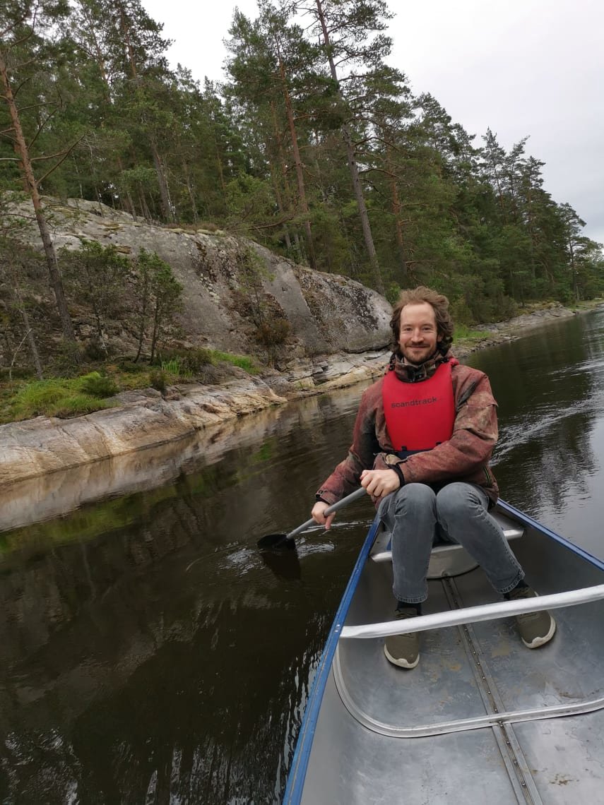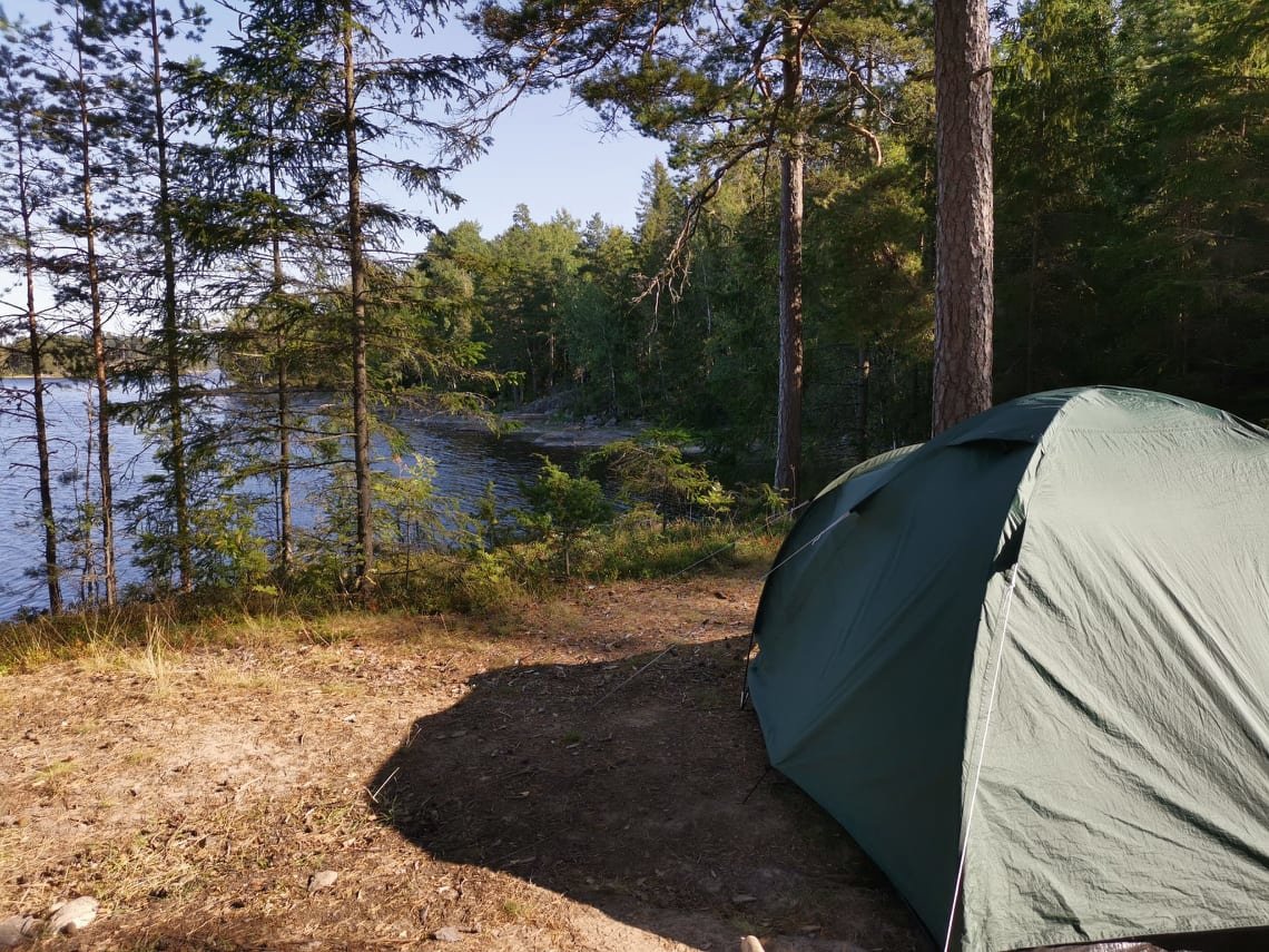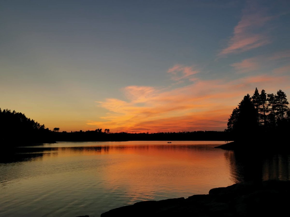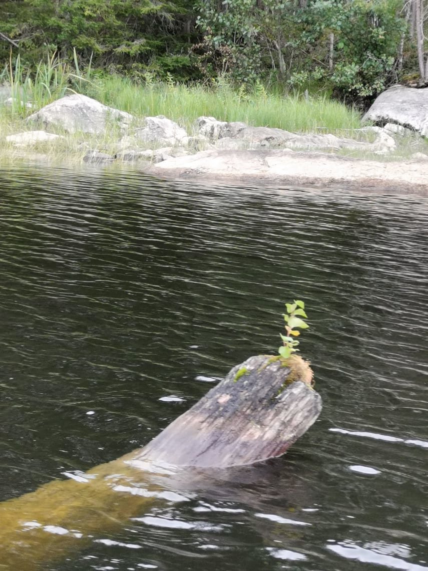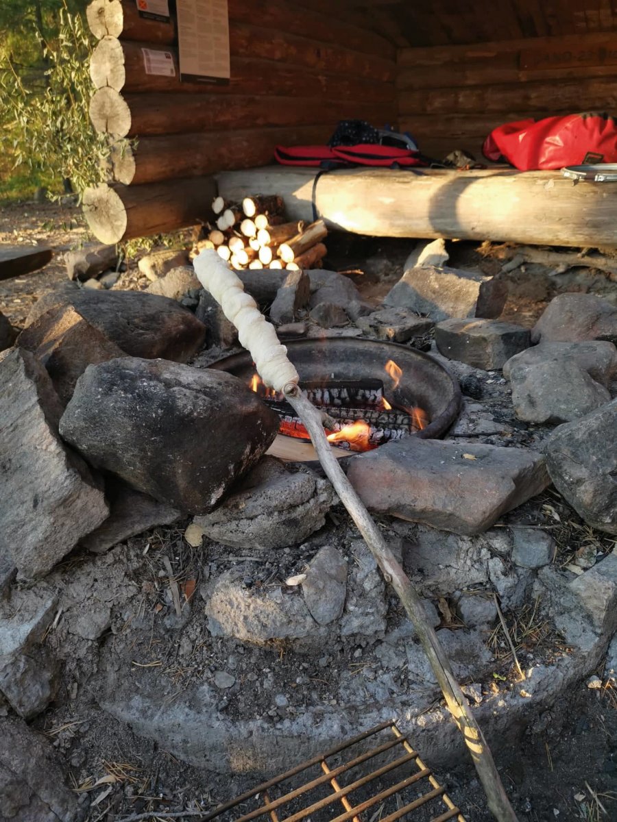 Die weitere Fahrt im Bus war vor allem davon geprägt, eine geeignete Schlafposition zu finden, um zumindest ein paar Stunden schlummern zu können. Dies gelang auch, wurde jedoch durch verschiedene Störungen unterbrochen. Darunter beispielsweise ein laut meckernder Scandi, weil die Bustoilette verstopft war und (nach seinen Aussagen) „der ganze Bus unter Wasser“ stand. Dies führte dazu, dass wir vor der zweiten Fährüberfahrt erst einmal ein wenig standen, um das Wasser wieder loszuwerden. Die „Frühstückspause“ an einer Tankstelle konnten wir leider nicht für ein Frühstück nutzen, da drei oder vier Busse gleichzeitig ankamen, sodass die Schlange viel zu lang war, um noch etwas zu ergattern. Zudem begrüßte Schweden uns mit Kälte, sodass ich froh war, als es endlich weiterging. Am Lager Höglund angekommen, mussten wir erst ein wenig warten, bis unsere Hütte am See fertig war. Dann wurde uns diese gezeigt, wir bekamen die Essenstonne und die Ausrüstung und nachdem wir uns ein wenig eingerichtet hatten, genossen wir zuallererst ein gemütliches Frühstück auf unserer kleinen Terrasse. Nachdem wir den ersten Tag damit verbrachten, uns an das Kanu zu gewöhnen und die Gegend ein wenig zu erkunden, war das Ziel des nächsten Tages, nach Norwegen zu reisen. Wenn man schon mal die Gelegenheit hat, sich an einem Tag in zwei unterschiedlichen Ländern aufzuhalten, möchte man das schließlich auch nutzen. Die Fahrt war lang (vor allem weil wir am Abend wieder an der Hütte ankommen wollten), aber definitiv lohnenswert. Zudem konnten wir einige Wanzen vorm Ertrinken retten und fanden eine „Heidelbeerinsel“, die uns leckere Heidelbeerpfannkuchen bescherte. Für die darauffolgenden Tage, sprich Montag und Dienstag, hatten wir Größeres vor: Es sollte eine längere Tour werden mit Übernachtung im Zelt oder Dano-Unterstand. Wir besorgten uns also für zwei Nächte eine Nature Card im Camp und fuhren los. Die Flötefjorden sollten es werden. Dort wollten wir am liebsten eine der vielen Danos nutzen, um zu übernachten und natürlich die Gegend erkunden. Mein Freund hatte, obwohl dies bereits von mehreren Quellen widerlegt wurde, weiterhin die Hoffnung, dass wir irgendwo dort einen Wasserfall sehen, sodass wir jeden möglichen Winkel erkunden wollten. Nach einer langen Fahrt und einer ewigen Sucherei nach einer Dano, mussten wir uns leider damit abfinden, kein Stockbrot machen zu können und suchten uns einen Zeltplatz auf einer sehr kleinen und schnuckeligen Insel. Zunächst war noch nicht sicher, ob dies tatsächlich unser Schlafplatz wird, doch nachdem eine der Taschen samt Wechselunterwäsche Lust hatte, baden zu gehen (war ja auch sehr heiß, daher taten wir es ihr wenig später gleich), ließen wir uns dort nieder und nutzten die Ausrüstung, um uns eine Wäscheleine zu bauen. Die Nacht war kalt, sodass so manche Schlafsackwahl noch einmal überdacht wurde und zukünftig der Zwiebellook herhalten musste. Am nächsten Tag ging die Suche nach Wasserfällen weiter, führte uns allerdings nur zu unerwarteten Umtragestellen, fast ausgetrockneten Flüssen und anderen Sackgassen. Die Flüsse waren zwar sehr idyllisch und voller Fische, Libellen, Enten und Seerosen, brachten uns aber nicht weiter.