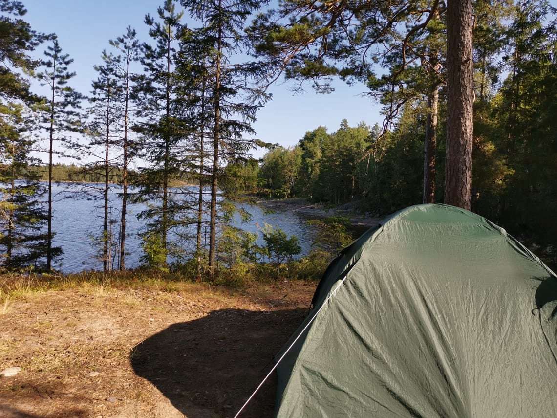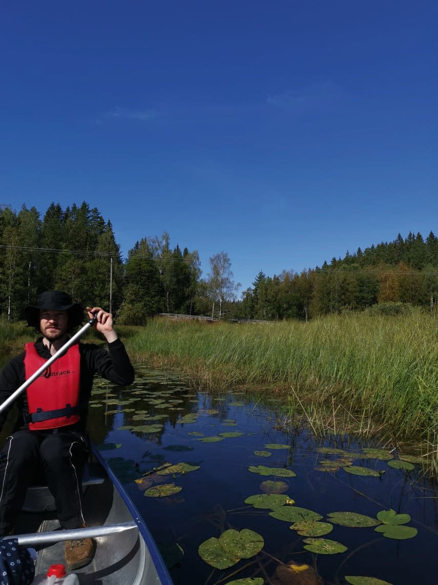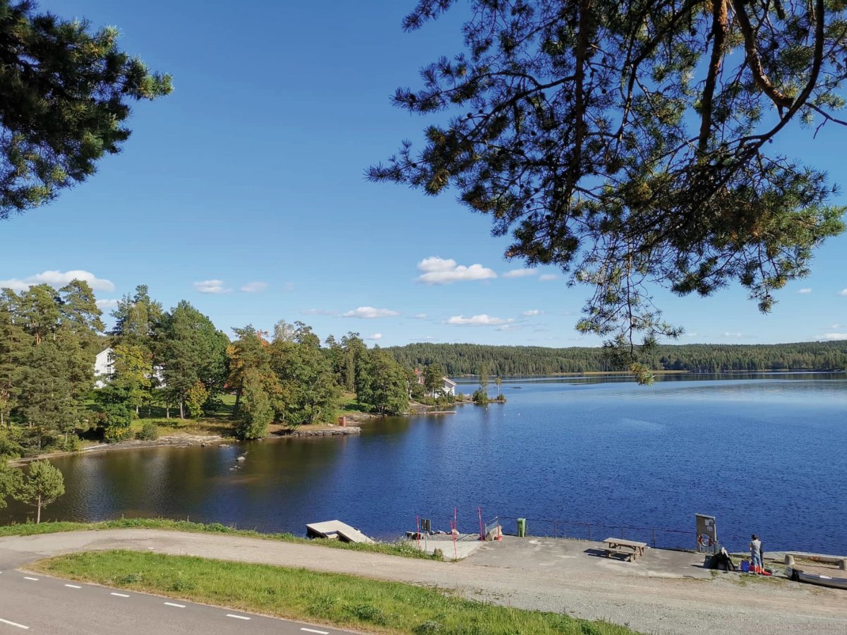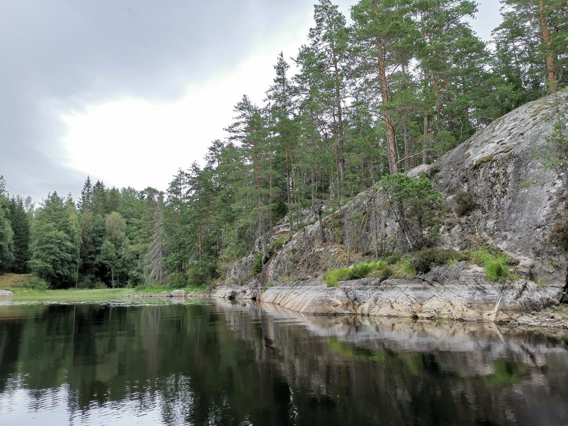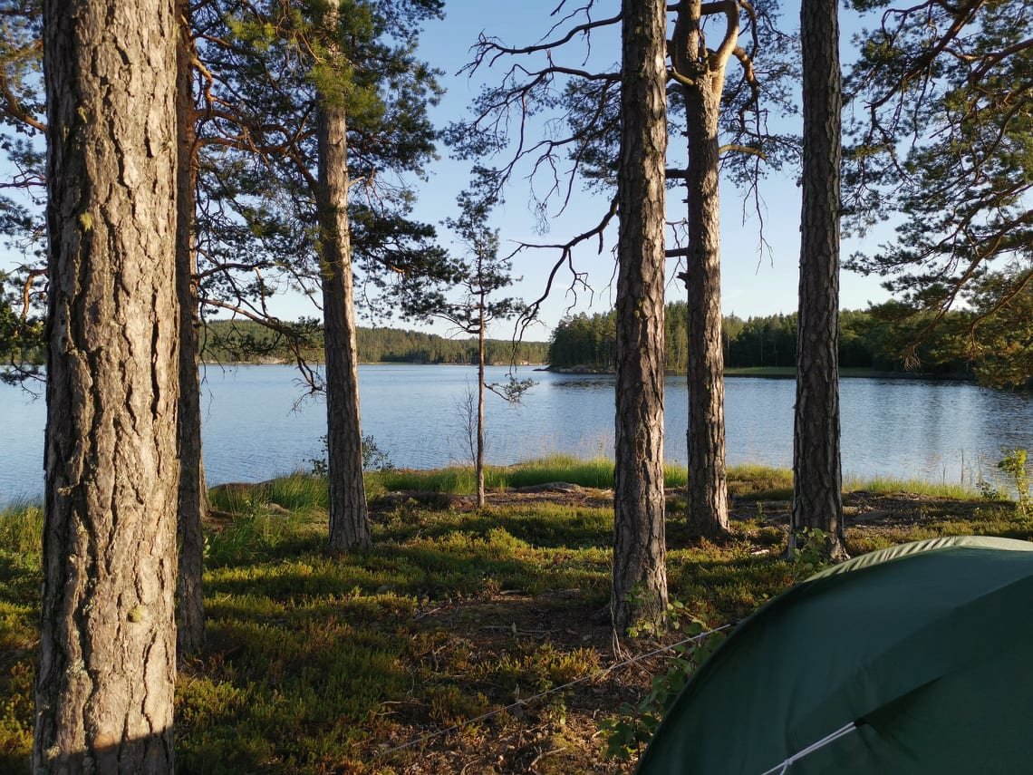 Die weitere Fahrt im Bus war vor allem davon geprägt, eine geeignete Schlafposition zu finden, um zumindest ein paar Stunden schlummern zu können. Dies gelang auch, wurde jedoch durch verschiedene Störungen unterbrochen. Darunter beispielsweise ein laut meckernder Scandi, weil die Bustoilette verstopft war und (nach seinen Aussagen) „der ganze Bus unter Wasser“ stand. Dies führte dazu, dass wir vor der zweiten Fährüberfahrt erst einmal ein wenig standen, um das Wasser wieder loszuwerden. Die „Frühstückspause“ an einer Tankstelle konnten wir leider nicht für ein Frühstück nutzen, da drei oder vier Busse gleichzeitig ankamen, sodass die Schlange viel zu lang war, um noch etwas zu ergattern. Zudem begrüßte Schweden uns mit Kälte, sodass ich froh war, als es endlich weiterging. Am Lager Höglund angekommen, mussten wir erst ein wenig warten, bis unsere Hütte am See fertig war. Dann wurde uns diese gezeigt, wir bekamen die Essenstonne und die Ausrüstung und nachdem wir uns ein wenig eingerichtet hatten, genossen wir zuallererst ein gemütliches Frühstück auf unserer kleinen Terrasse. Nachdem wir den ersten Tag damit verbrachten, uns an das Kanu zu gewöhnen und die Gegend ein wenig zu erkunden, war das Ziel des nächsten Tages, nach Norwegen zu reisen. Wenn man schon mal die Gelegenheit hat, sich an einem Tag in zwei unterschiedlichen Ländern aufzuhalten, möchte man das schließlich auch nutzen. Die Fahrt war lang (vor allem weil wir am Abend wieder an der Hütte ankommen wollten), aber definitiv lohnenswert. Zudem konnten wir einige Wanzen vorm Ertrinken retten und fanden eine „Heidelbeerinsel“, die uns leckere Heidelbeerpfannkuchen bescherte. Für die darauffolgenden Tage, sprich Montag und Dienstag, hatten wir Größeres vor: Es sollte eine längere Tour werden mit Übernachtung im Zelt oder Dano-Unterstand. Wir besorgten uns also für zwei Nächte eine Nature Card im Camp und fuhren los. Die Flötefjorden sollten es werden. Dort wollten wir am liebsten eine der vielen Danos nutzen, um zu übernachten und natürlich die Gegend erkunden. Mein Freund hatte, obwohl dies bereits von mehreren Quellen widerlegt wurde, weiterhin die Hoffnung, dass wir irgendwo dort einen Wasserfall sehen, sodass wir jeden möglichen Winkel erkunden wollten. Nach einer langen Fahrt und einer ewigen Sucherei nach einer Dano, mussten wir uns leider damit abfinden, kein Stockbrot machen zu können und suchten uns einen Zeltplatz auf einer sehr kleinen und schnuckeligen Insel. Zunächst war noch nicht sicher, ob dies tatsächlich unser Schlafplatz wird, doch nachdem eine der Taschen samt Wechselunterwäsche Lust hatte, baden zu gehen (war ja auch sehr heiß, daher taten wir es ihr wenig später gleich), ließen wir uns dort nieder und nutzten die Ausrüstung, um uns eine Wäscheleine zu bauen. Die Nacht war kalt, sodass so manche Schlafsackwahl noch einmal überdacht wurde und zukünftig der Zwiebellook herhalten musste. Am nächsten Tag ging die Suche nach Wasserfällen weiter, führte uns allerdings nur zu unerwarteten Umtragestellen, fast ausgetrockneten Flüssen und anderen Sackgassen. Die Flüsse waren zwar sehr idyllisch und voller Fische, Libellen, Enten und Seerosen, brachten uns aber nicht weiter.