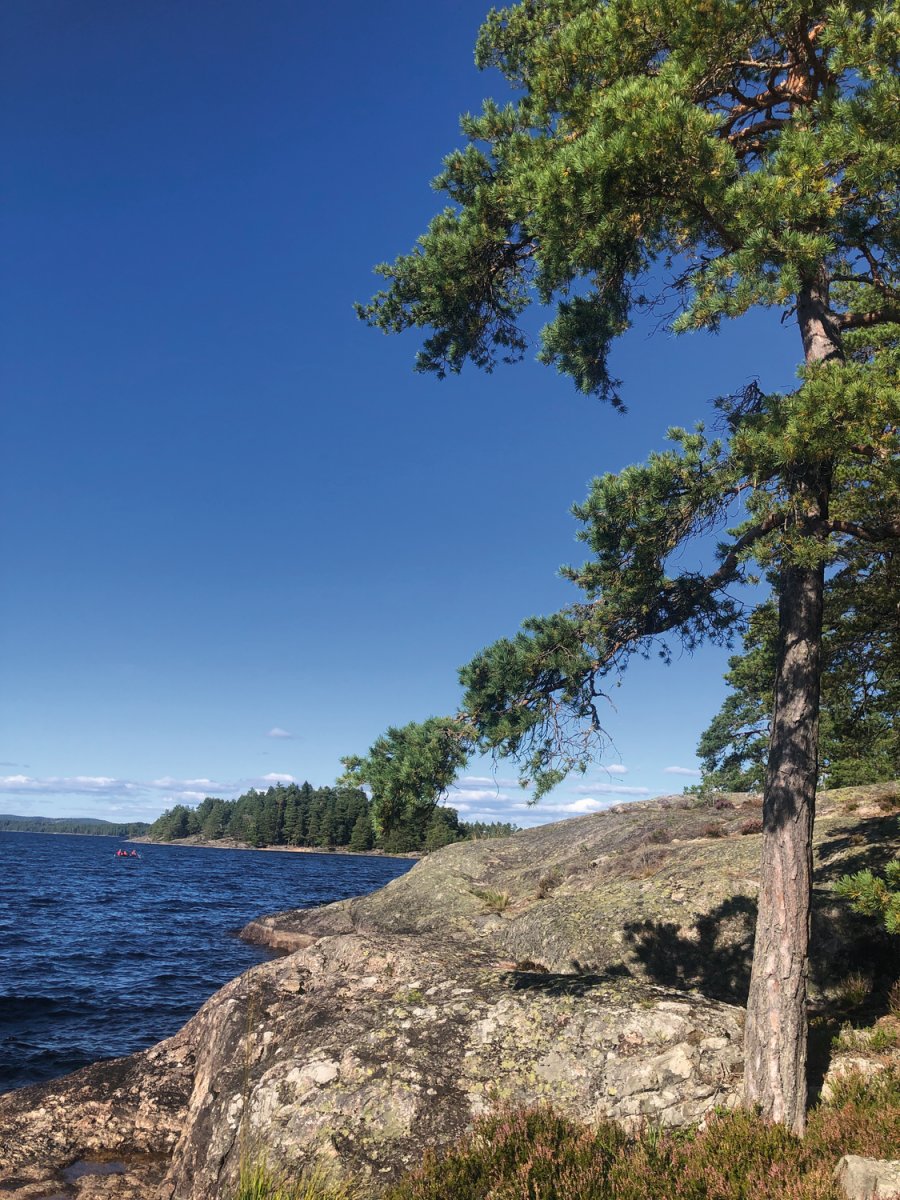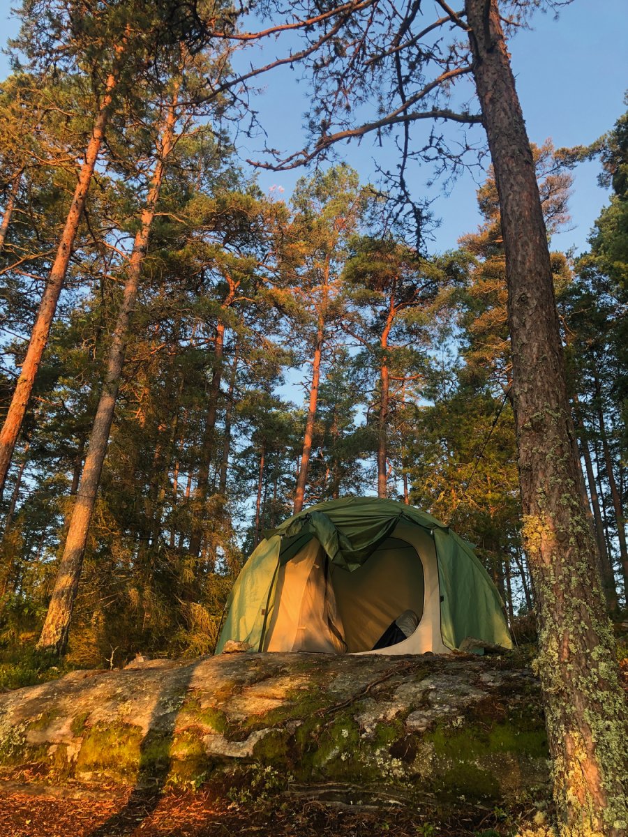 Am 4. Tag, dem 3. September, gönnten wir uns ein ausgiebiges Ausschlafen und freuten uns, als wir aufwachten und der Regen endlich nachgelassen hatte. Nach einem gemütlichen Frühstück verstauten wir unser Lager und machten uns auf den Weg. Etwa eine Stunde später erreichten wir die Insel Langöärna, wo wir als erstes eine Wäscheleine spannten, um unsere nassen Klamotten in der warmen Sonne zu trocknen.