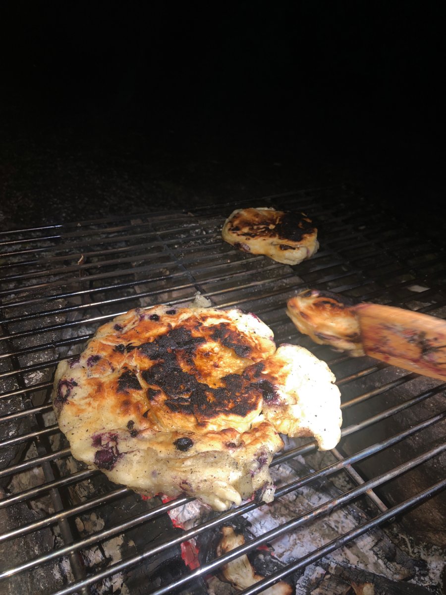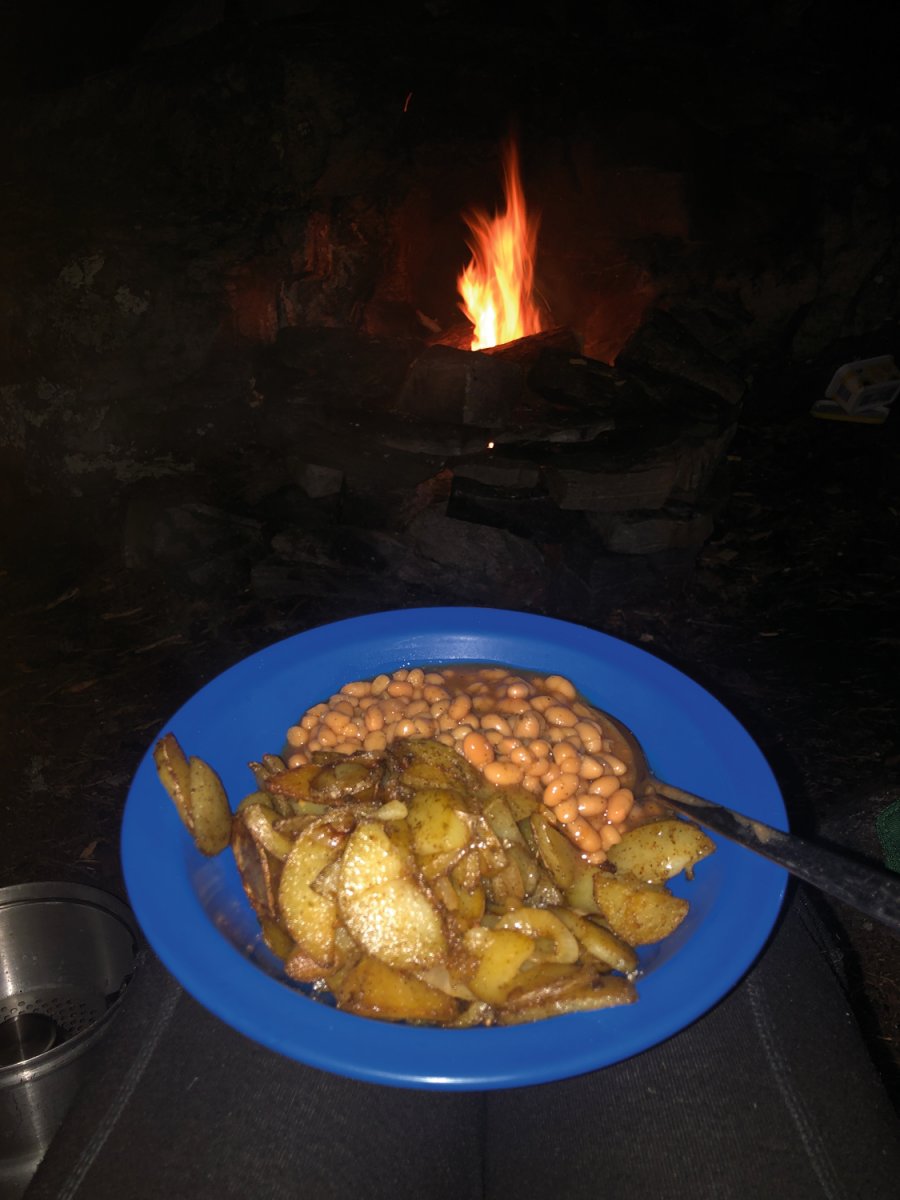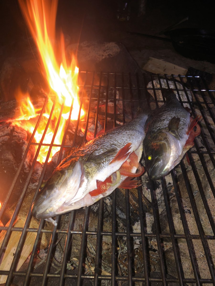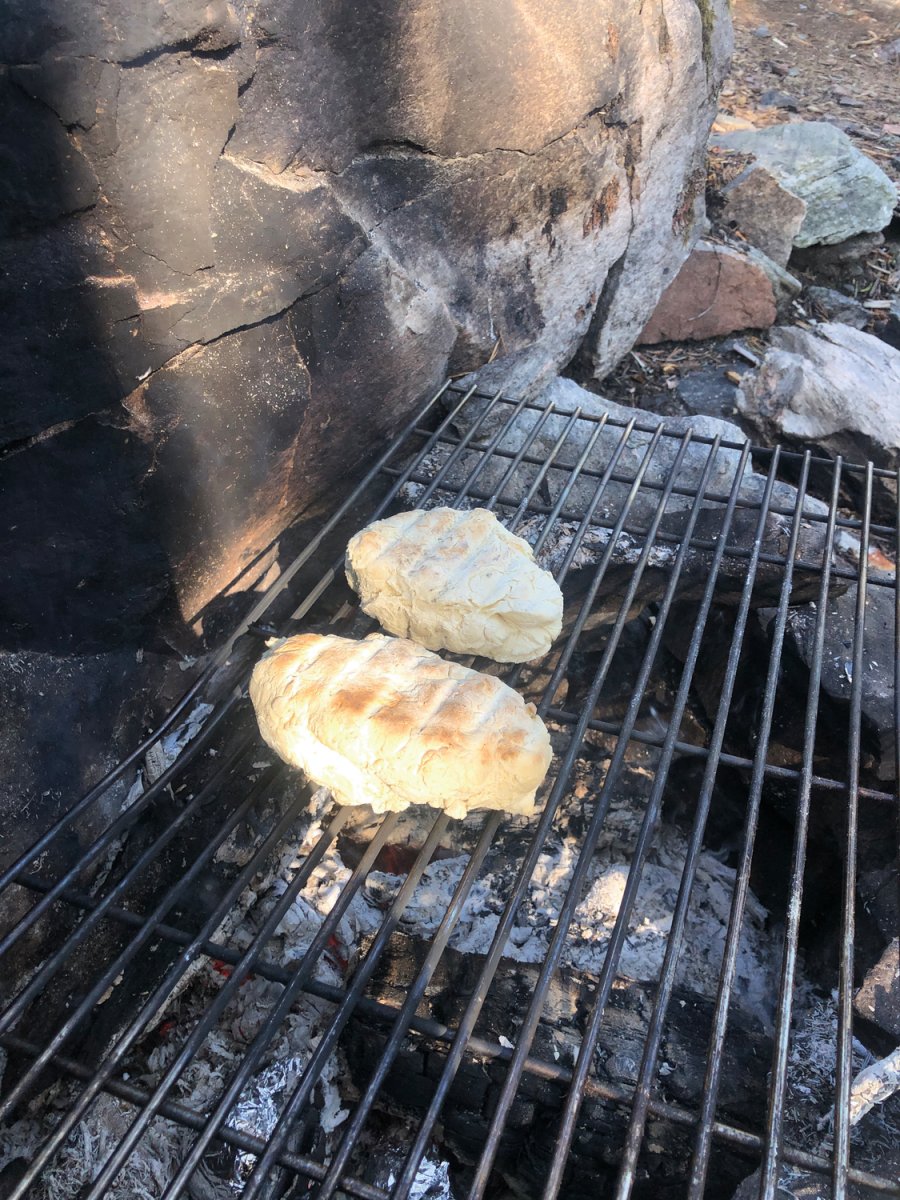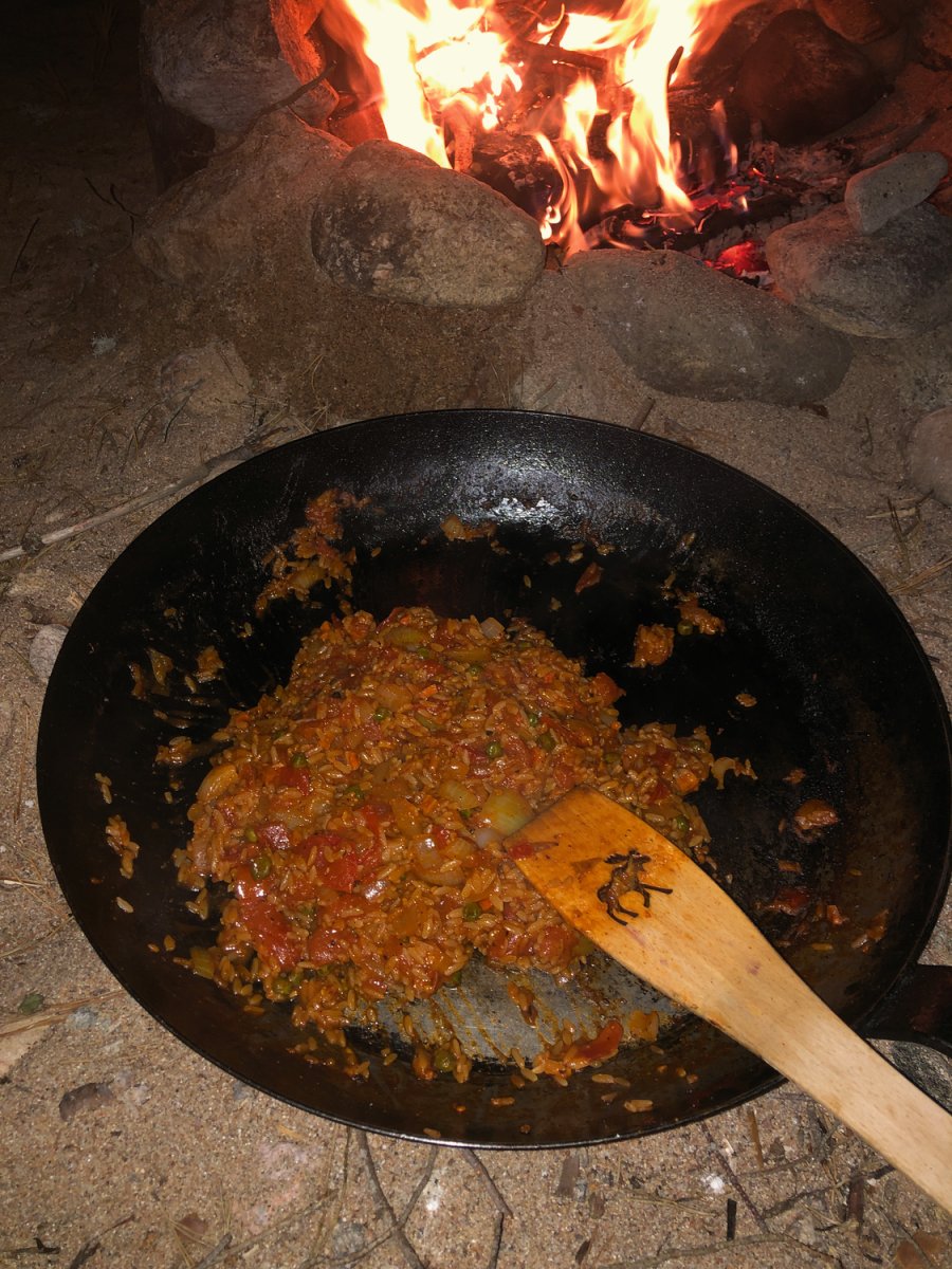 Am Abend, während der Himmel in leuchtenden Farben erglühte, warfen wir unsere Angel aus, jedoch erneut ohne Erfolg. Doch das machte nichts, denn wir hatten einen Plan B: Aus dem restlichen Mehl und Trockenhefe bereiteten wir eine Pizza zu. Den Teig legten wir auf das Rost, belegten ihn mit Käse, Kartoffeln und Zwiebeln und bedeckten ihn mit einer großen Pfanne, die wir mit Kohle beschwerten. So backte die Pizza von beiden Seiten und wurde in kürzester Zeit perfekt.