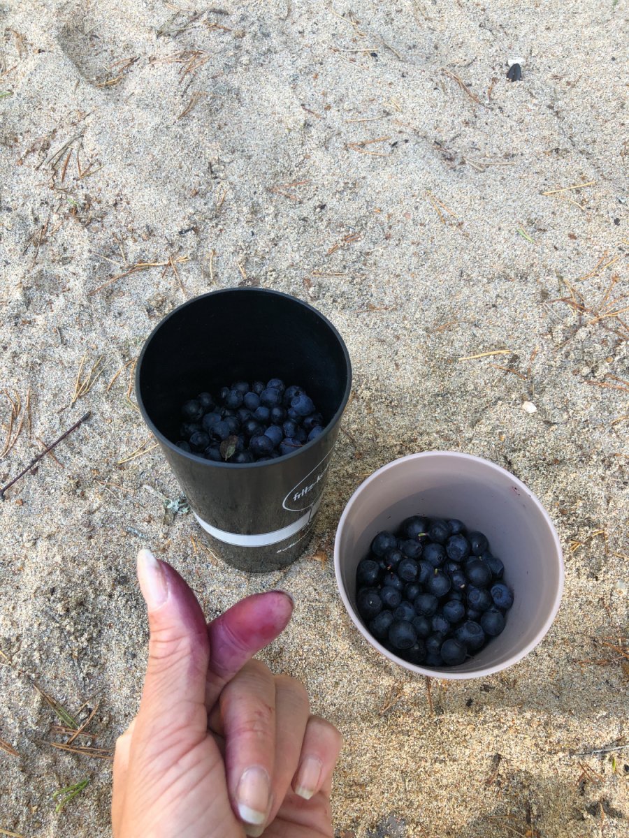 Während Leon in den Wäldern verschwand, um Feuerholz zu sammeln, streifte ich mit einem Becher in der Hand durch das Blaubeerfeld, die Finger schnell gefärbt von den kleinen, köstlichen Früchten. Das Sammeln wurde zu einer meditativen Tätigkeit, und als ich schließlich zum Rastplatz zurückkehrte, war mein Herz so voller Freude wie mein Becher mit Blaubeeren. Gemeinsam bereiteten wir das Abendessen vor – Gemüsereis mit veganem Hackfleisch – und krönten das Mahl mit einem Dessert, das wie aus einer Märchenwelt stammte: Blaubeer-Stockbrot.