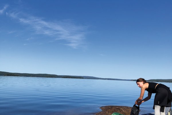 Am Morgen des 1. September begrüßte uns die Sonne, und wir frühstückten die Reste des Stockbrots mit Nutella und Marmelade. Gestärkt brachen wir unser Lager ab und paddelten los. Auf halber Strecke entdeckten wir eine kleine Insel mit steinernen Ufern und blühenden Blumen, wo wir eine Badepause einlegten. Das Wasser war kalt, aber wunderschön klar, und nach dem Schwimmen wärmten wir uns auf den sonnengeheizten Steinen.