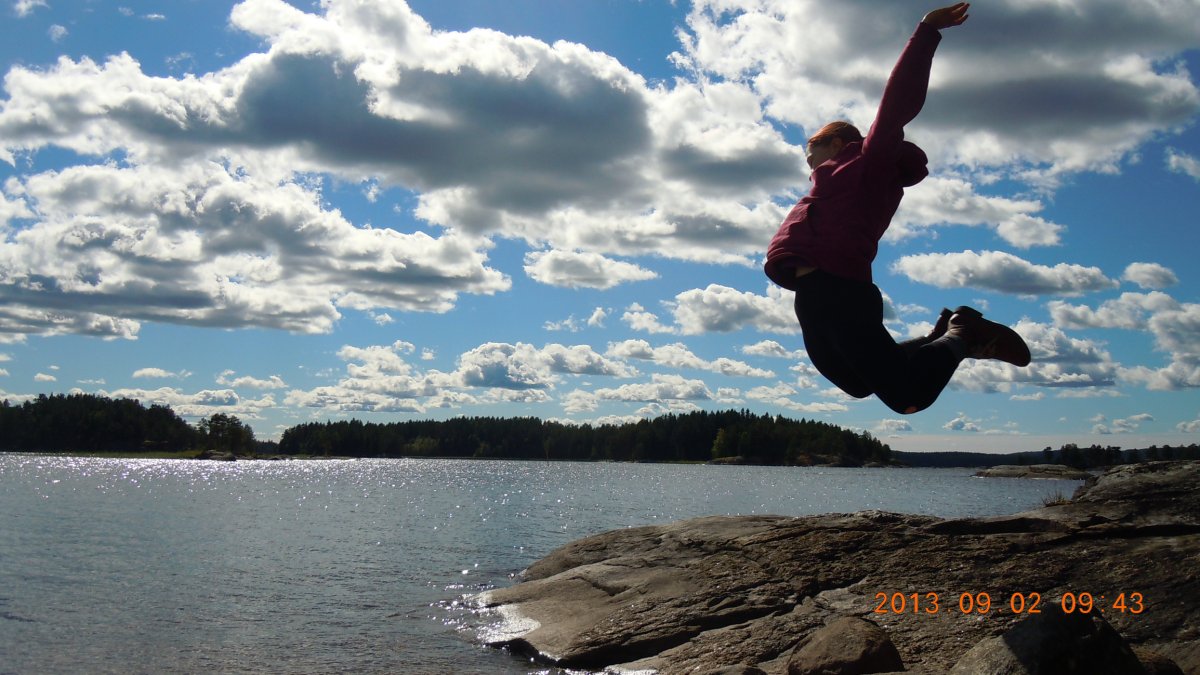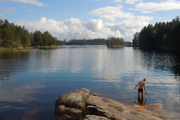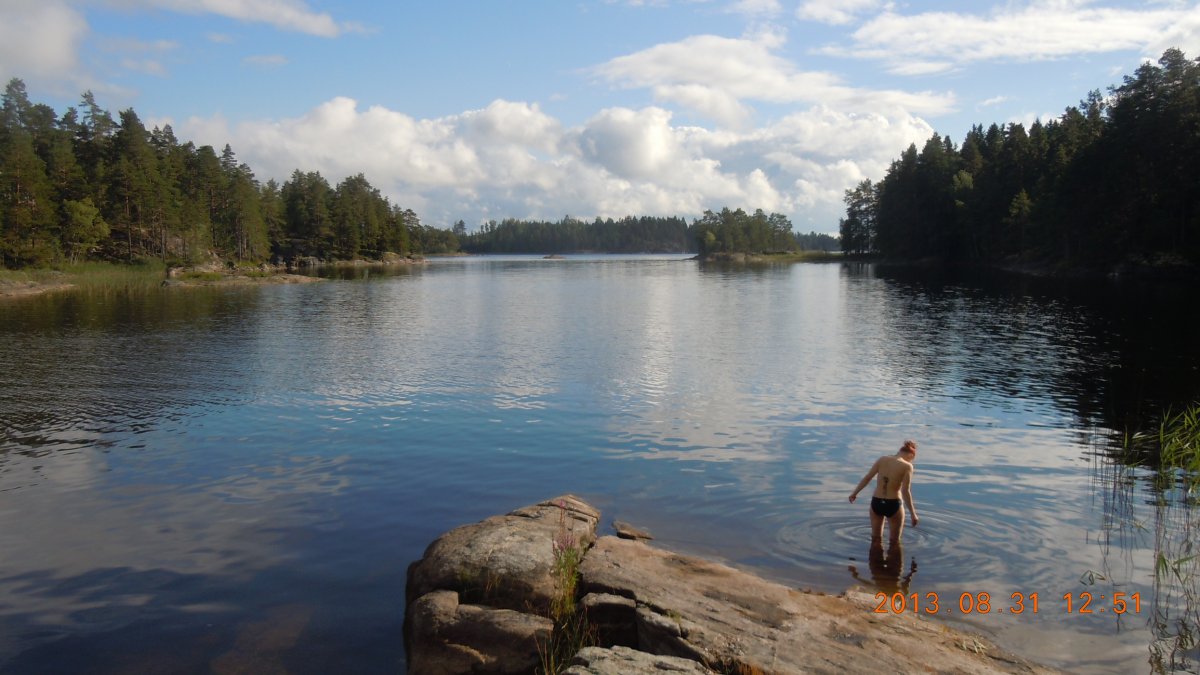 Morgens ging es los mit Pancakes. Die ersten paar waren noch ganz gut, doch dann wurde es einfach nichts mehr und auch das Preiselbeergelee was wir selber machten, schmeckte irgendwie komisch. Das haben wir also sein gelassen und stattdessen lieber schnell Brot gegessen, damit wir noch halbwegs schnell loskamen, mittlerweile war es nämlich schon Mittag. Bevor wir dann die Insel endgültig verlassen haben, bin ich nochmal kurz schwimmen gegangen. Das Wasser war zwar furchtbar kalt, aber einmal musste das einfach sein! Ich bin sogar ungefähr 4 Meter weit rausgeschwommen und danach war die Luft sehr angenehm warm…