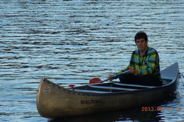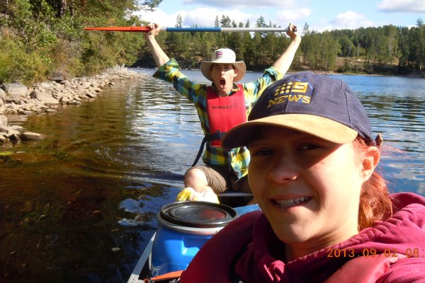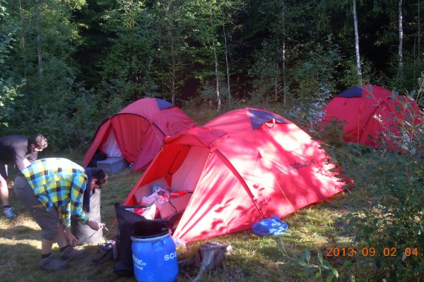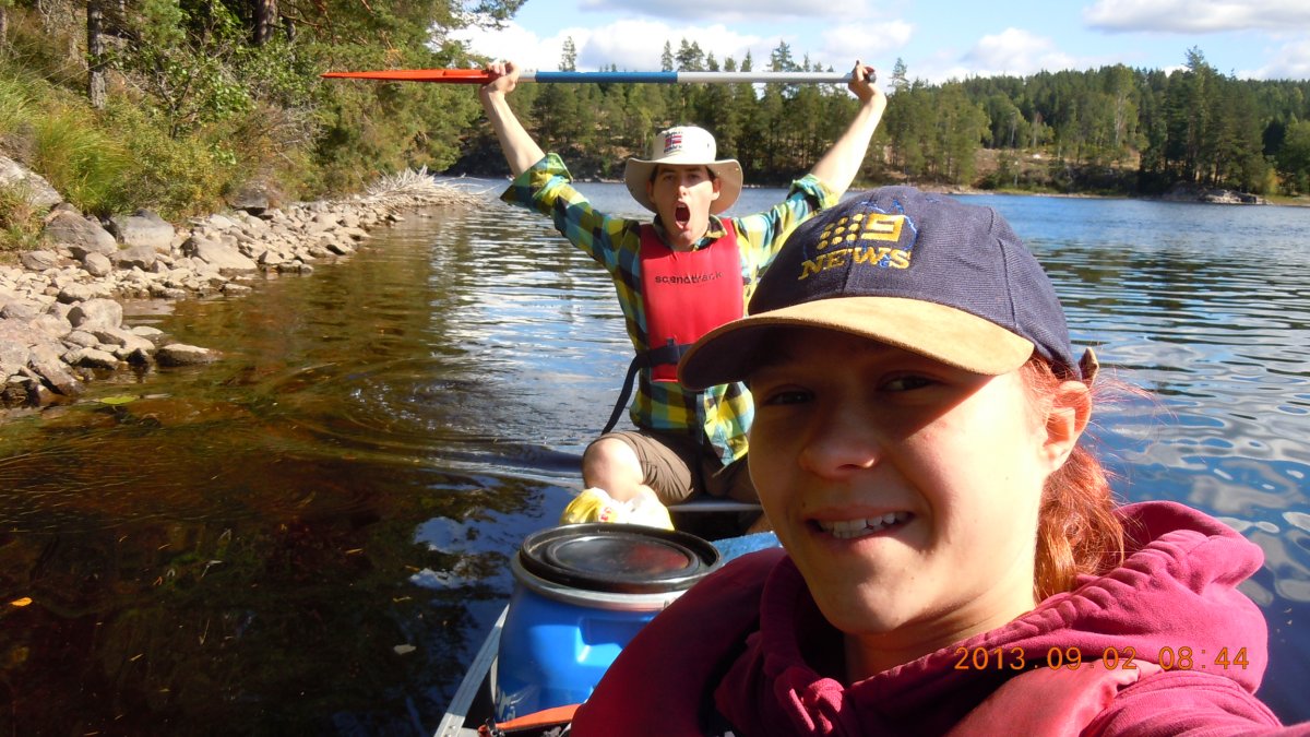 Wir hatten schon die Tage vorher eine Liste gemacht und alles was nur irgendwie mit auf die Tour kommen könnte in einer Kiste gesammelt um auch wirklich nichts zu vergessen. Eine ganze Woche war schließlich das längste was wir beide bisher komplett Outdoor zu leben gedachten. Da musste die Ausrüstung perfekt sein. Am Vormittag packten wir dann die Rucksäcke und die letzten Vorbereitungen wurden getroffen, Proviant für die Fahrt war in Massen vorhanden und eigentlich war alles bereit. Abends gegen 22 Uhr wurden wir von Tajo’s lieben Eltern nach Puttgarden gebracht von wo aus wir den Bus von scandtrack bestiegen, welcher uns dann nach Lennartsfort brachte. Die Fahrt mit dem Bus war entspannt und ich für meinen Teil konnte recht angenehm auf Tajo’s Schoß schlafen. Die Busfahrer erlaubten nur kurze Pausen, aber schließlich wollten auch alle schnell ankommen, die Kanus in Empfang nehmen und loslegen. So war es dann auch. Gegen mittag, nach einem kurzen Snack schleppten wir unsere Rucksäcke zum Basiscamp nahe der Einstiegsstelle. Dort haben wir dann endlich unsere Ausrüstung erhalten, auf die wir vorher schon ziemlich gespannt waren. In der Kiste und der großen Futtertonne war wirklich alles Erdenkliche drin, was man für ein Überleben in der Wildnis nur brauchen kann. Nachdem wir dann alles nach und nach in den wasserdichten Packsäcken verstaut hatten, mussten wir nun noch alles mit einem kleinen Fußmarsch direkt zur Einstiegstelle bringen. Dort haben wir dann eine kurze Einweisung erhalten. Das wichtigste, was Tajo wohl nie wieder vergessen wird, sind der C und der J-Schlag. Damit ist es hauptsächlich dem hinteren Fahrer möglich das Kanu zu steuern. Diese Steuerschläge können jedoch je nach Wind- und Wetterlage recht anstrengend sein ;)