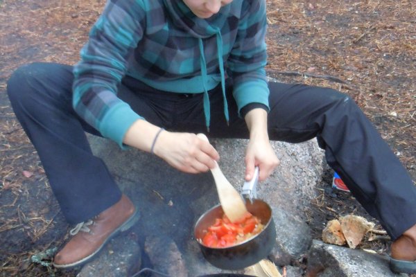 Schließlich kamen wir dann am Rastplatz 35 an. Hier gab es zwar auch keine Schutzhütte, aber eine große Feuerstelle und einen ziemlich coolen Felsen, der einen tollen Ausblick lieferte. Wir spannten unsere Plane hinter der Feuerstelle auf um uns einen Windschutz zu bauen. Dann bauten wir das Zelt auf und versuchten Feuer zu machen. Wir waren noch nicht lange dabei, da bekamen wir Besuch von zwei Jungs. Kurz nach den beiden kam noch ein Pärchen und mit tatkräftiger Hilfe der anderen hatten wir dann ein richtig großes Feuer. Auf dem haben wir dann auch gekocht, es gab lustiger weise bei allen fast dasselbe. Zumindest verwendeten alle ziemlich genau dieselben Zutaten. Bei uns gab es Bratkartoffeln, doch aus den gleichen Zutaten (Speck, Zwiebeln, Kartoffeln) machten die anderen einen Eintopf. Das wäre vielleicht auch für uns die bessere Wahl gewesen, denn in der kleinen Pfanne kriegten wir unsere Kartoffeln einfach nicht cross… aber wir haben an diesem Abend gemerkt, dass Outdoor eigentlich alles schmeckt, hauptsache es ist warm und es hat wirklich geschmeckt. Dann saßen wir abends noch am Feuer und philosophierten über Gott und die Welt. Passenderweise saß ein Philosophie-Student unter uns, sodass wenigstens einer ein bisschen mehr als nur Halbwissen präsentieren konnte… Es war ein ziemlich gemütliches Zusammensitzen!