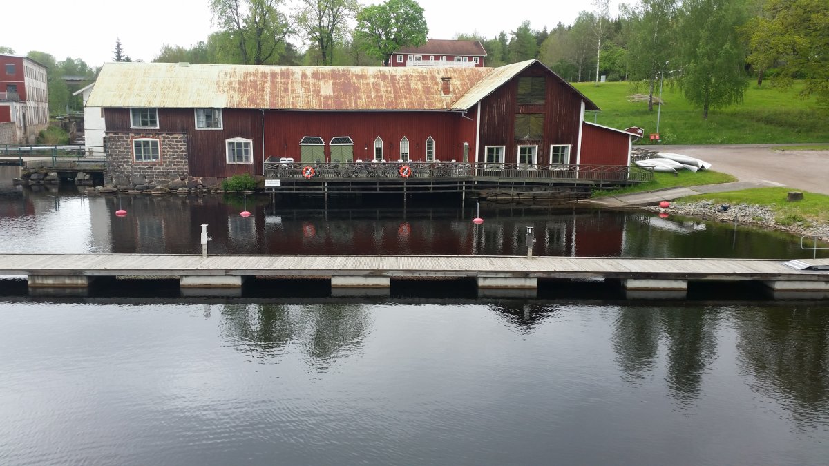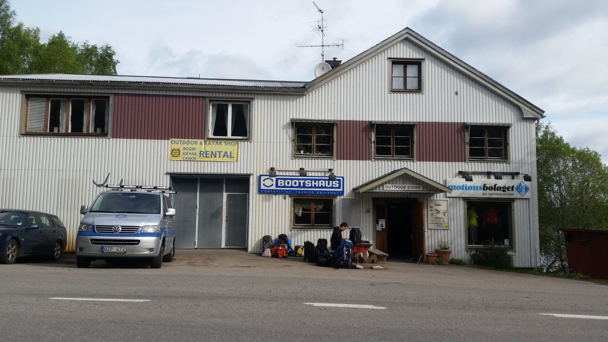 Der Morgen begrüßte uns mit wolkenverhangenem Himmel und stärkerem Wind. Auch war nach einiger Zeit Donnergrollen zu vernehmen. So packten wir schnell alles zusammen, um möglichst vor einem Gewitter noch trocken nach Gustavsfors zu gelangen, was der nächste Zielpunkt unserer Reise war. So war unser Plan, der leider nicht ganz aufging. Auf dem Wasser erwischte es uns dann doch. Heftiger Regen setzte ein und auch das Gewitter war im Anmarsch. Das war schon ein mulmiges und vor allem nasses Gefühl. Als wir dann den Lelång auf dem Kanal in Richtung Gustavsfors verlassen hatten, erblickten wir am linke Ufer die Rettung für uns zwei patschnasse Wasserratten. Der Himmel schenkte uns unsere Mitreisenden, die dort an einem gemütlichen Lagerfeuer unter einer Plane saßen und uns zuwinkten! Die Einladung nahmen wir natürlich dankend an und so verbrachten wir dann lange Zeit gemeinsam am Feuer, darauf wartend, dass Gewitter und Regen endlich aufhören mögen. Zwischenzeitlich gesellten sich noch vier weitere Paddler zu uns, die auf einem Floß unterwegs und genauso durchnässt wie wir waren. Im Verlaufe des Nachmittages hatte der Wettergott endlich ein Einsehen und ließ die Sonne wieder scheinen und uns gen Gustavsfors paddeln. Dort wollten wir uns ein Zimmer in einem kleinen Hotel suchen, damit unsere Sachen und auch wir trocknen konnten. Auf eine Nacht im Zelt hatten wir gerade mal keine Lust mehr! Obwohl offiziell erst in der Woche darauf geöffnet, hatte Jimmi, der Wirt vom Sjömagasin in Gustavsfors, Mitleid mit uns und wir erfreuten uns einer angenehmen und vor allem trockenen Nacht im kleinen und gemütlichen Hotel.