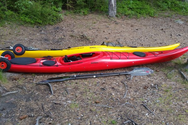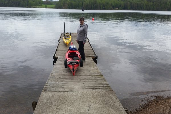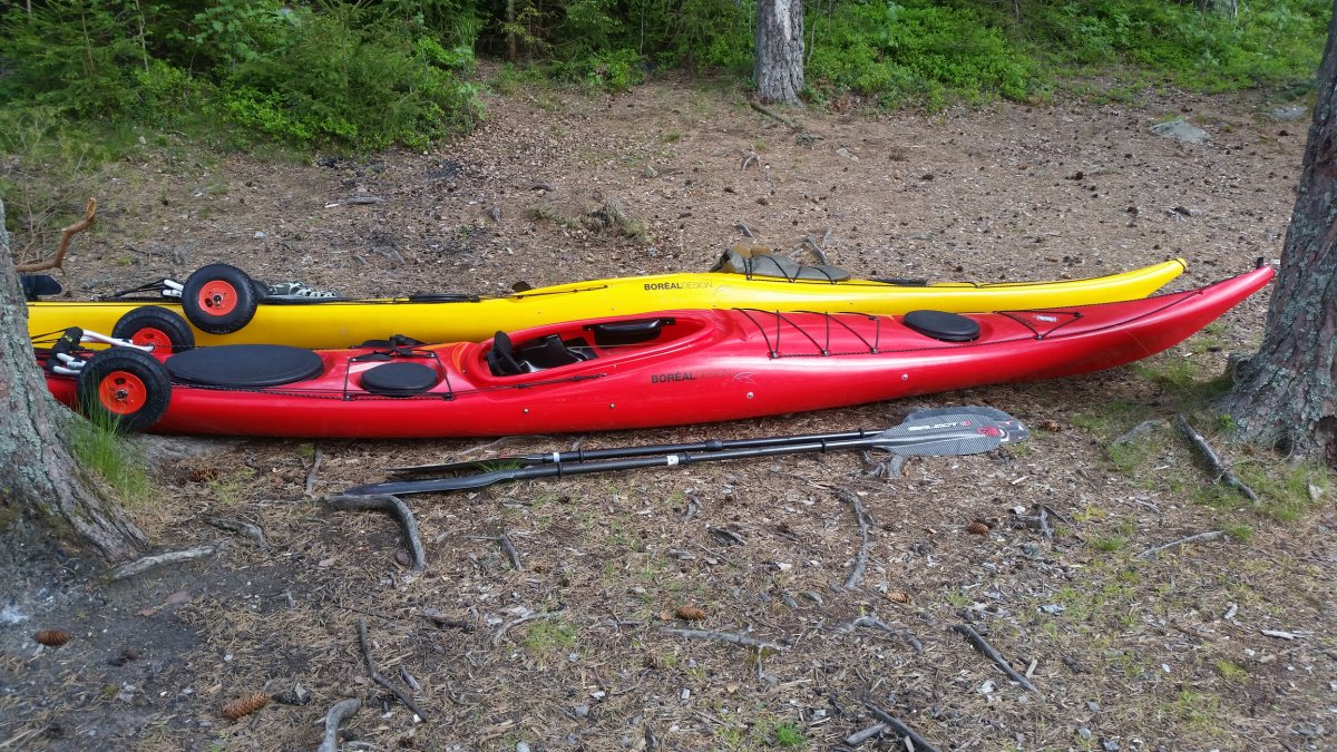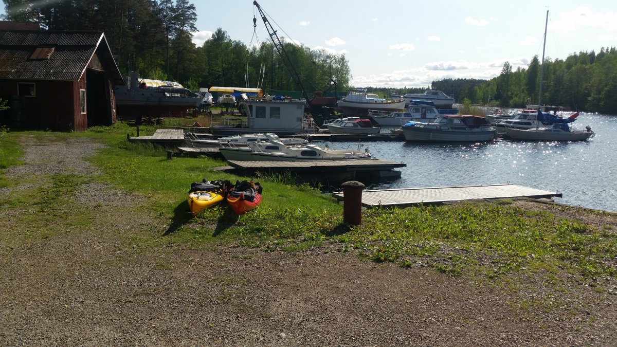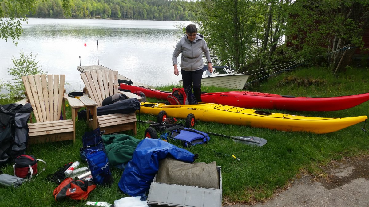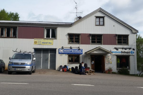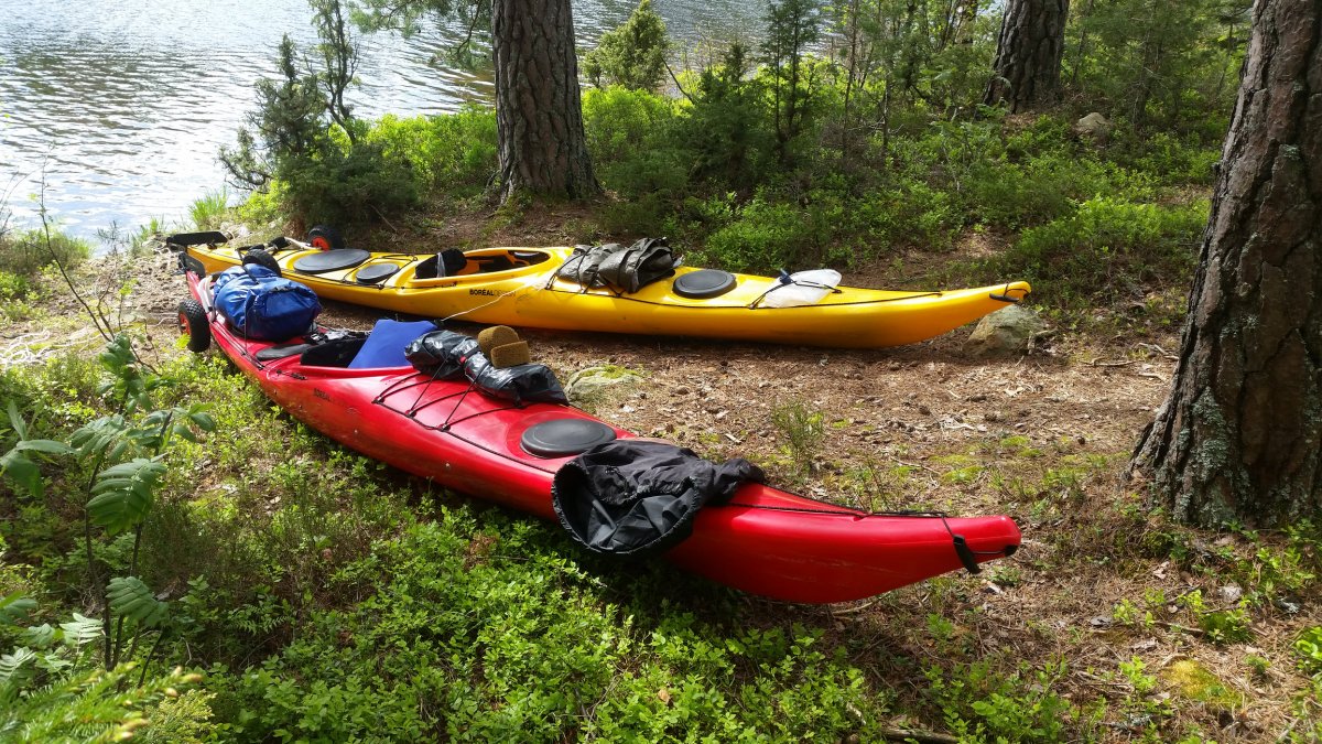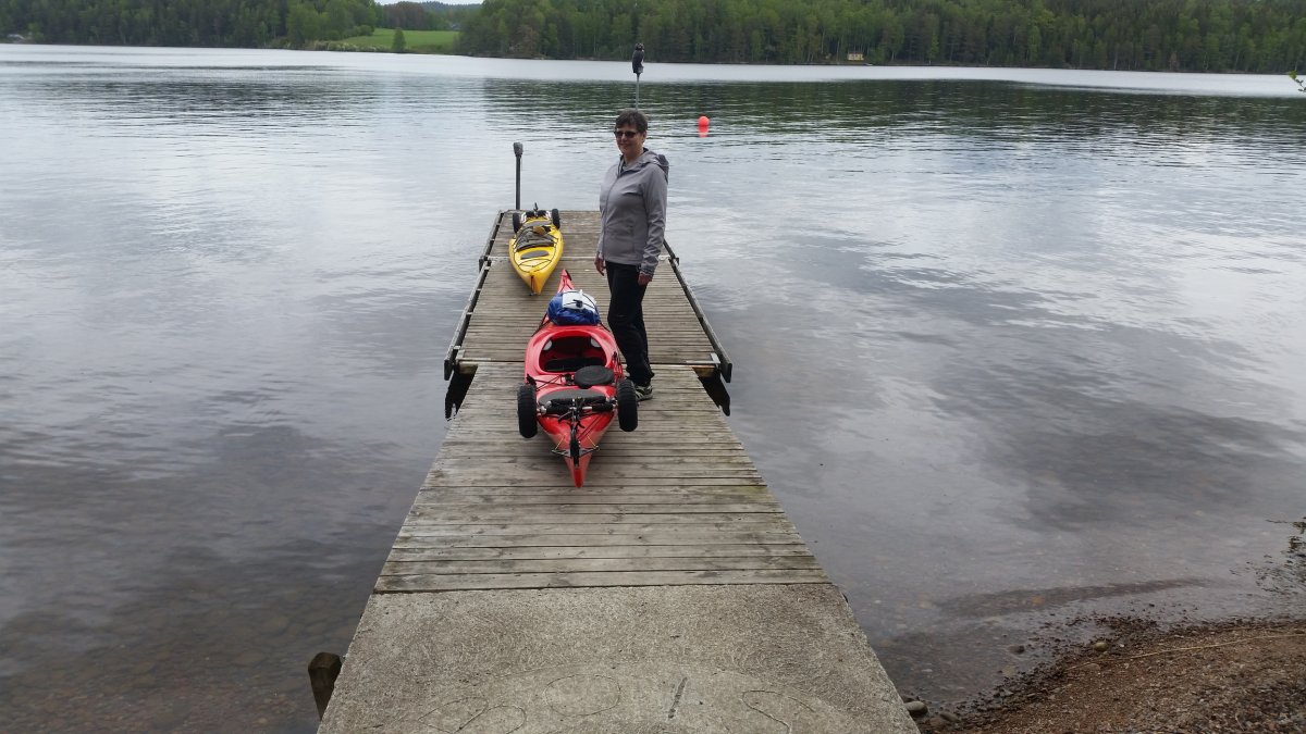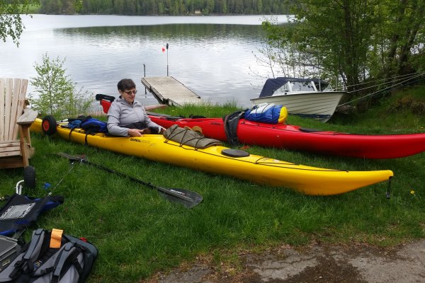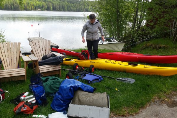Nach einer langen Busfahrt hatten wir am frühen Vormittag unser Ziel und den Startpunkt unserer Tour erreicht - das Bootshaus in Bengtsfors im schwedischen Dalsland am See Lelång. Mit uns zusammen hatten sich noch vier andere Mitreisende für die Kajaktour entschieden und so begaben wir uns unter kompetenter und freundlicher Mithilfe des Inhabers des Bootshauses daran, die Boote vollzupacken und startklar zu machen. Der Stauraum in den Booten war allerdings begrenzt und so übten wir uns in der Kunst des Weglassens, was mehr oder weniger gelang; ich hätte das zweite Paar Schuhe doch mit einpacken sollen, um so wenigstens ein Paar trockene zu haben. Unter tatkräftiger Mithilfe unserer Mitreisenden saßen wir letztendlich in unseren Kajaks und das auf dem Wasser und nicht im Wasser. Somit alles trocken geblieben und es konnte endlich losgehen. Und hurra, wir waren die ersten auf dem Wasser bei der ersten Kajaktour von scandrack!
