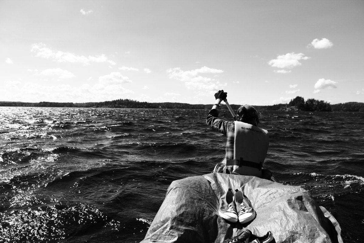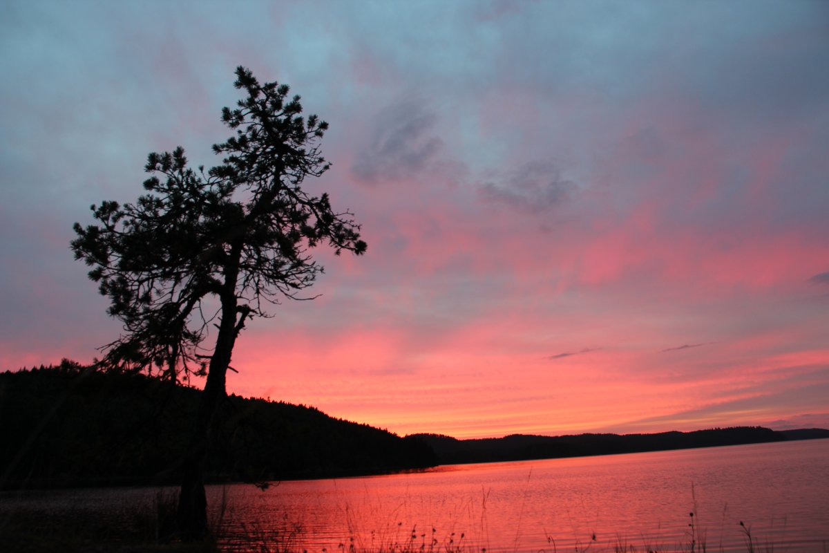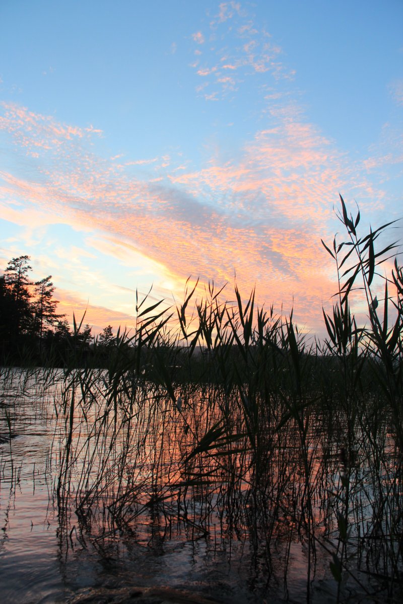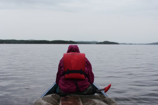 Ausgeschlafen gab es Milchpulver-Müsli und anschließend haben wir das Kanu beladen. Nach dem ersten Kilometer wurde der Wind stärker und der Wiederstand beim Paddeln immer größer. Das Kanu wurde von den Wellen am Bug angehoben und schlug dann mit voller Wucht wieder auf, dabei spritzte das Wasser jedes Mal in das Kanu und über uns. Natürlich hätten wir auch abwarten können, aber die Herausforderung und das wilde Wasser gaben ein geniales Abenteuer-Feeling. Nach 8 Stunden Gegenwind fanden wir die nächste einsame Insel. Eine Stunde nach der Ankunft legte sich der Wind und es gab eine herrliche Abendstimmung. Ab ins Wasser! Erfrischend und Glasklar, es war genial zu schwimmen. Nach dem Essen (Salzkartoffeln mit Speck und Backed-Beans) ging es dann schnell ins Zelt.