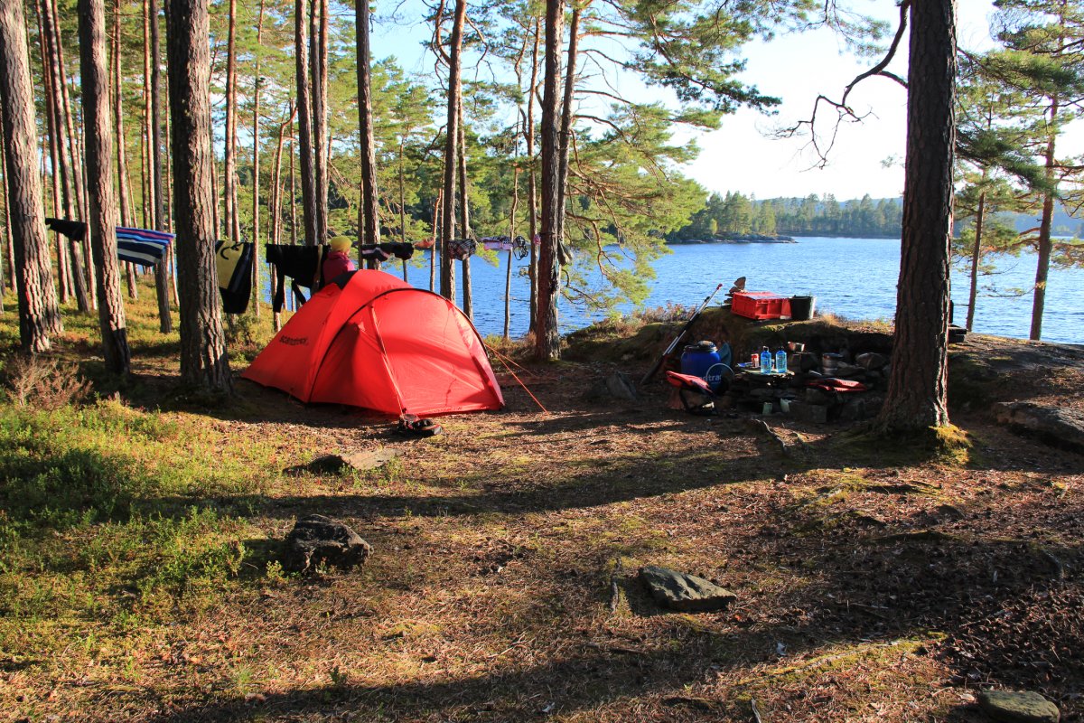 Samstags Mittag kamen wir im Scandtrack-Basiscamp an und bekamen ein sehr reichhaltiges Mittagessen, ein Miniwürstchen im Brötchen, Hotdog genannt. Durch einen Begrüßungsflyer mit Programm und einer kurzen Einweisung, erhielten wir alle Informationen für den Aufbruch. Nachdem wir unsere Ausrüstung und das Lebensmittelpaket erhalten hatten, fingen wir an unser Gepäck in den Packsäcken zu verstauen und das Kanu zu beladen. Da wir bereits Erfahrung beim Paddeln hatten ging es recht zügig vom Basiscamp Richtung Stora Le. Etwas geschockt von den zahlreichen Anreisenden wollten wir uns etwas absetzen, was allerdings nicht notwendig war. Bereits nach wenigen Stunden ließ sich die Größe der Seen etwas abschätzen und die vielen Kanuten verteilen sich schnell in einem so großen Gebiet. So begegneten wir die ganze Woche nur wenigen. Die Orientierung via Karte war erst etwas problematisch da es bewölkt war und ich wir keinen Kompass hatten. Es klappte dann schließlich doch ganz gut, da es viele Inseln zur Orientierung gab.
