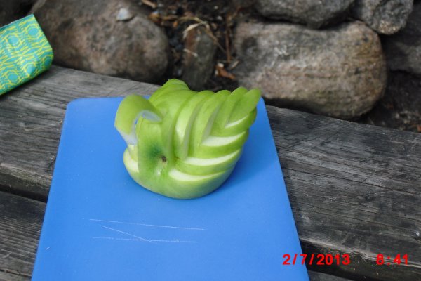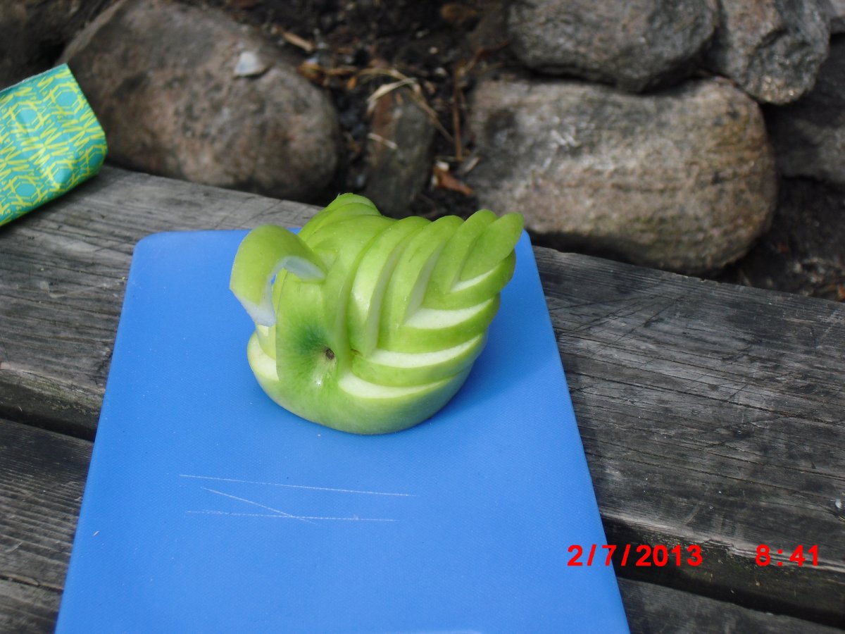 Am vierten Morgen wurden wir erneut von der Kreativität unseres Reiseleiters überrascht und ein „Apfelschwan“ begrüßte uns.