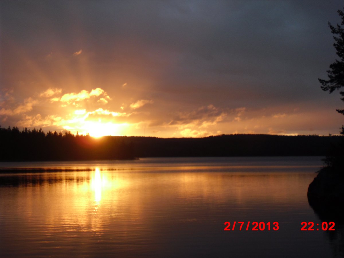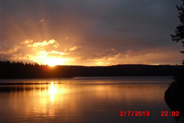 Nun ging es zurück zum Camp welches wir am frühen Nachmittag bei z.T. Regen erreichten. Aus unseren Vorräten aus dem Rucksack und den zurückgebliebenen Nahrungsmitteln wurde ein tolles Essen gezaubert. Danach wurden die Rucksäcke gegen wasserdichte Packsäcke getauscht, die Verpflegungstonnen für je drei Mahlzeiten/Tag bestückt und die Boote zu der Einsetzstelle gebracht. Aufgrund des hohen Wellengangs starteten wir erst gegen Abend zu unserem ersten Paddelziel. Unsere Füße konnten sich jetzt ausruhen. An diesem Abend wurden wir mit einem Traumsonnenuntergang für die Strapazen belohnt.