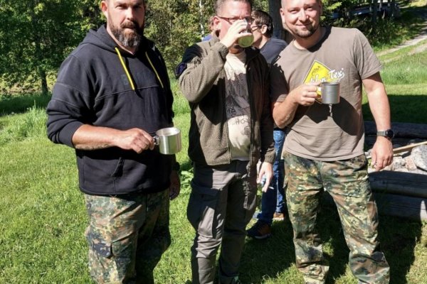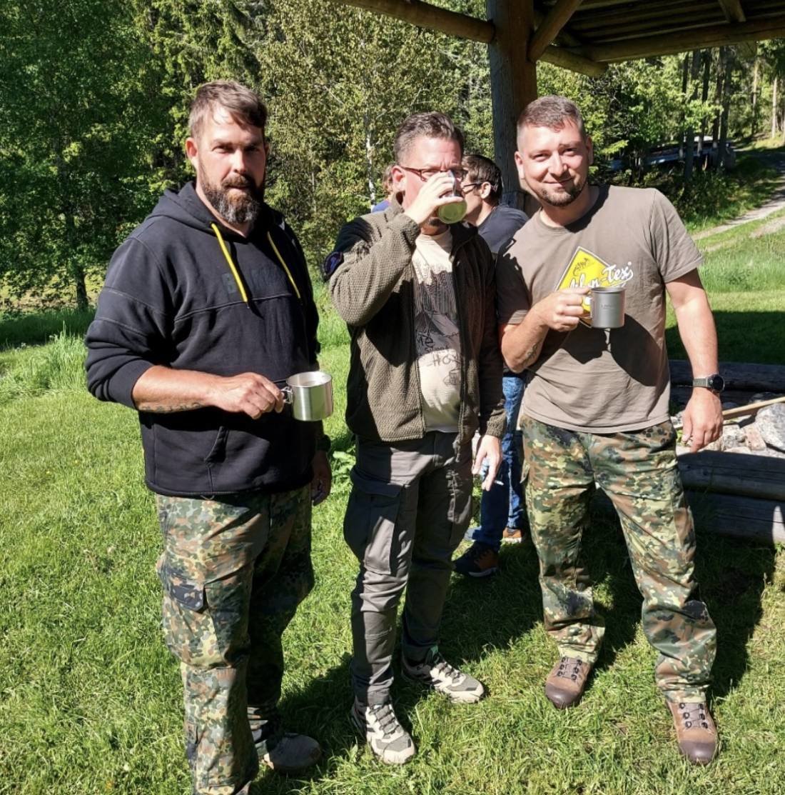 Dort angekommen richteten wir unser Lager ein. Dies bedeutete Feuerholz suchen, sägen und spalten. Schlafgelegenheiten einrichten, Angeln aufbauen etc. Danach wurde erstmal die Essenstonne ausgeräumt um zu schauen was wir so alles Tolles haben. Lasst euch eins sagen: Es ist reichlich und definitiv ausreichend was alles in der Essentonne vorhanden ist. Auch ist für jeden Geschmack etwas dabei und mit dem Outdoor-Kochbuch, welches extra auf Zutaten aus der Tonne abgestimmt ist, sind auch genug Rezeptideen vorhanden, welche jeder (wirklich jeder) nachkochen kann. So gab es bei uns am ersten Abend die Terence Hill Pfanne.
