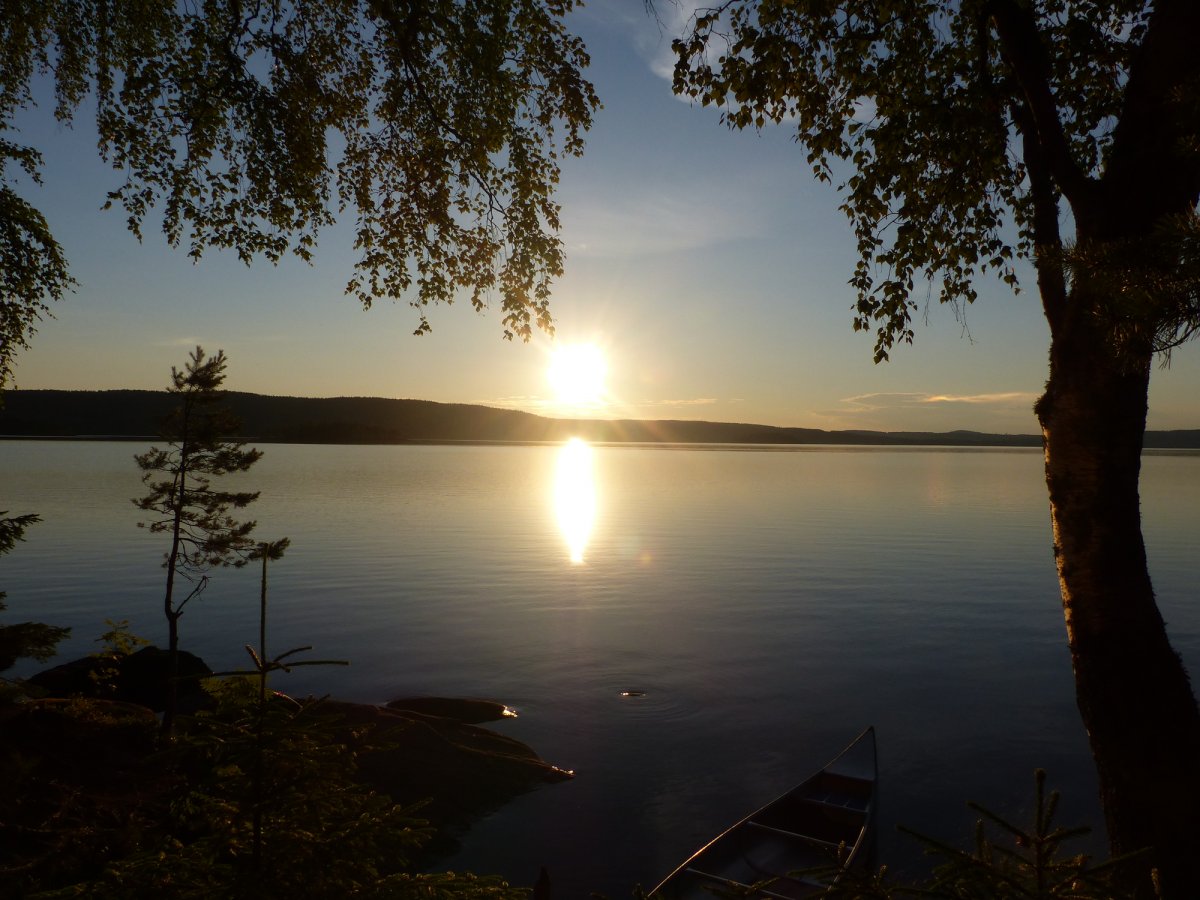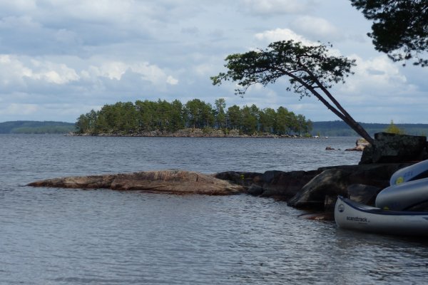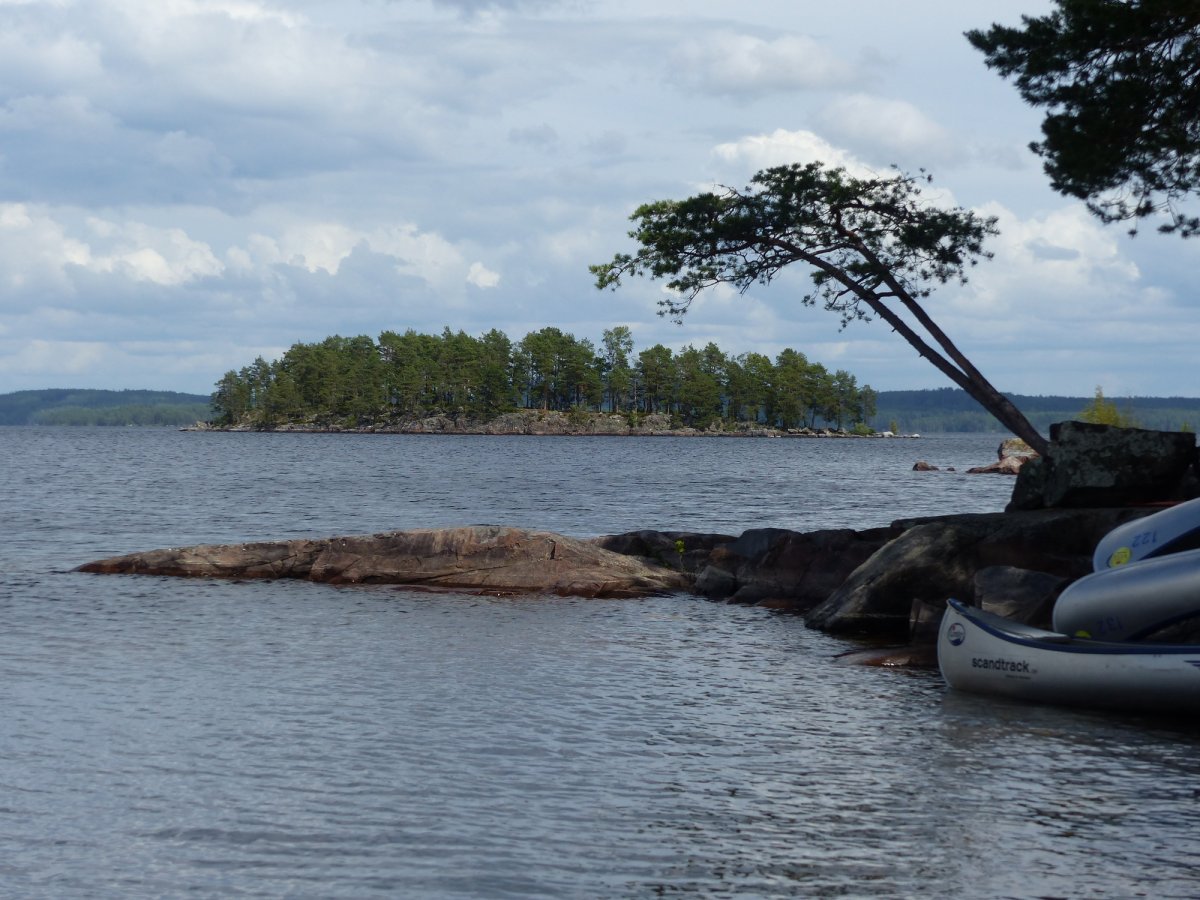 Dort angekommen mussten wir dann noch bis 12 Uhr warten bis der nächste Bus uns zum Camp in Glaskogen brachte. Dort nahmen wir unsere Ausrüstung und die Boote entgegen, packten alles zusammen und machten uns mit guten Gegenwind und Wellen auf zu unserem ersten Rastplatz 24. Hier gab es einen kleinen Flusslauf der aber nicht floss sonder überwiegend aus kleineren Pfützen bestand wodurch an diesem Platz sehr viele Mücken vorhanden waren. Nach unserer ersten Nacht in der grandiosen Natur ging es dann nach dem Frühstück weiter zum Platz 26. Natürlich wieder mit Gegenwind. An diesem Platz gab es ein kleines Haus mit Schlafmöglichkeiten für 4 Personen. Zwei aus unserer Gruppe endschieden sich im Haus zu übernachten. Am kommenden Morgen fuhren wir dann zu unserer ersten Umtragung da wir vom Övre Gla auf den Stora Gla wechseln wollten um dort zum Platz 16 zu fahren. Nach dem umtragen erwartete uns wieder viel Gegenwind und hohe Wellen weswegen wir zunächst überlegten zum Platz 7 zu fahren. Da wir dann aber die Wellen mehr seitlich bekommen hätten fuhren wir doch wie geplant Richtung 16. Laut Karte sah es so aus als könne man den Platz über einen Flusslauf erreichen. Dort angekommen mussten wir leider feststelle das dieser zugewachen und nicht befahrbar war. Deshalb endschieden wir weiter zu fahren und steuerten den Rastplatz 14 an der auf einer Anhöhe liegt. Von dort ging es dann am nächsten Tag weiter zum Platz 12. Natürlich wieder mit Gegenwind und der Freude im Herzen das wir ab dem nächsten Tag wieder zurück Richtung Basislager fahren würden und ab dann Rückenwind haben sollten. Am Platz 12 trafen wir 3 Schweden die als Wanderer unterwegs waren und die letzte Nacht dort verbracht hatten aber jetzt weiter wollten. In dieser Nacht bekamen wir den ersten Regen der eigentlich nicht schlimm gewesen wäre wenn der Wind nicht leicht gedreht hätte.