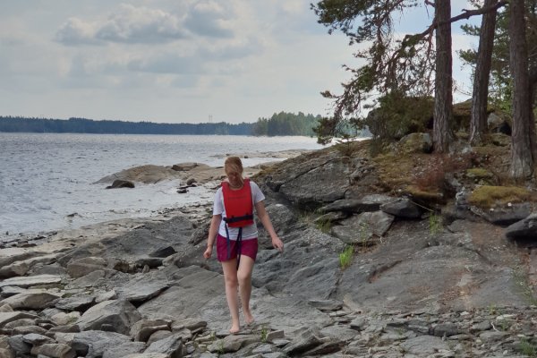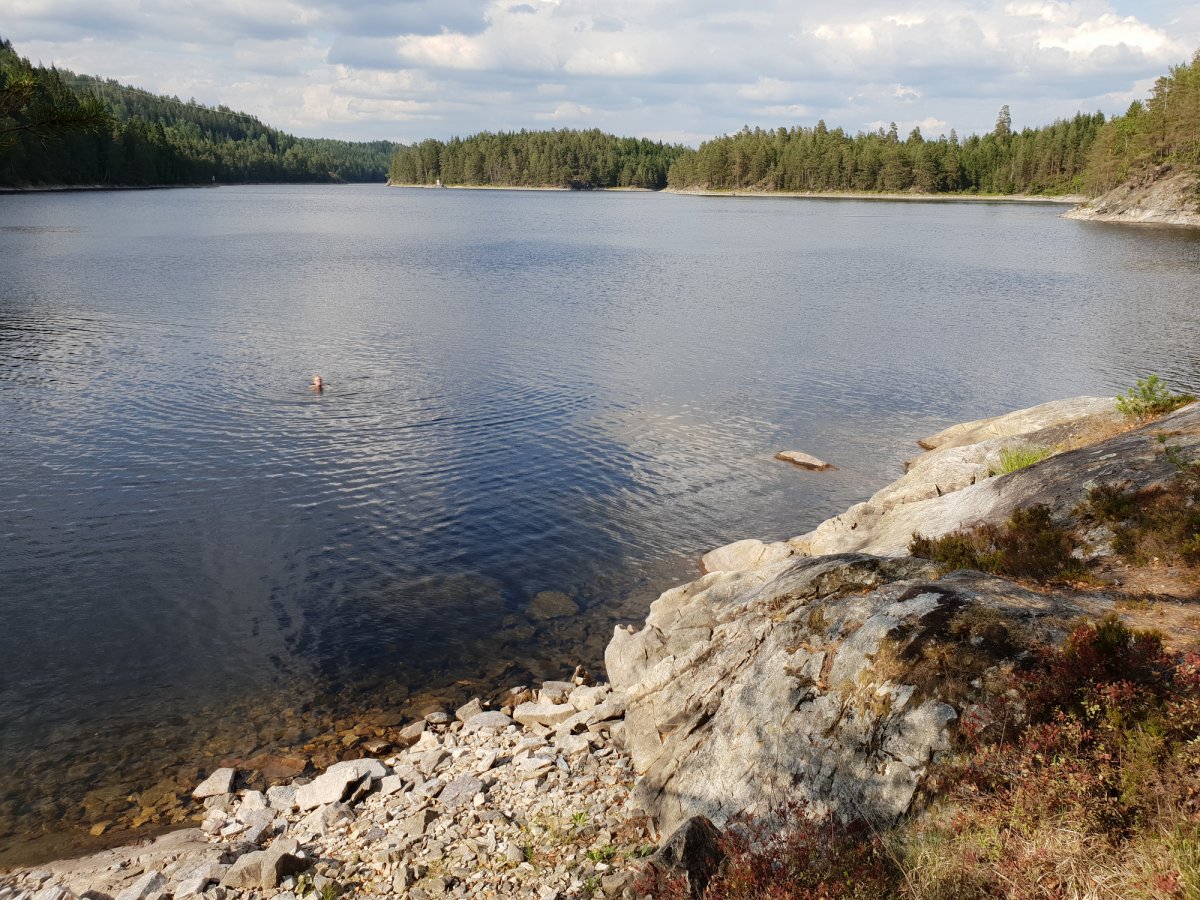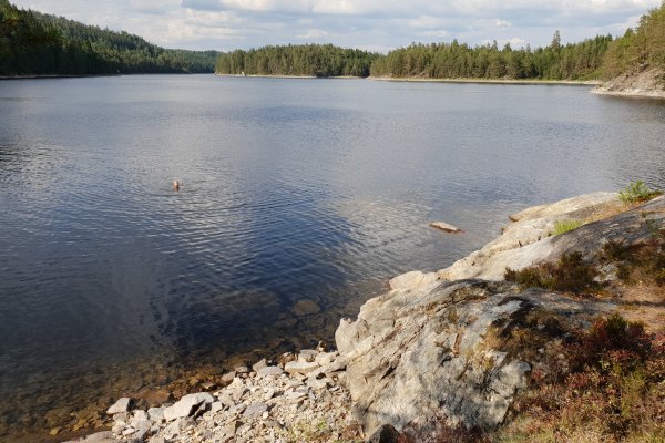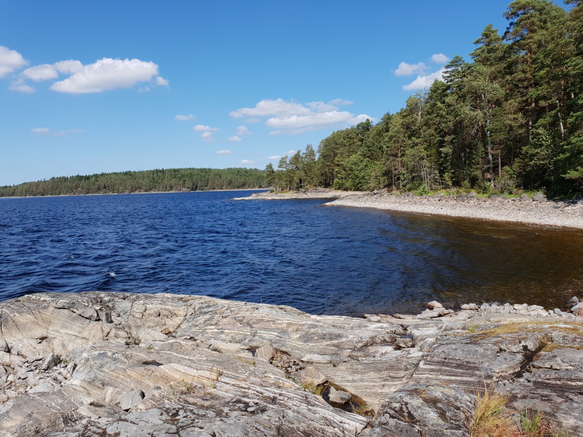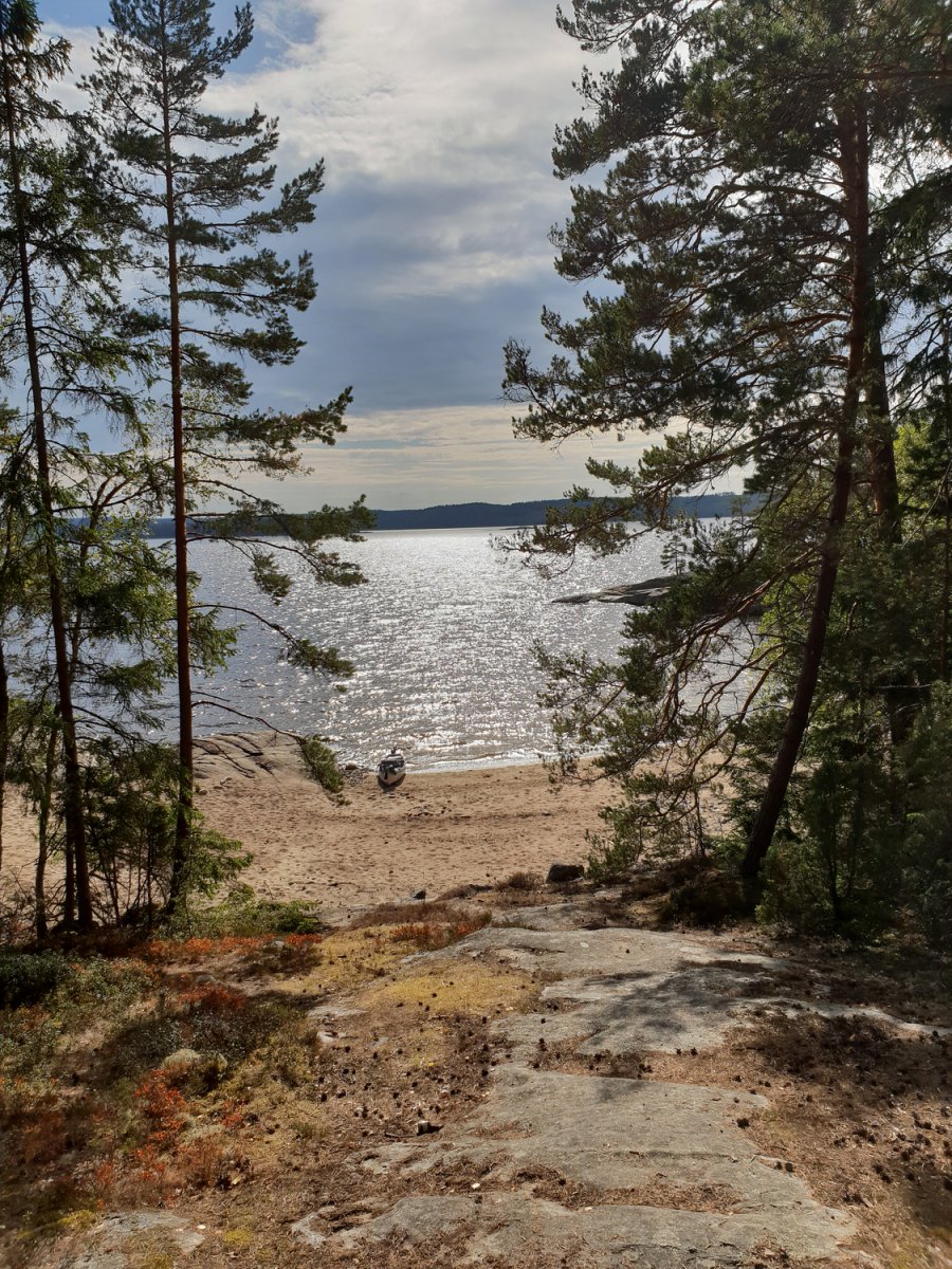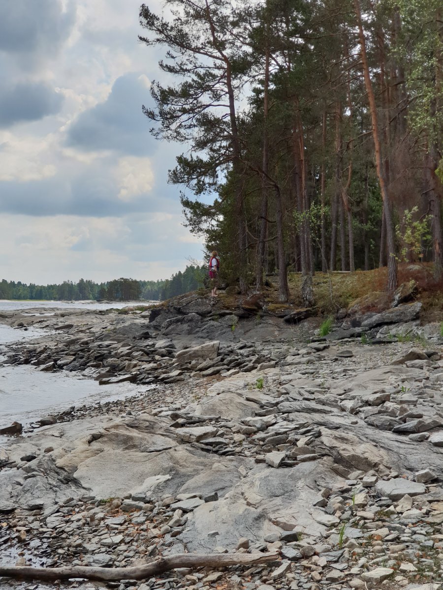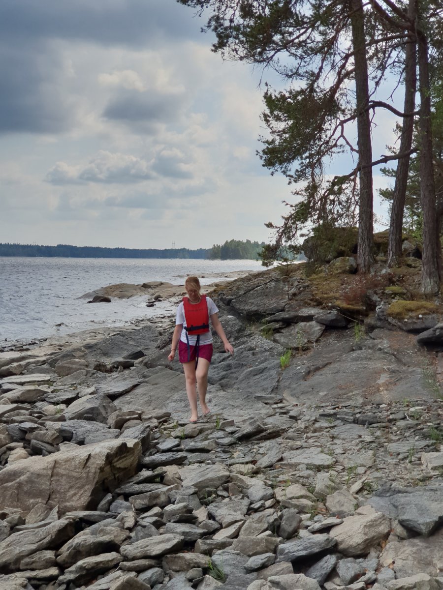 Nach dem wir am Vorabend reichlich besuch bekamen hatten wir noch abends beschlossen morgens früh zu packen und ohne Frühstück aufzubrechen, da wir vermuteten das am nächsten Tag auch viele Besucher zum ‚Strand‘ kommen würden. Wir sollten mit unser Vermutung recht behalten, obwohl wir wirklich früh aufstanden und packten bekamen wir bereits beim beladen des Kanus wieder Gesellschaft. Bei unserem kleinen Paradies handelte es sich wohl um einen Badestrand der gerne von einheimischen genutzt wurde. Schön war es trotz oder gerade wegen der Bekanntschaft was es schön. Wir fuhren also am frühen Vormittag los gegen Norden. Unser Ziel war die Umtragestelle bei der Ortschaft Viker. Die Landschaft veränderte sich erst kaum merklich, überwiegend flache Felsküsten mit Waldstücken und Schilf doch spätestens ab Viker änderte sich das jedoch sehr, die Felsküsten wurden höher, der Wald lichter. Um die Umtragestelle zu erreichen mussten wir eine Brücke suchen, das wussten wir, doch wie schwer ist ein nicht mal zwei Meter breites Nadelöhr zu finden in einer Umgebung voller Ecken, Winkel und Buchten war uns nicht bekannt. Es war wie findet Walter, aber wir haben es geschafft, was wohl überwiegend daran lag das Yannick wieder die Karte und somit die Navigation übernommen hat. Ich hätte uns im Kreis um eine Insel rum manövriert. Die Landschaft änderte sich noch weiter. Die Felsklippe zur unserer Linken waren mittlerweile ca. 20 Meter hoch und kaum noch bewachsen, nur ein Ferienhaus thronte oben auf. Ein Skurriles Bild. Aber jetzt war die Umtragestelle schnell gefunden. jetzt hieß es also umtragen, wir hatten zwar einen Kanuwagen, waren uns aber unschlüssig wie wir die Sache jetzt angehen sollten. Der erste Versuch das Kanu voll beladen auf den Wagen hieven stellte sich als keine gute Idee heraus. Der zweite Versuch, mit einem nicht mehr ganz beladenen Kanu, lief schon deutlich besser und wir konnten mit dem Umtragen beginnen. Gott sei Dank war die Strecke nicht sehr weit und wir konnten bald wieder ins Boot einsteigen. Von der Umtragestelle ging es wieder Richtung Süden. Unser Ziel war unser Pausen halt des Ankunftstages. Je weiter wir kamen desto ebener und bewaldeter wurde die Landschaft wieder. Was uns, persönlich. besser gefiel. Die Hohen Klippen wirken schon ein wenig beklemmend obwohl auch diese gewiss ihren Reiz haben.