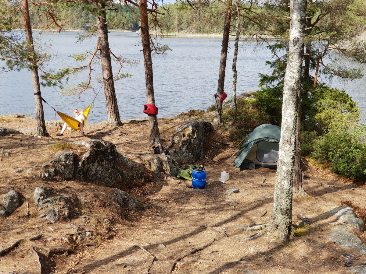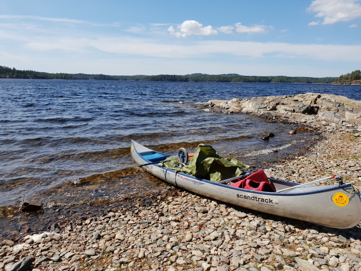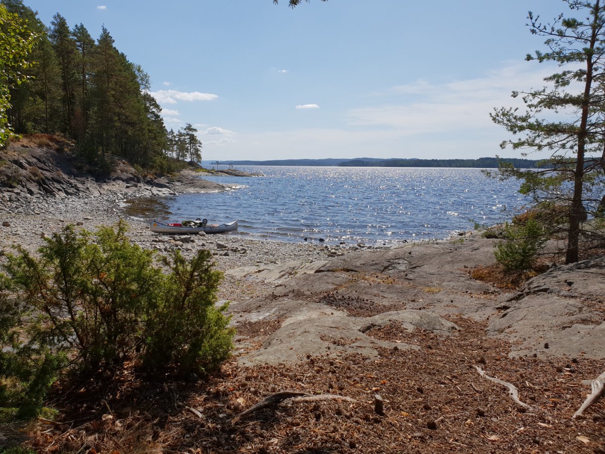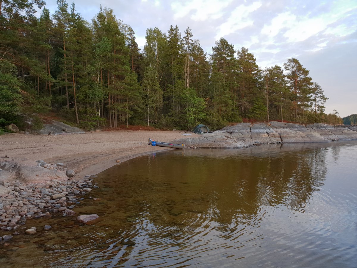 An unserem Ziel angekommen trugen wir die Ausrüstung den Berg hoch und liefen nochmal ein paar Meter in den Wald rein, insgesamt bestimmt 30/40 Meter. Klar das klingt jetzt nicht viel aber bei 30 Grad und nach einem ganzen Tag paddeln ist das echt eine weite weite Strecke. Wir waren also an unserem Zuhause für heute angekommen, dachte ich..! Wir bauten alles auf, filterten Wasser, ich wusch ein paar Klamotten und auch mich und lag nun im Zelt und zog mir was Frisches an und war entspannt. Bis mein Freund ins Zelt guckte, und meinte: ' Wir müssen hier weg!' ich war entsprechend verdutzt aber er war der festen Überzeugung das wir umziehen müssten, da wir, falls der Wald brennen wir ein großes Problem hätten von unserem Lagerplatz weg zu kommen‘. Recht hatte er damit ja aber die Wahrscheinlichkeit dass es, trotz der angespannten Situation in Schweden, zu einem Waldbrand kommen könnte war recht gering. Aber er war nicht abzuhalten und transportierte die ersten Gegenstände schon ins neue Camp auf der andren Seite der Landzunge, als er wiederkam war ich entsprechend angepisst immerhin hatte ich gedacht ich hätte für heute genug geschwitzt und lag noch immer im Zelt in der Hoffnung er hätte geschnallt das es unnütz wäre, leider nicht. Als er wieder kam steckte er gehetzte den Kopf ins Zelt und meinte das wir uns beeilen müsste auf meine Frage warum meinte er es würde bald Regnen. Ihr könnt Euch vorstellen wie begeistert ich war das ich alles wieder einpacken und umtragen musste nur um es da wiederaufzubauen. Ich stieg als aus dem Zelt und konfrontierte Ihn mit den Fakten die Ihn zum Umzug bewogen: ' Wir müssen umziehen falls der Wald brennen sollte, aber wir müssen uns beeilen, weil es gleich regnet?'. Es brachte nichts wir zogen um. Nun hatten wir aber unser Lager aber endgültig erbaut und wir richteten uns erneut ein. An diesem Abend haben wir auch zum ersten Mal die Essenstonne Komplet ausgeräumt. Bisher hatten wir nur Brot uns Cornflakes gegessen. Da man aber auch alle Konserven (z.B. Bohnen, Champions, Erbens) auch gut kalt essen kann haben wir für die nächsten Tage beschlossen diese auch zu nutzen. Nach einem guten Essen ließen wir den Abend noch mit Kartenspielen ausklingen und gingen früh ins Bett. Für den nächsten Tag hatten wir nämlich große Ziele.