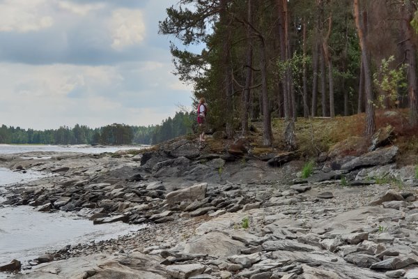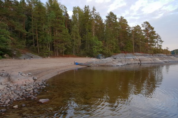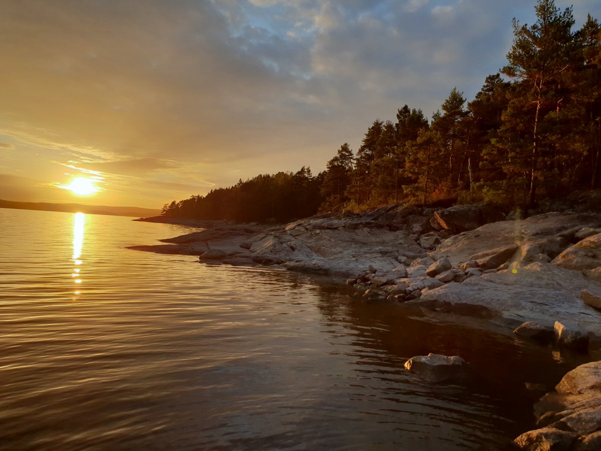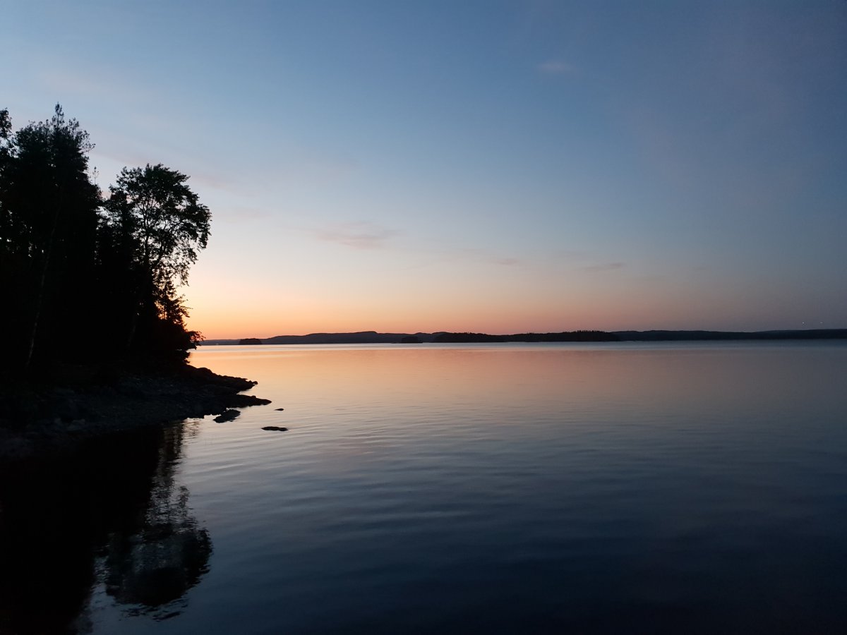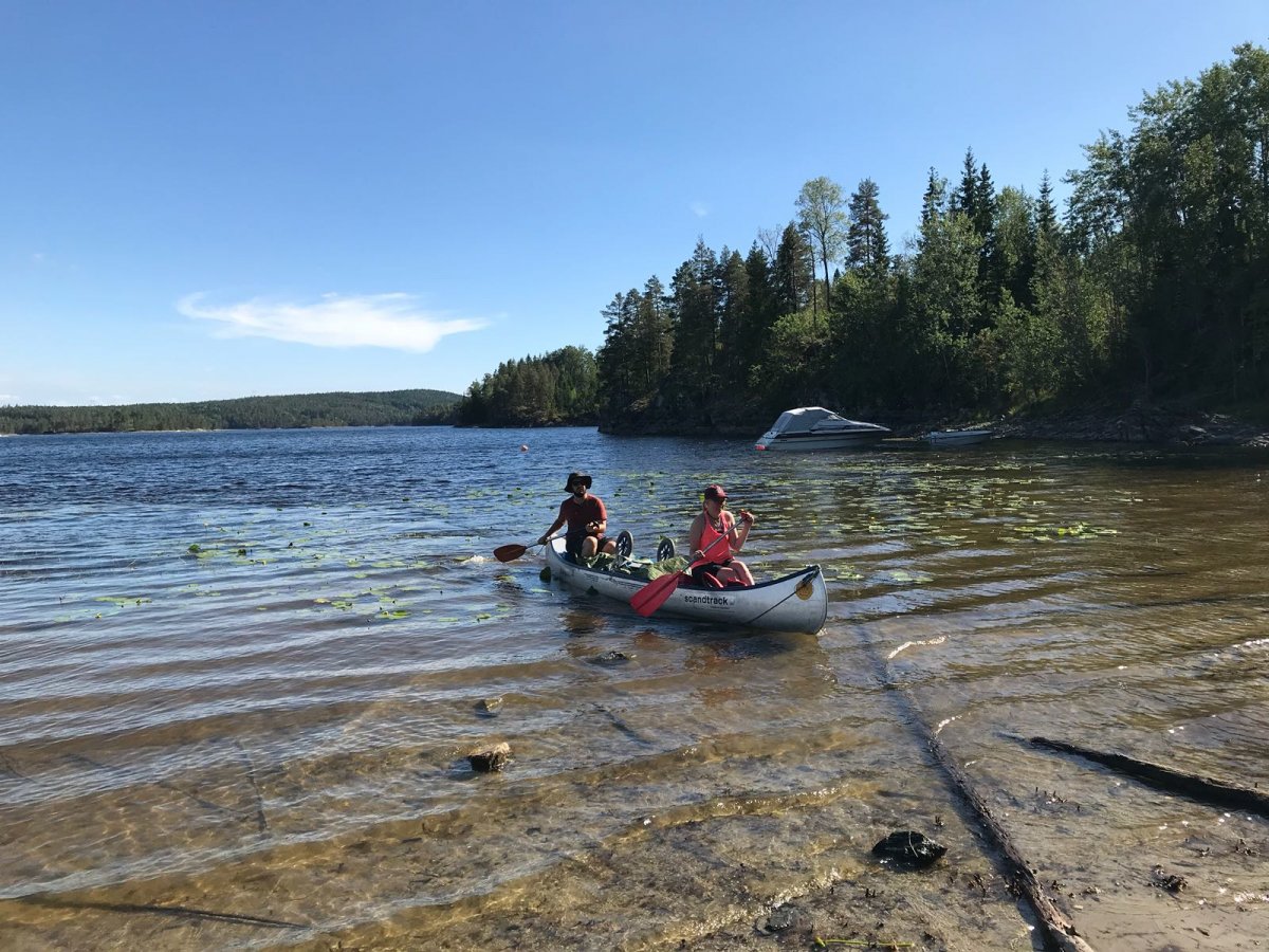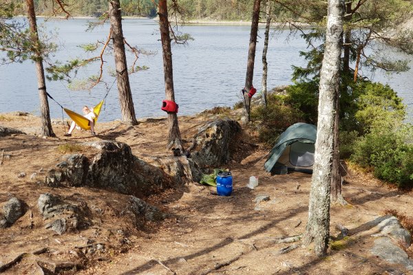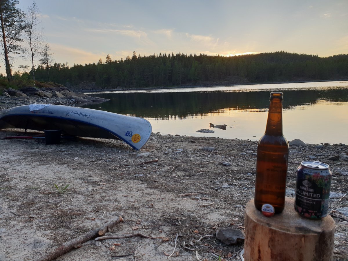An unserem Ziel angekommen trugen wir die Ausrüstung den Berg hoch und liefen nochmal ein paar Meter in den Wald rein, insgesamt bestimmt 30/40 Meter. Klar das klingt jetzt nicht viel aber bei 30 Grad und nach einem ganzen Tag paddeln ist das echt eine weite weite Strecke. Wir waren also an unserem Zuhause für heute angekommen, dachte ich..! Wir bauten alles auf, filterten Wasser, ich wusch ein paar Klamotten und auch mich und lag nun im Zelt und zog mir was Frisches an und war entspannt. Bis mein Freund ins Zelt guckte, und meinte: ' Wir müssen hier weg!' ich war entsprechend verdutzt aber er war der festen Überzeugung das wir umziehen müssten, da wir, falls der Wald brennen wir ein großes Problem hätten von unserem Lagerplatz weg zu kommen‘. Recht hatte er damit ja aber die Wahrscheinlichkeit dass es, trotz der angespannten Situation in Schweden, zu einem Waldbrand kommen könnte war recht gering. Aber er war nicht abzuhalten und transportierte die ersten Gegenstände schon ins neue Camp auf der andren Seite der Landzunge, als er wiederkam war ich entsprechend angepisst immerhin hatte ich gedacht ich hätte für heute genug geschwitzt und lag noch immer im Zelt in der Hoffnung er hätte geschnallt das es unnütz wäre, leider nicht. Als er wieder kam steckte er gehetzte den Kopf ins Zelt und meinte das wir uns beeilen müsste auf meine Frage warum meinte er es würde bald Regnen. Ihr könnt Euch vorstellen wie begeistert ich war das ich alles wieder einpacken und umtragen musste nur um es da wiederaufzubauen. Ich stieg als aus dem Zelt und konfrontierte Ihn mit den Fakten die Ihn zum Umzug bewogen: ' Wir müssen umziehen falls der Wald brennen sollte, aber wir müssen uns beeilen, weil es gleich regnet?'. Es brachte nichts wir zogen um. Nun hatten wir aber unser Lager aber endgültig erbaut und wir richteten uns erneut ein. An diesem Abend haben wir auch zum ersten Mal die Essenstonne Komplet ausgeräumt. Bisher hatten wir nur Brot uns Cornflakes gegessen. Da man aber auch alle Konserven (z.B. Bohnen, Champions, Erbens) auch gut kalt essen kann haben wir für die nächsten Tage beschlossen diese auch zu nutzen. Nach einem guten Essen ließen wir den Abend noch mit Kartenspielen ausklingen und gingen früh ins Bett. Für den nächsten Tag hatten wir nämlich große Ziele.