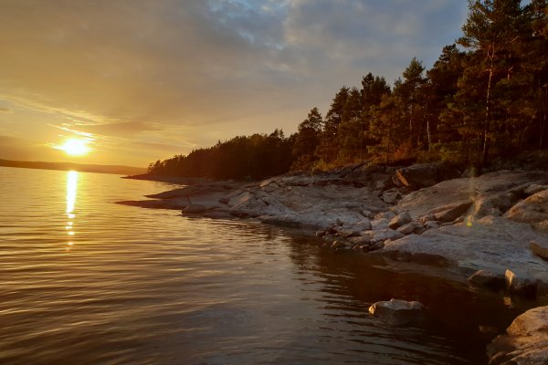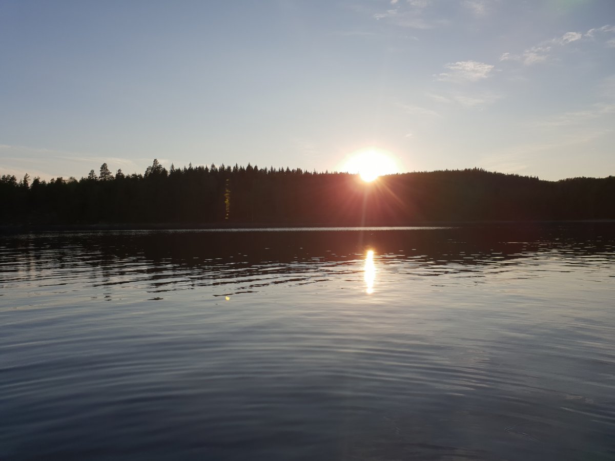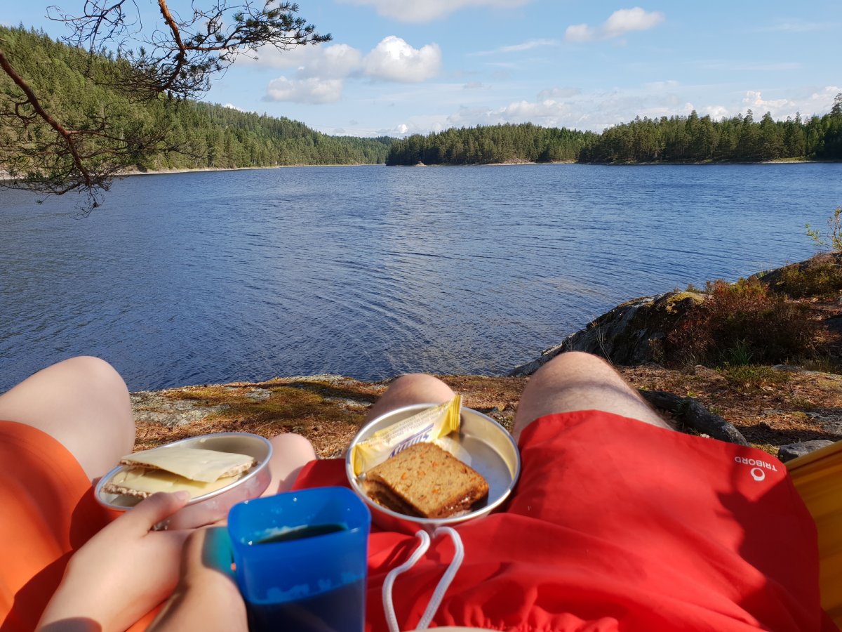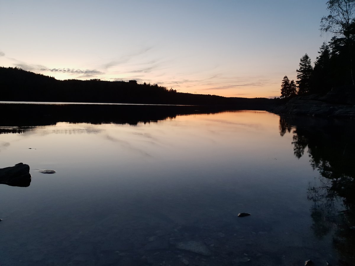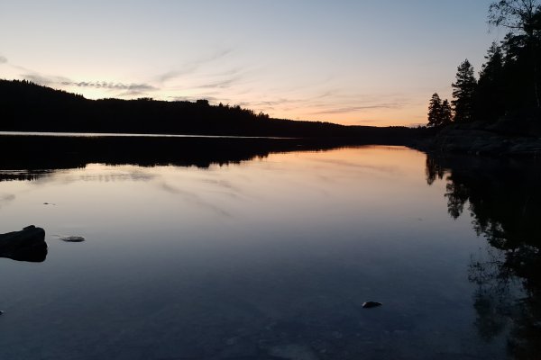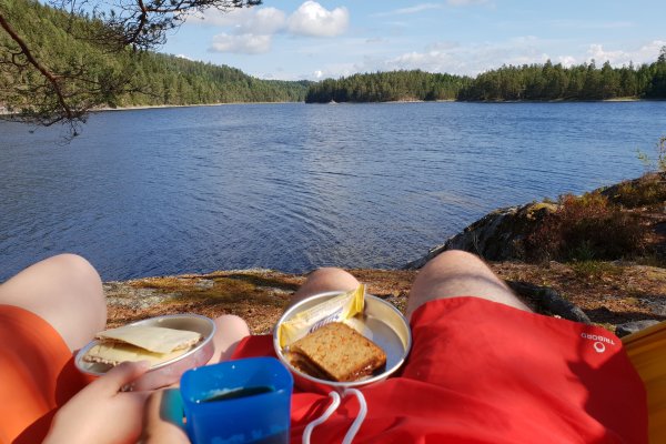 Das Aufstehen viel uns noch nie so leicht, es war warm, ruhig und die Bucht lag so friedlich da wie am Vorabend. Der Ausblick war herrlich. Wir machten uns Frühstück und genossen den morgen in der Hängematte. Nach dem Frühstück und einem kleinen Spaziergang über unser Domizil packten wir unsere Sachen, beluden das Kanu und machten uns auf den Weg. Denn wie heißt es so schön ' der Weg ist das Ziel'. Wir fuhren von unserm Camp aus Richtung Süden, geschützt zwischen Festland und Insel war das Wasser ruhig und auch der Wind kaum spürbar, wir waren überrascht wie einfach uns das paddeln viel. Allerdings nur bis wir auf den offenen See kamen, der Wind griff an und die wurden Wellen höher und schwups da war er, der Muskelkater und er traf uns doch etwas härter als wir gedacht hatten. Umkehren geht ja nun mal schlecht, also Zähne zusammenbeißen und weiter. Auf keiner der folgenden Etappen wurde uns so deutlich bewusst wie sehr wir uns beim Anblick der Karte verschätzt hatten was die Größe des Gebietes betrifft, klar ist es riesig aber wir hätten nie gedacht das wir innerhalb von zwei halben Tagen soweit fahren könnten. Wir fahren also gemütlich gen Süden, einen richtigen Plan wo wir hin wollten hatten wir nicht, bis auf der rechten Seite im Wald plötzlich was Gelbes auftauchte, nur ein kleiner Fleck, wir fuhren näher ran und der Fleck wurde immer größer bis dann da der Grenzstein stand. Ups da waren wir also in Norwegen! Und was sollen wir sagen, es war genauso sonnig wie in Schweden. Da mittlerweile auch bereits Mittag war haben wir auf der Insel Trollön eine kleine Pause gemacht, die Landschaft genossen, die Felsen entlang geklettert und einen neuen Plan entwickelt. Der Wind war über den Vormittag noch stärker geworden, leider aus der falschen Richtung, sodass wir nicht um die Inseln rumfahren konnten/wollten. Wir fuhren also wieder an der Insel hoch und kreuzten im Windschatten über die Insel hinweg um das Festland auf der anderen Seite zu erreichen. Gegen 15.00 Uhr kamen wir an und begannen mit der Suche eines Lagerplatzes. Wir fuhren einige Buchten an, die landschaftlich wunderschön waren, das reichte aber leider nicht immer aus, denn wo man nicht an Land gehen kann, kann man schlecht übernachten also suchten wir nun gegen Norden fahrend die Küste nach einer passenden Lagerstätte ab. Lange brauchten wir auch nicht suchen. Die Bucht die heute Nacht als unser Camp auserkoren lag exakt gegenüber unserer Lagerstätte von gestern. Welch eine Ironie, und dafür sind wir gepaddelt wie die verrückten. Wir bauten unser Lager auf und da das Wasser in dieser Bucht seicht abfiele nutzen wir die Möglichkeit und bauten einen Kühlschrank im Wasser. Sehr nützlich für Gemüse und Käse. Sobald alles aufgebaut war sind wir eine Runde schwimmen gegangen und ich habe mal probiert alleine Kanu zu fahren. Klappte sogar ganz gut. Dann gab es noch fix Abendbrot und dann wurde der angefangene Abend noch in der Hängematte ausgeschaukelt. Glaubt mir so eine Hängematte ist Goldwert!! So langsam wurde es dunkler und der Wald erwachte zum Leben, überall fing es an zu rascheln und zu knistert. In der ansonsten absoluten stille hört man plötzlich so viel mehr. Und dann bekamen wir sogar noch Besuch von zwei Fledermäusen. Klar hat man auch Zuhause oft Fledermäuse gesehen, aber die beiden die uns nun beehrten waren deutlich größer und auch mutiger. Sie flogen so dicht über unseren Köpfen her, dass ich das Gefühl hatte, dass sie gleich auf uns laden wollten. Wirklich atemberaubend.