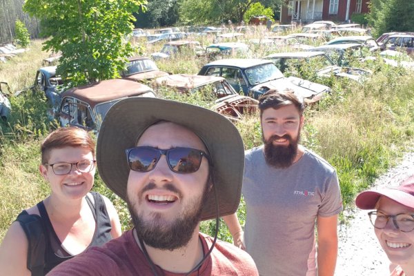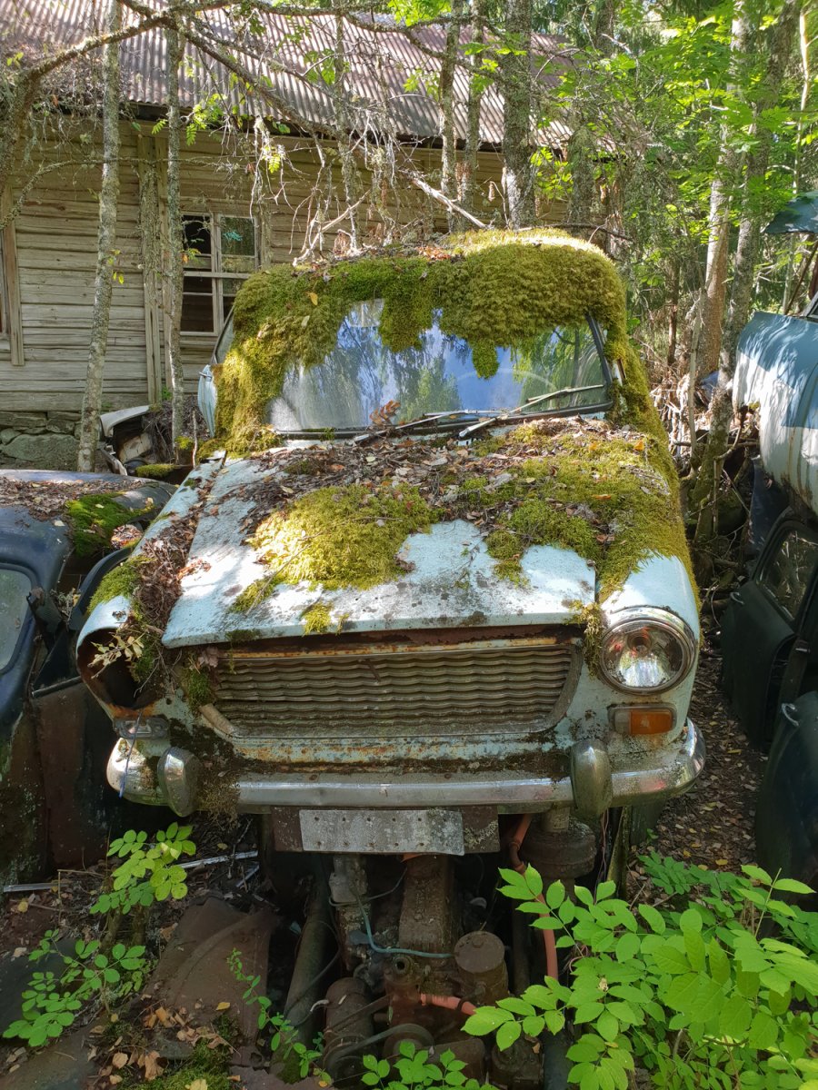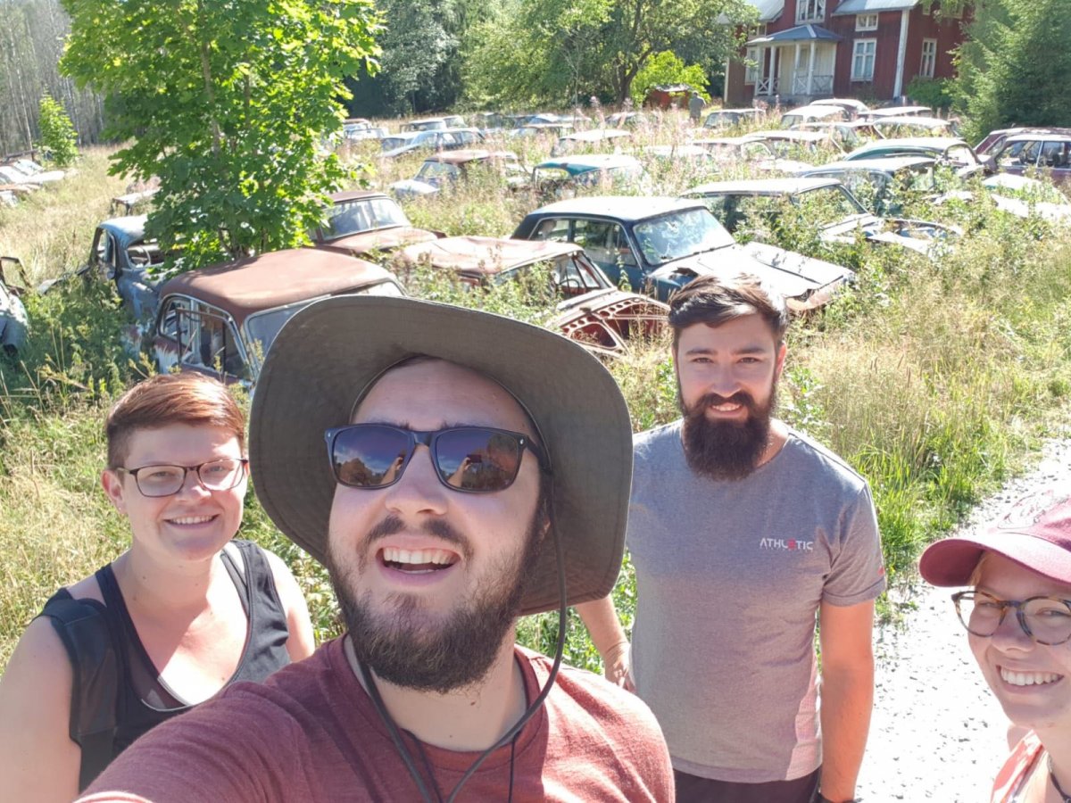 Beginnen tat der Tag wie jeder anderer, aufstehen, frühstücken, Sachen packen, Kanu beladen und los geht's. Die Strecke die wir an diesem Tag mit dem Kanu zurücklegten ist allerdings nicht der Rede wert. Wir fuhren keine zwei Kilometer, von unserem Camp auf der Landzunge bis nach Bastnas. Dort angekommen warteten wir auf einen Anruf. Der Bruder, von Yannick, und seine Freundin befanden sich gerade mit Ihrem umgebauten Ford Nugget auf dem Rückweg nach Deutschland nach einem Trip quer durch Schweden. Da sie sich aktuell in unserer Umgebung befanden beschlossen Sie prompt uns besuchen zu kommen. Und welcher Ort bietet sich da mehr an als der Autofriedhof?!- Genau, keiner. Als der Anruf kam das die beiden den Autofriedhof erreicht hatten machten wir uns auf den Weg nach oben und waren überwältigt und das nur von dem was wir vom Weg aussehen konnten. Alle Beschreibungen und Bilder die wir im Vorhinein gelesen/ gesehen haben kommen dem was uns dort erwartet nicht im Geringsten nah. Wir entschlossen uns dazu uns einen groben Überblick zu verschaffen, und dann erstmal wieder ans Wasser zu gehen und zu überlegen wie wir den Tag gestalten wollen. Am Wasser angekommen hatten wir den Plan schon fertig und bauten unser Zelt auf, danach gingen wir wieder hoch sahen uns den Autofriedhof nun genauer an. Die große Wiese mit den Autos in reih und Glied war schon beeindruckend aber der Wald, wo die Autos gestapelt in Reihen, nebeneinander- und übereinanderstanden, unglaublich. Die Bäume wuchsen durch die Motorhauben, quetschten sich zwischen den Wagen her oder wuchsen durch Autoteile durch. Es wirkt absolut surreal. Es ist beeindruckend zu sehen wie sich die Natur Stück für Stück Ihr Reich zurückerobert. Die Hütten die verstreut auf dem ganzen Gelände stehen sind über und über gefüllt mit Ersatzsteilen, alle mit Marke und Modell beschriftet es ist unglaublich! Wir haben Stunden damit verbracht uns das ganze Gelände anzuschauen und zu entdecken (wenn Ihr da seid lest euch auf alle Fälle das Schild am Haupthaus durch, dass macht den Tag noch aufregender). Am Nachmittag sind wir erneut zum See runter sind ein bisschen geschwommen und Kanu gefahren. Abends haben wir gemeinsam auf dem Autofriedhof gegessen, skurril zwischen so vielen alten Autos zu sitzen und zu essen vor allem, weil man sich so schnell an die ungewöhnliche Umgebung gewöhnt und es total normal wird. Nach dem Abendessen haben wir ein paar kühle Dosen Bier eingepackt und haben uns damit auf den Weg zum Steg gemacht. Der Sonnenuntergang war Atemberaubend und es gab so viel zu erzählen das dieser wunderschöne Abend viel zu schnell vorbeiging.
