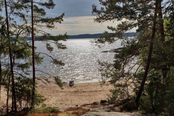 Die Navigation lag heute in meiner Hand und ich kann nicht sagen ob es daran lag oder einfach daran das DANO 18 so gut versteckt lag, wir fanden es auf alle Fälle nicht auf Anhieb, sondern paddelten bestimmt 15min zu weit nach Norden nur um dann wieder nach Süden paddeln zu müssen. Im zweiten Anlauf fanden wir das DANO dann auch, welches aber leider schon besetzt war. Das sollte uns aber nicht sonderlich viel ausmachen, da es noch früh war, das Wetter ein Traum. Es wehte nicht ein Lüftchen. Also entschieden wir uns den Foxen zu kreuzen von DANO 18 über die Spitze der Insel Langöarna bis zu anderen Seite des Foxen. Hier begann dann wieder die Lagerplatzsuche, nach zwei, drei Fehlversuchen fanden wir, wieder einmal, eine Bucht die bis zum Schluss mein absolutes Lieblingscamp bleiben sollte. Ein SANDSTRAND, warmer Sand umgeben von Wald, Felsen und Wasser, ein Traum. Leider sollte es auch unsere meist besuchte Camp Side sein. Kurz nachdem wir unser Zelt aufgeschlagen haben kam eine Mutter mit 3 kleinen Kindern den steilen Fels hinunter der den Wald trennte. wir waren überrascht, weil es nirgends so aussah als wäre irgendwo eine Straße oder sonst eine Möglichkeit für 'Zivilisation'. Die vier blieben aber nicht lange, sondern gingen nur einmal kurz baden und verabschiedeten sich dann wieder. Wir dachten jetzt hätten wir den Strand für uns, aber weit gefehlt, keine halbe Stunde später kam ein älteres Ehepaar mit Hund, wie sich rausstellte auch Deutsche die in der Nähe ein Ferienhaus besitzen und sogar in einer kleinen Kirche irgendwo am Foxen geheiratet haben. Sie bleiben zwei Stunden und wir unterhielten uns super mit Ihnen Sie konnten uns so viel über die Umgebung die Seen und das Land allgemein erzählen. Das war wirklich schön. Aber als sie gingen war es trotzdem schön diesen magischen Ort für sich zu haben, aber auch diesmal sollte es nicht von langer Dauer sein. Die letzte 'Besuchergruppe' war allerdings die skurrilsten, bestimmt 10 Mann in Badehosen und mit Handtuch um den Hals kamen von links über die Felsen die, die Bucht einrahmten und verschwanden rechts wieder über die Steine mehr nicht. Wir sind abends mal in beide Richtungen ' geklettert'. DA WAR NICHTS! Nur Steine und sonst nichts. So das wir uns den Rest des Abends, wohlgemerkt jetzt allein bleibend, gefragt haben wo sie herkamen, was sie da gemacht haben und wo sie hingegangen sind. Ansonsten wich der Abend nicht sonderlich von den Vorabenden ab. Essen, Schwimmen, Sonnenuntergang schauen und Schlafen.