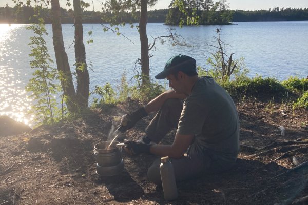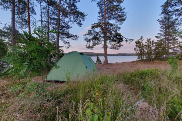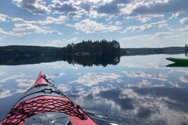 Nach dem Frühstück packen wir unsere Sachen in die Kajaks. Kurz bevor wir losfahren wollen, fällt Daniel sein Handy aus der Tasche und runter auf die Steine. Danach sieht der Bildschirm zersplittert aus aber zum Glück war nur die Schutzfolie beschädigt. Heute durchfahren wir eine Gegend mit vielen kleinen Einbuchtungen. Wir paddeln langsam am Ufer entlang und bewundern die Natur und Wälder. Als wir eine kleine Vogelinsel entlangfahren, kreist ein Vogel mehrfach schreiend über uns und insbesondere über Daniel. Er scheint nicht besonders erfreut über unsere Anwesenheit zu sein und Daniel wird nur knapp verfehlt als der Vogel seinen Toilettengang über Daniels Kajak erledigt. Am späten Nachmittag errichten wir unser Lager auf einer Insel mit einem schönen Wald und vielen Birken. Wir entspannen in der Hängematte und als wir abends im Zelt zu Bett gehen, höre ich einige Mäuse piepen und direkt am Zelt vorbeirennen, so niedlich! Leider gibt es auf dieser Insel jedoch auch recht viele Spinnen…