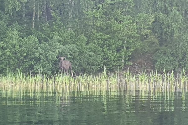 Die Sonne strahlt heute besonders stark vom Himmel und ich fülle meine Cappy mit kaltem Seewasser, um mich etwas abzukühlen. Heute weht kaum Wind und das Wasser ist spiegelglatt. Die kleinen Inseln auf dem See spiegeln sich nahezu perfekt im Wasser. Wir paddeln langsam an dem kleinen Dorf Torrskog entlang, welches ein paar Häuser und eine Kirche mit einem Friedhof zu haben scheint. Danach wird die Landschaft wieder etwas wilder und rauer. Wir lassen uns langsam im Wasser nahe dem Ufer treiben und überlegen gerade, wo wir am besten unseren heutigen Lagerplatz aufschlagen sollen als ich auf einmal von rechts ein Geräusch höre. Am Ufer im Wasser steht tatsächlich ein Elch! Der Elche frisst gemütlich Blätter von einem saftigen Zweig. Ganz langsam und vorsichtig kommen wir etwas näher. Der Elch schaut uns an und überlegt wohl, ob er weiter essen soll oder nicht. Er isst noch ein paar Minuten weiter und verschwindet dann im Wald. Was für ein wunderschönes Erlebnis! Danach halten wir an einem kleinen Strand und prüfen, ob wir hier unser Lager errichten können. Jedoch befindet sich hier ein Ameisenhaufen und es wimmelt nur so voller kleiner unzähliger Ameisen. Also suchen wir weiter und finden etwas später einen geeigneten Platz, etwas erhöht mit toller Aussicht auf das Wasser.