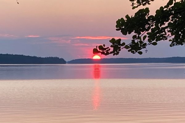 Zum Frühstück gibt es heute Brot mit Nutella. Sehr lecker! Daheim esse ich eher selten Nutella. Gegen Mittag fahren wir los. Heute fahren wir nur ca. 2 Stunden langsam und entspannt mit dem Kajak umher. Wir finden ein schönes, etwas einsam gelegenes Dano an Land im Wald. Es gibt ein paar provisorische Sitzbänke und jemand hat sogar eine gemütliche Rückenlehne mit Ästen gebaut, was für ein Luxus endlich mal wieder gemütlich auf einer Bank zu sitzen! Dies macht das Sitzen nochmal deutlich gemütlicher. Vom Sitzen und Kochen mit unserem kleinen Kocher auf dem Boden tut uns schon langsam der Rücken weh. Wir waschen unsere Kleidung am Ufer und gehen auch selbst etwas zum Auffrischen ins Wasser. Auf der Holzwand im Dano hat jemand einen Hinweis hinterlassen, dass es hier im Wald eine verlassene Scheue geben soll. Wir machen uns also auf den Weg durch den Wald. Der Wanderweg bzw. Trampelpfad hört nach einiger Zeit auf und wir laufen quer durch den Wald. Der Weg ist recht uneben und voller Äste aber nach einiger Zeit finden wir tatsächlich die verlassene Scheune. Sie sieht sehr alt und beschädig aus. Im Inneren stehen einige alte Geräte und sogar Kutschen-ähnliche Fahrzeuge. Es lassen sich kleine Ställe und altes Heu durch die Fenster erblicken. Alles wirkt sehr alt und unheimlich. Der perfekte Drehort für einen neuen Horrorfilm würde ich sagen! Freudig über unsere Entdeckung machen wir uns später auf den Weg zurück (zwischenzeitlich blickt ein Reh recht überrascht über unsere Anwesenheit aus dem Wald hervor und läuft anschließend davon). Am Abend sitzen wir auf einem großen Felsen und genießen die verbleibende Sonne und wunderschöne Aussicht über die Seelandschaft.