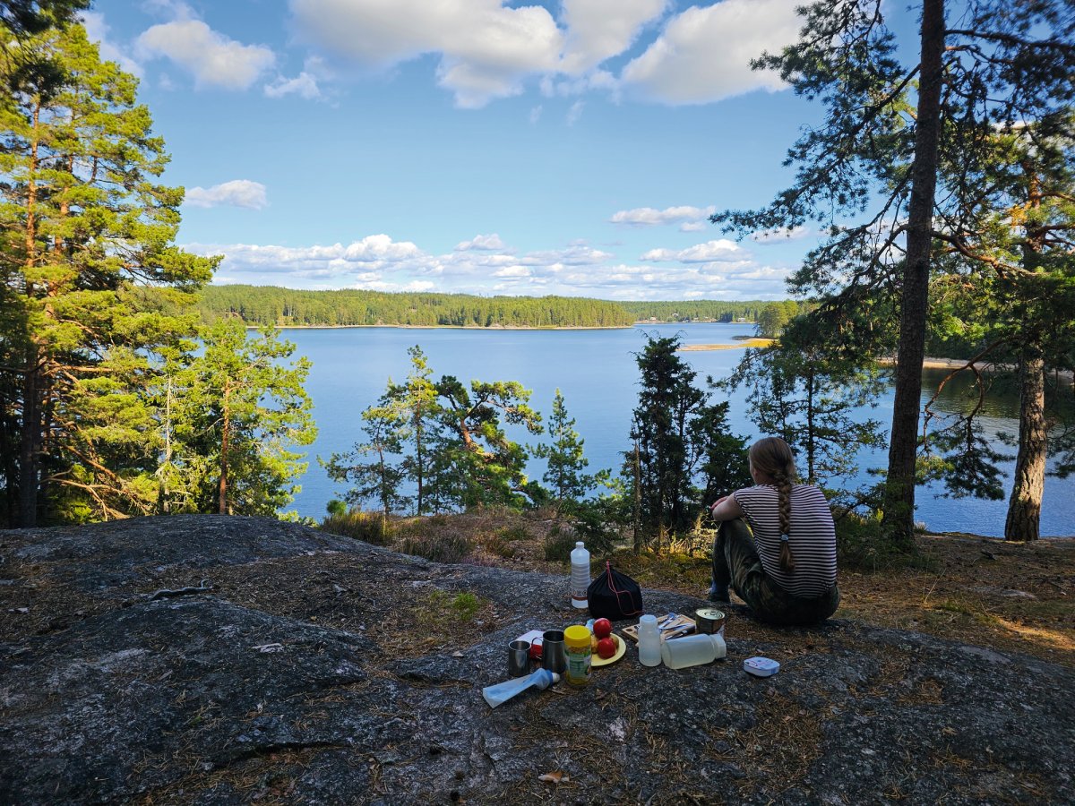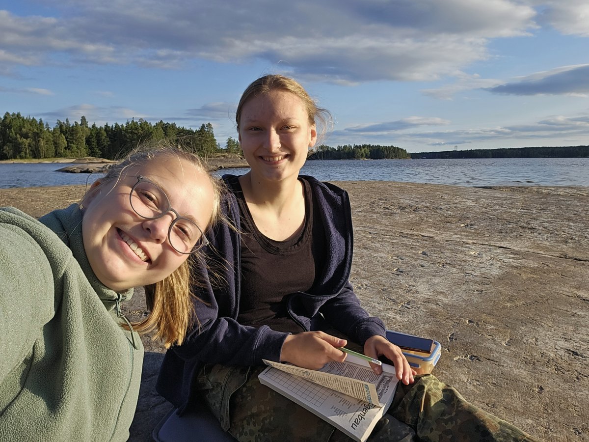 Als wir aufgeregt vom Bus abgeholt wurden, erwarteten wir viel Ruhe, Entspannung und die Möglichkeit, tun und lassen zu können, was wir wollten. Mit Rätselheften, Büchern und Spielen im Gepäck kamen wir im Camp an und konnten direkt losfahren. Schweden begrüßte uns mit Wind und Wolken und so schaukelten wir an unserem ersten Tag in Richtung Norden. Wir kämpften uns bis zum DANO-Platz 12 durch und bauten dort unser Nachtquartier auf. Nach unserer ersten Mahlzeit umrundeten wir die Insel und genossen die ersten Eindrücke der Natur. Den Abend ließen wir mit Kreuzworträtseln am Ufer ausklingen in voller Vorfreude auf die kommenden Tage.
