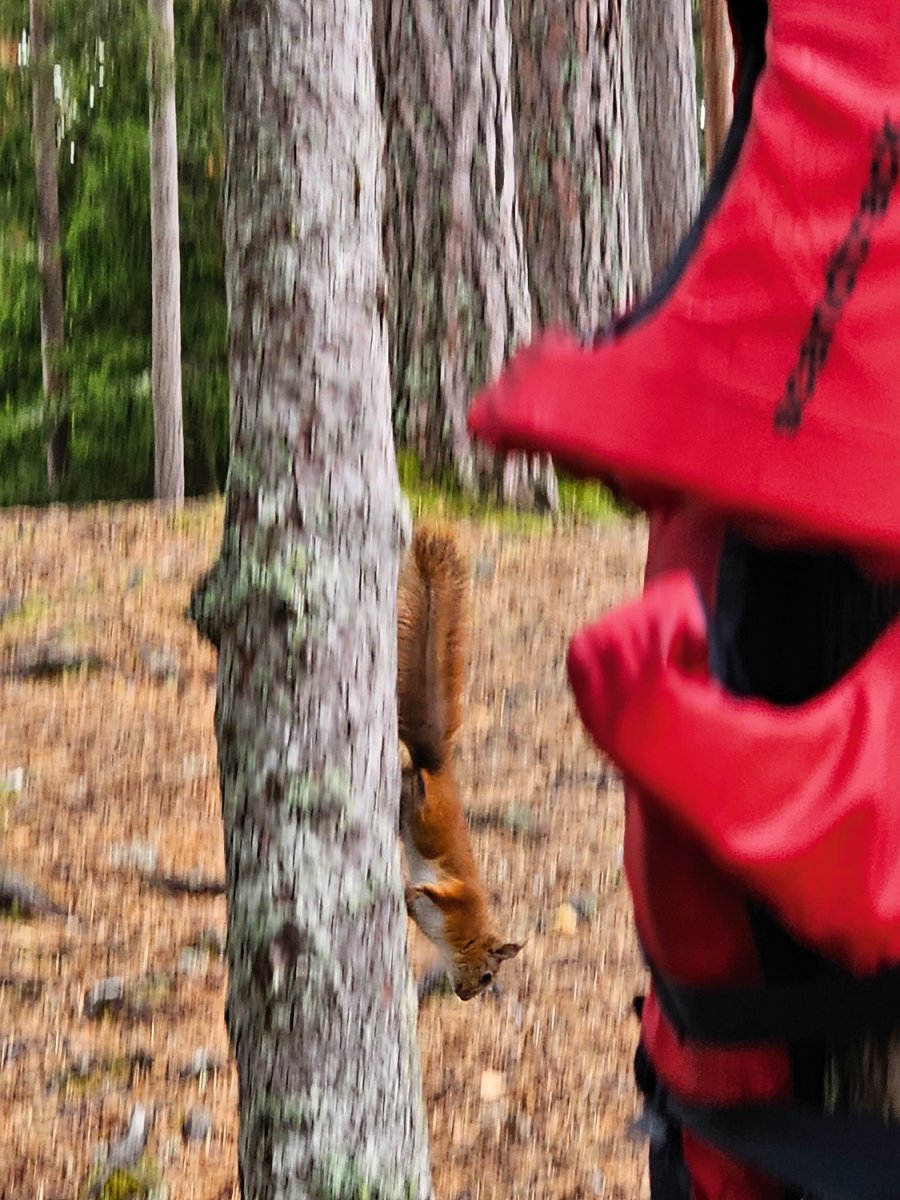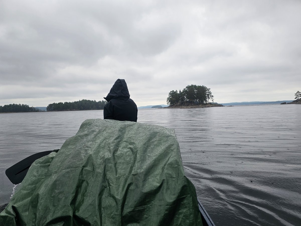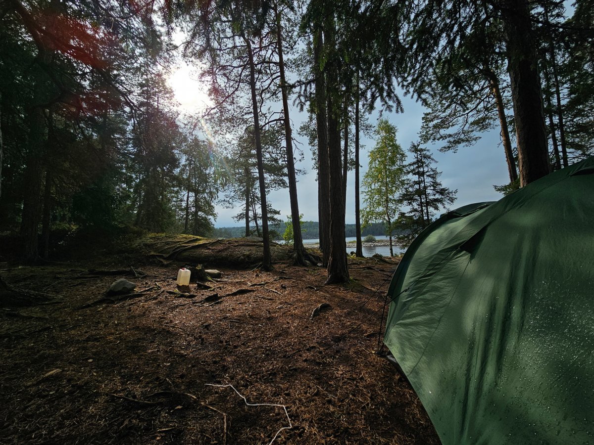 Kurz bevor wir heute aufbrechen wollten, kamen wir mit zwei Mitcampern ins Gespräch und tauschten einige unserer Vorräte. Glücklicherweise hatten wir heute nur eine kurze Strecke zu DANO-Platz 8 geplant, da es anfing zu nieseln. Wir steuerten eine Insel an, die wir im Jahr zuvor auch besucht hatten und die zum Teil zu Norwegen gehört. Mit der Aussicht auf anhaltenden Regen, spannten wir unser Tarp und machten es uns darunter gemütlich. Unsere nassen Sachen versuchten wir zu trocknen, indem wir sie an die Leine unter der Plane hingen, doch wie erwartet, hat das nicht ansatzweise funktioniert. Den restlichen Tag kuschelten wir uns in unsere Schlafsäcke und spielten Black Stories. Wenn wir mal draußen waren, konnten wir einige Eichhörnchen beobachten, die vermutlich in dem Baum neben unserem Zelt lebten, da sie die meiste Zeit um diese Stelle herumhüpften. Bei dem Wetter erlebten wir heute nichts Besonderes mehr, aber der Tag war auch so wunderschön.
