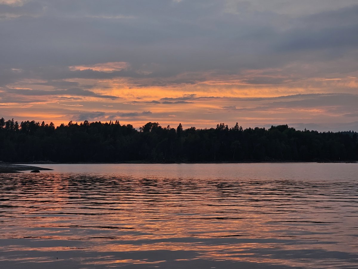 Da heute für den ganzen Tag Regen gemeldet wurde, sind wir extra früher aufgestanden, damit wir unser Zelt im Trockenen abbauen können. Damit waren wir gerade rechtzeitig fertig, denn kaum war alles verpackt, ging es auch schon los und wir mussten im Nassen losfahren. Aufgrund des Wetters haben wir nur eine kurze Strecke zu DANO-Platz 17 geplant und dort einen Fleck unter Bäumen gesucht. Außerdem spannten wir wieder unsere Plane, um im Trockenen sitzen zu können. Entgegen aller Erwartungen hörte der Regen plötzlich auf und wir konnten uns wieder am Ufer einen gemütlichen Stein suchen. Nach leckeren Nudeln mit Käsesahnesoße machten wir uns spontan auf die Suche nach einem Geocache, allerdings befand sich dieser bei dem einzigen Haus auf der kleinen Insel. Da dort auch noch Leute saßen, mussten wir leider erfolglos wieder umdrehen, aber wir hatten trotzdem Spaß an dieser Tour. Einen Teil des Nachmittags verbrachten wir dann traurigerweise mit dem groben Packen unserer Klamotten, die wir in den wasserdichten Packsäcken, der Essenstonne und unserem kleinen Eimer verteilt hatten. Der nahende Abschied konnte unsere Stimmung jedoch nicht verderben und so genossen wir umso mehr den letzten Sonnenuntergang in der schwedischen Wildnis.