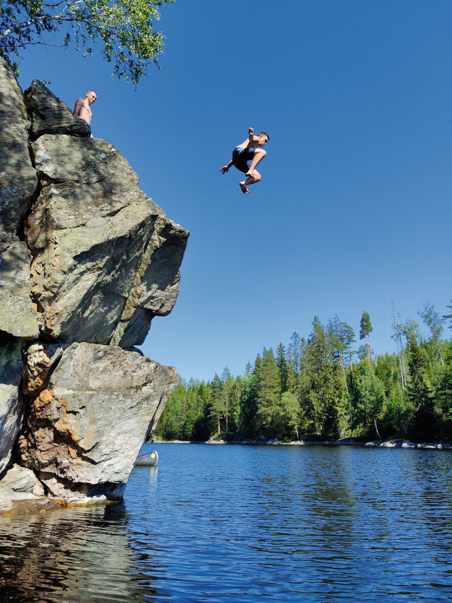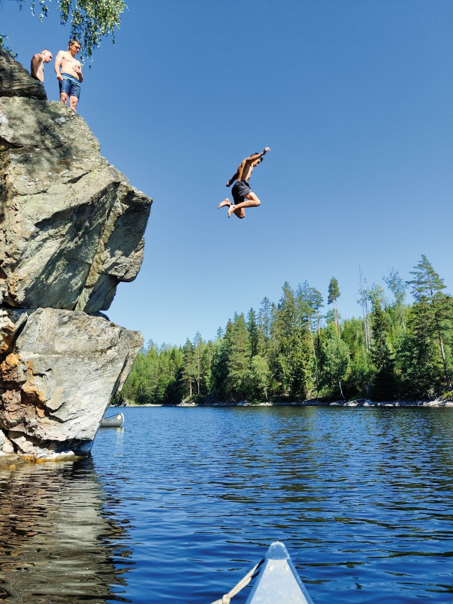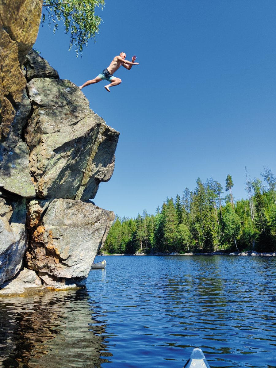 Beim Aufwachen direkt im Hintergrund die Wellen an die Steine plätschern zu hören und zu Wissen die Kanutour ist nun im vollen Gange, war ein unbeschreibliches Gefühl. Lucas dachte sich schon am Morgen er wirft wieder seine Angel aus aber musste dann schon nach kurzer Zeit Jonas nach Hilfe bitten um die Angel von einem gefangenen Stein zu befreien. Nachdem dann allmählich wirklich alle wach waren gab es Frühstück. Markus filmte noch mit seiner Drohne und seiner 360-Grad-Kamera die schöne kleine Insel auf der wir waren. So kam es, dass wir am ersten Tag erst um die frühe Mittagszeit aufbrachen. Kurze Zeit auf den Kanus stach uns auch schon der erste kleine Steinhang ins Auge von dem wir ein paar Sprünge ins Wasser wagten und Markus mal wieder in seinem Element beim Fotografieren und Filmen war, aber wir mussten weiter... Dies funktionierte dann wieder etwa für eine Stunde - oder ein bisschen länger - bis wir eine wunderschöne Klippe von ungefähr 5 Metern Höhe fanden von der wir sehr angetan waren. Unsere Tiefenmessungen mit einem Stein an einer langen Schnur gaben uns das Go und schon Sprangen wir auch von dieser Klippe. Die Stimmung war sehr gut doch so langsam wussten wir das wir uns beeilen mussten um noch ein DANO Lagerplatz zu bekommen. So hielten wir Ausschau nach den DANO Lagerstätten 17,12,13,14 und 16 doch bei allen wurde unsere Hoffnung auf ein eigenes Lager immer geringer, da überall bereits Kanus und andere Camper waren. So wurde die Stimmung langsam angespannter als wir gegen 17 Uhr an die DANO Hütte 15 „Getön Ost“ fuhren und nur darauf warteten wieder Kanus zu sehen. Doch plötzlich war die Stimmung wieder auf einem Hoch, da wir tatsächlich noch ein freien Platz mit Feuerstelle und Windschutzhütte gefunden hatten. Nun gab es auch endlich das verspätete Mittagessen und die Stimmung wurde wieder immer besser. Nach dem Beziehen der Hütte hatten wir auch schon einen Plan für das Abendessen. Bratkartoffeln mit Speck, Bohnen und Zwiebeln sollten es werden. Nach dem wir anfangs noch ziemliche Probleme mit dem Feuer hatten, die Hoffnung quasi aufgegeben haben und versuchten mit der Resthitze die Pfanne zu erhitzen glühte das Feuer auf einmal auf, sodass wir unsere Bratkartoffeln lecker genießen konnten. Dann hieß es noch im Dunkeln den Abwasch zu machen. Anschließend fielen alle erschöpft aber zufrieden um Punkt 12 ins Bett.
