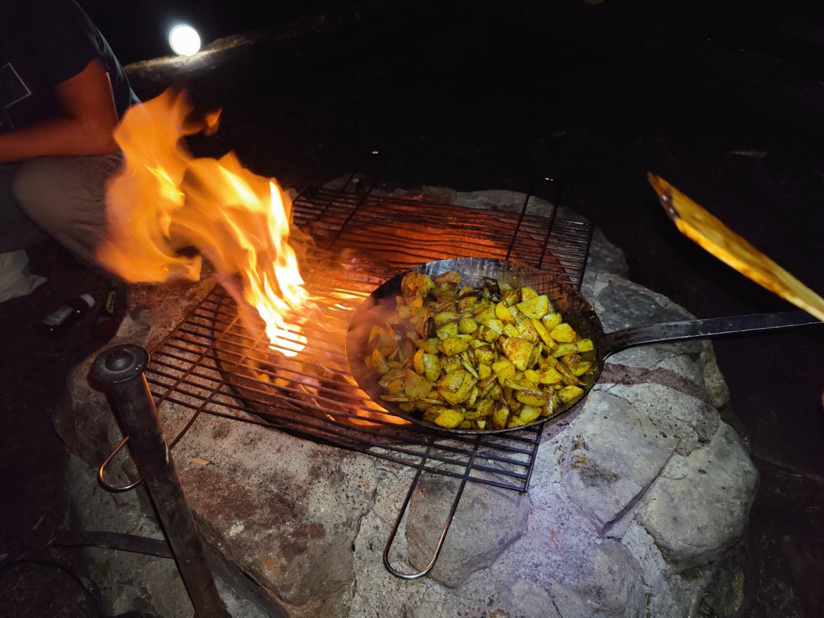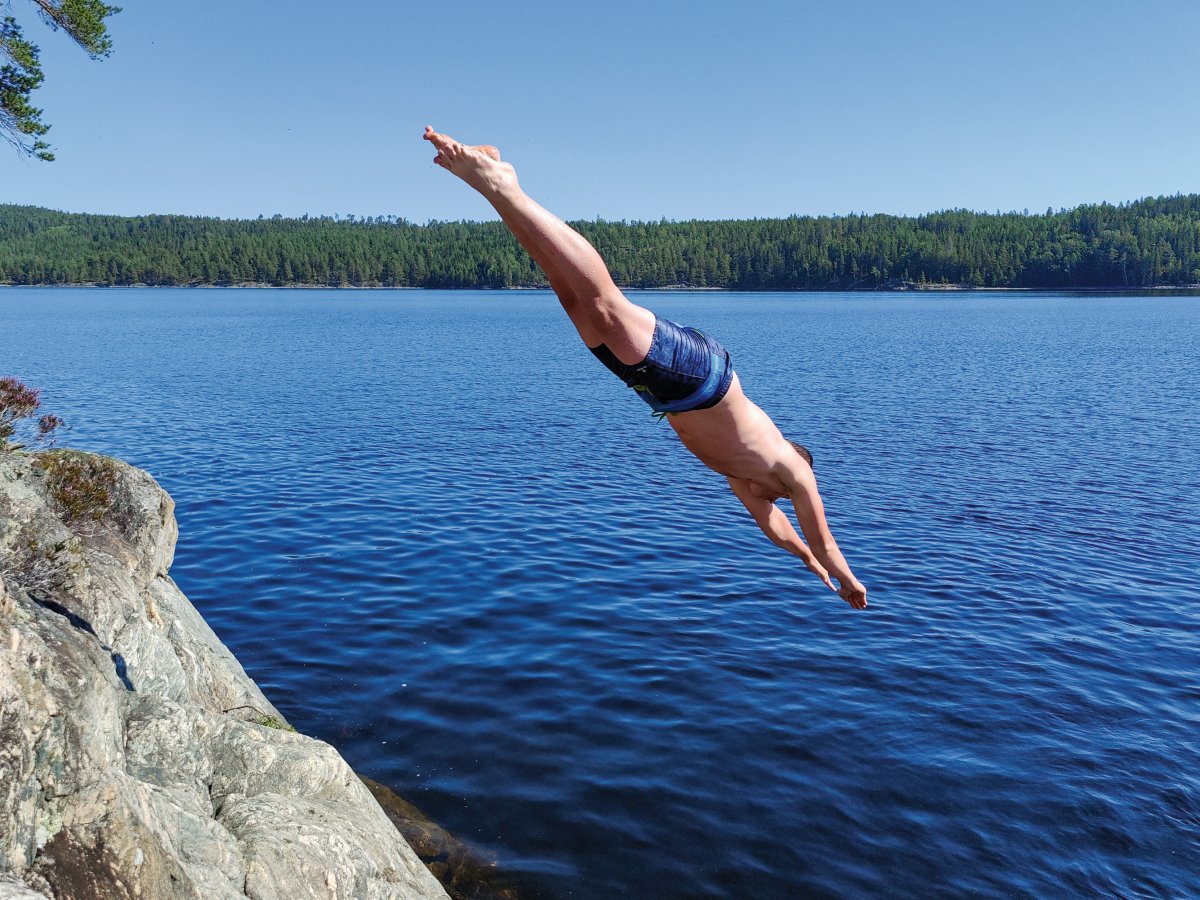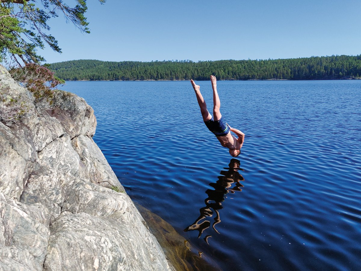 Beim Aufwachen direkt im Hintergrund die Wellen an die Steine plätschern zu hören und zu Wissen die Kanutour ist nun im vollen Gange, war ein unbeschreibliches Gefühl. Lucas dachte sich schon am Morgen er wirft wieder seine Angel aus aber musste dann schon nach kurzer Zeit Jonas nach Hilfe bitten um die Angel von einem gefangenen Stein zu befreien. Nachdem dann allmählich wirklich alle wach waren gab es Frühstück. Markus filmte noch mit seiner Drohne und seiner 360-Grad-Kamera die schöne kleine Insel auf der wir waren. So kam es, dass wir am ersten Tag erst um die frühe Mittagszeit aufbrachen. Kurze Zeit auf den Kanus stach uns auch schon der erste kleine Steinhang ins Auge von dem wir ein paar Sprünge ins Wasser wagten und Markus mal wieder in seinem Element beim Fotografieren und Filmen war, aber wir mussten weiter... Dies funktionierte dann wieder etwa für eine Stunde - oder ein bisschen länger - bis wir eine wunderschöne Klippe von ungefähr 5 Metern Höhe fanden von der wir sehr angetan waren. Unsere Tiefenmessungen mit einem Stein an einer langen Schnur gaben uns das Go und schon Sprangen wir auch von dieser Klippe. Die Stimmung war sehr gut doch so langsam wussten wir das wir uns beeilen mussten um noch ein DANO Lagerplatz zu bekommen. So hielten wir Ausschau nach den DANO Lagerstätten 17,12,13,14 und 16 doch bei allen wurde unsere Hoffnung auf ein eigenes Lager immer geringer, da überall bereits Kanus und andere Camper waren. So wurde die Stimmung langsam angespannter als wir gegen 17 Uhr an die DANO Hütte 15 „Getön Ost“ fuhren und nur darauf warteten wieder Kanus zu sehen. Doch plötzlich war die Stimmung wieder auf einem Hoch, da wir tatsächlich noch ein freien Platz mit Feuerstelle und Windschutzhütte gefunden hatten. Nun gab es auch endlich das verspätete Mittagessen und die Stimmung wurde wieder immer besser. Nach dem Beziehen der Hütte hatten wir auch schon einen Plan für das Abendessen. Bratkartoffeln mit Speck, Bohnen und Zwiebeln sollten es werden. Nach dem wir anfangs noch ziemliche Probleme mit dem Feuer hatten, die Hoffnung quasi aufgegeben haben und versuchten mit der Resthitze die Pfanne zu erhitzen glühte das Feuer auf einmal auf, sodass wir unsere Bratkartoffeln lecker genießen konnten. Dann hieß es noch im Dunkeln den Abwasch zu machen. Anschließend fielen alle erschöpft aber zufrieden um Punkt 12 ins Bett.