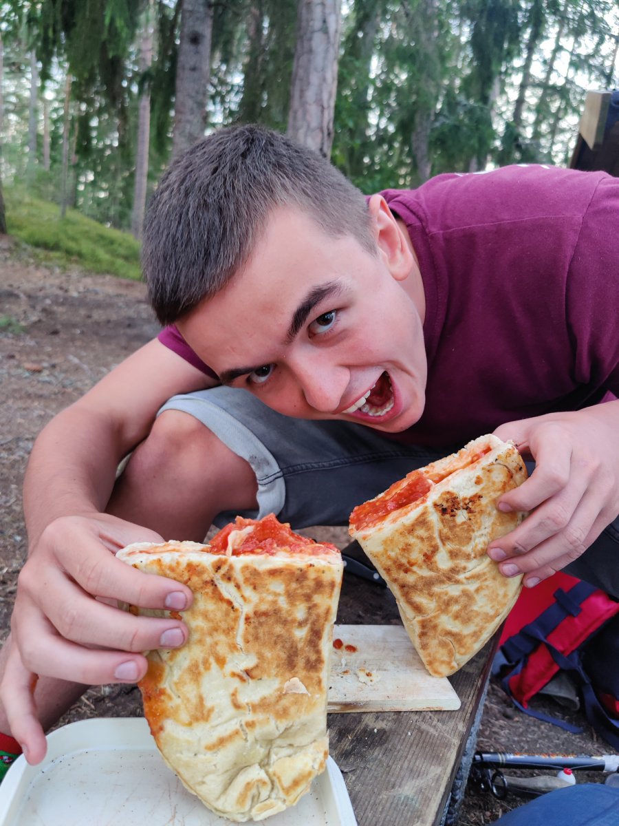 Mit dem Klingeln vom Wecker wachten wir um Punkt 8 auf und begannen auch schon zügig mit dem Frühstück. Wie geplant fuhren wir zeitnah los und kamen dann an der DANO Hütte Nummer 17 an. Dort lernten wir sehr nette Kanufahrer kennen mit denen wir uns unterhielten und einen sehr schönen Start in den Tag hatten. Nachdem die neuen Freunde nun weiter zogen und wir unser Zeug in die Hütte legten, machten wir Bekanntschaft mit einer Mäusefamilie und hatten nun endlich Zeit Riks Ladekabel am Start zu holen. Also zogen Rik und Lucas mit einem Kanu los und holten zu dem Ladekabel auch noch ein paar Bier. Währenddessen sammelte Markus ein paar Heidelbeeren. Jonas richtete das Lager her und holte Holz. Als Jonas dann das Bier erblickte,funkelten seine Augen. Nicht sehr viel später spannten wir auch schon eine Plane so über unsere Hütte, dass wir vor dem Regen geschützt waren und nahmen noch ein Paar Niederländer auf die uns über einen Autofriedhof erzählten von dem wir fasziniert waren. Der Regen endete woraufhin uns unsere Gäste verlassen haben. Dann kamen auch schon die nächsten Gäste von denen wir einiges über das Angeln lernten und Lucas einmal einen Hecht in seinen Händen hielt. Als es dann langsam Abend wurde wagten wir uns an das Rezept von der Klapp-Pizza und redeten mit unsern Nachbarn die überrascht waren wie gut die Pizzen aussahen. Nachdem wir die sehr leckeren Pizzen dann verschlungen haben machten wir noch ein kleines Brot mit Heidelbeeren und schliefen daraufhin nach einem Gäste-reichen Tag ein.