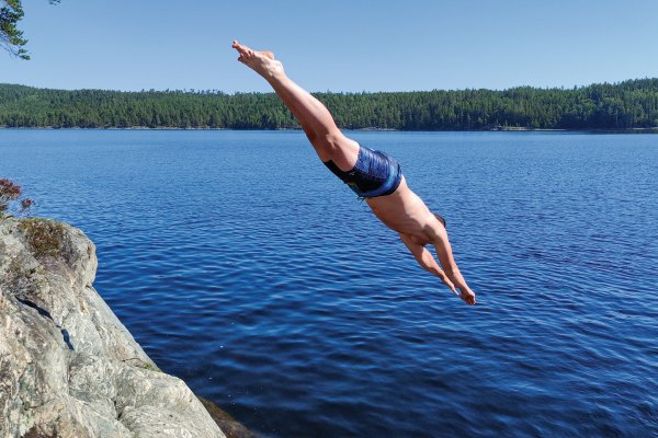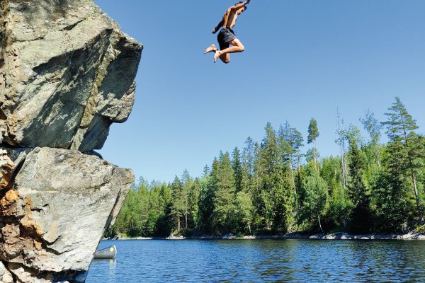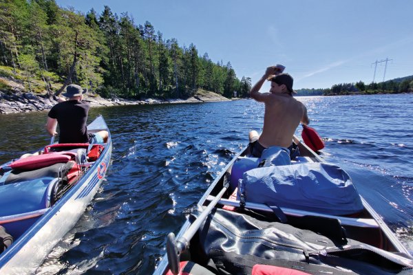 So starteten wir Vier motiviert und voller Elan in unser Abenteuer. Unser erstes Ziel war es Richtung Norden zu fahren um dann weiter westlich über die norwegische Grenze zu kommen. Wir fühlten uns sehr gut und kamen trotz schwer beladenen Kanus gut voran. Den ersten kleinen Snack kombinierten wir mit ein paar kurzen Sprüngen von einem kleinen Stein. Alles lief gut, scheinbar zu gut, denn nach einer guten Strecke auf den Kanus fiel Rik auf, dass er sein Ladekabel im Auto vergessen hatte. In unserem Jugendlichen Leichtsinn dachten wir nach dem Überfliegen der Karte, dass wir noch etwas weiter fahren und dann ungefähr 4 Kilometer durch den Wald laufen könnten um das Kabel zu holen. Was wir aber nicht beachteten waren die Höhenmeter und das Gestrüpp welches uns nach nicht Ganz der Hälfte der Strecke in die Knie zwang und die tapferen Kämpfer Rik und Lucas mit ein paar Kratzern zur Rückkehr brachte. Während der Wanderung haben Jonas und Markus bereits zu Mittag gegessen, sodass sie bei der Ankunft von Rik und Lucas weiter fuhren konnten - in der Hoffnung noch ein Lager an einem DANO-Platz zu finden. Dies gelang uns leider am ersten Tag nicht mehr, was aber nicht weiter schlimm war, weil wir eine schöne kleine Insel hinter der norwegischen Grenze fanden auf der wir unser Zelt und die Hängematten aufbauten und zu Abend aßen. Nachdem alle satt waren versuchte Lucas noch ein bisschen seine Angel auszuwerfen, wobei nach kurzer Zeit auch dies ein Ende fand, da durch unerklärliche Weise (schlechter Knoten) der Schwimmer mit samt des Köders einen Abgang machte. Somit endete der erste, ereignisreiche Tag unserer Kanutour.