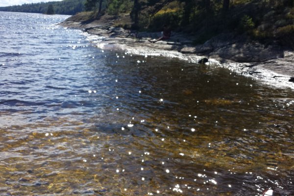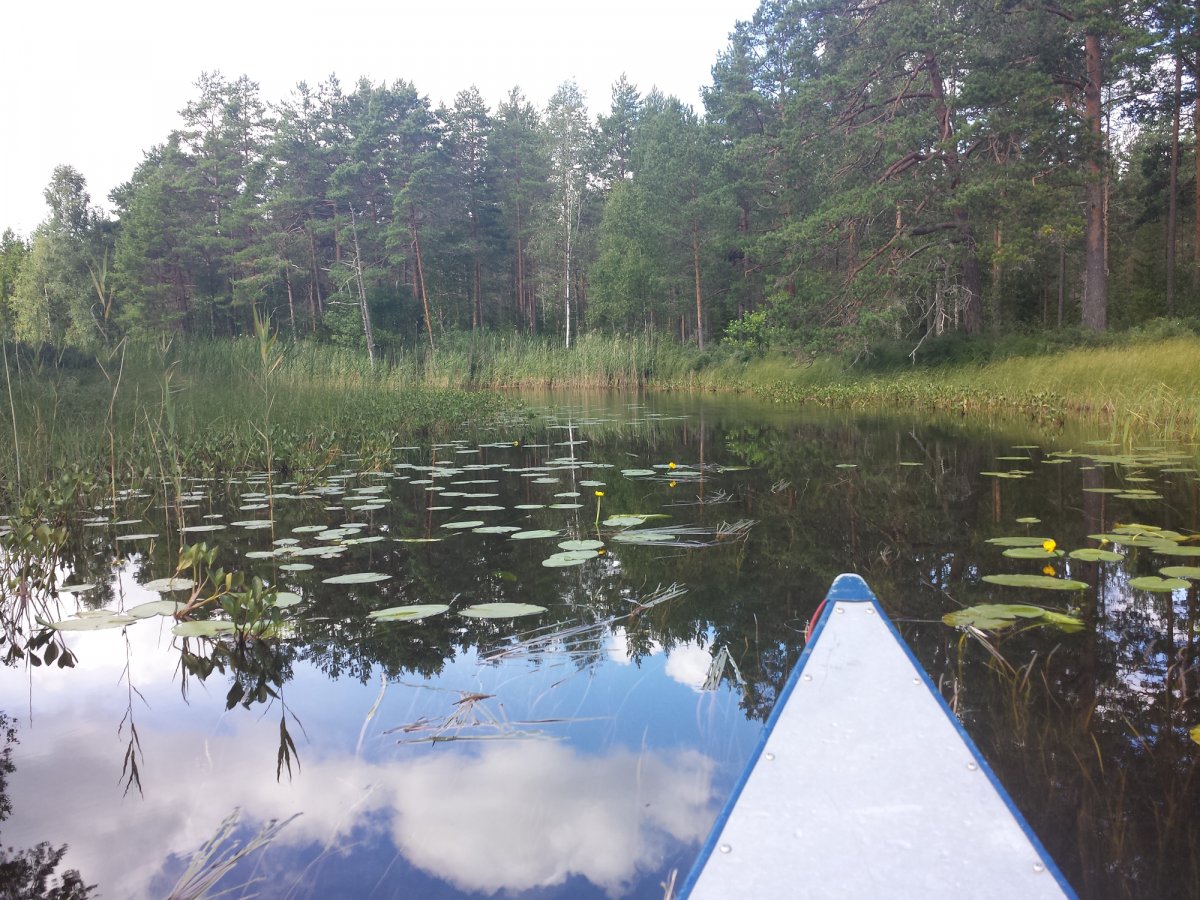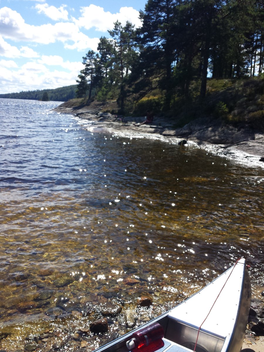 Gegen Nachmittag zogen wir los um unser Kanu abzuholen. Wir unternahmen direkt noch eine kurze Tour über den See und kehrten anschließend ziemlich erschöpft in unser Hüttchen zurück. Dort wartete bereits unser Verpflegungs- und Ausrüstungspaket, das uns netterweise direkt zur Hütte geliefert wurde. Wir hatten das vegetarische Verpflegungspaket gewählt und waren insgesamt sehr zufrieden mit der Menge und Auswahl der beinhalteten Lebensmittel. Obwohl mein Freund ein wirklich guter Esser ist, kamen wir mit dem Essen gut eine Woche lang aus. Wir erfreuten uns auch sehr an unseren mitgebrachten Weinflaschen und würden dies auch allen Freunden des gepflegten Genusses als Tipp mit auf die Reise geben ;) Abends besuchten wir noch die Badestelle in dem nahegelegenen Örtchen (ca. 10 Minuten Fußweg) um den See auf seine Badetauglichkeit zu überprüfen ( sehr gut).