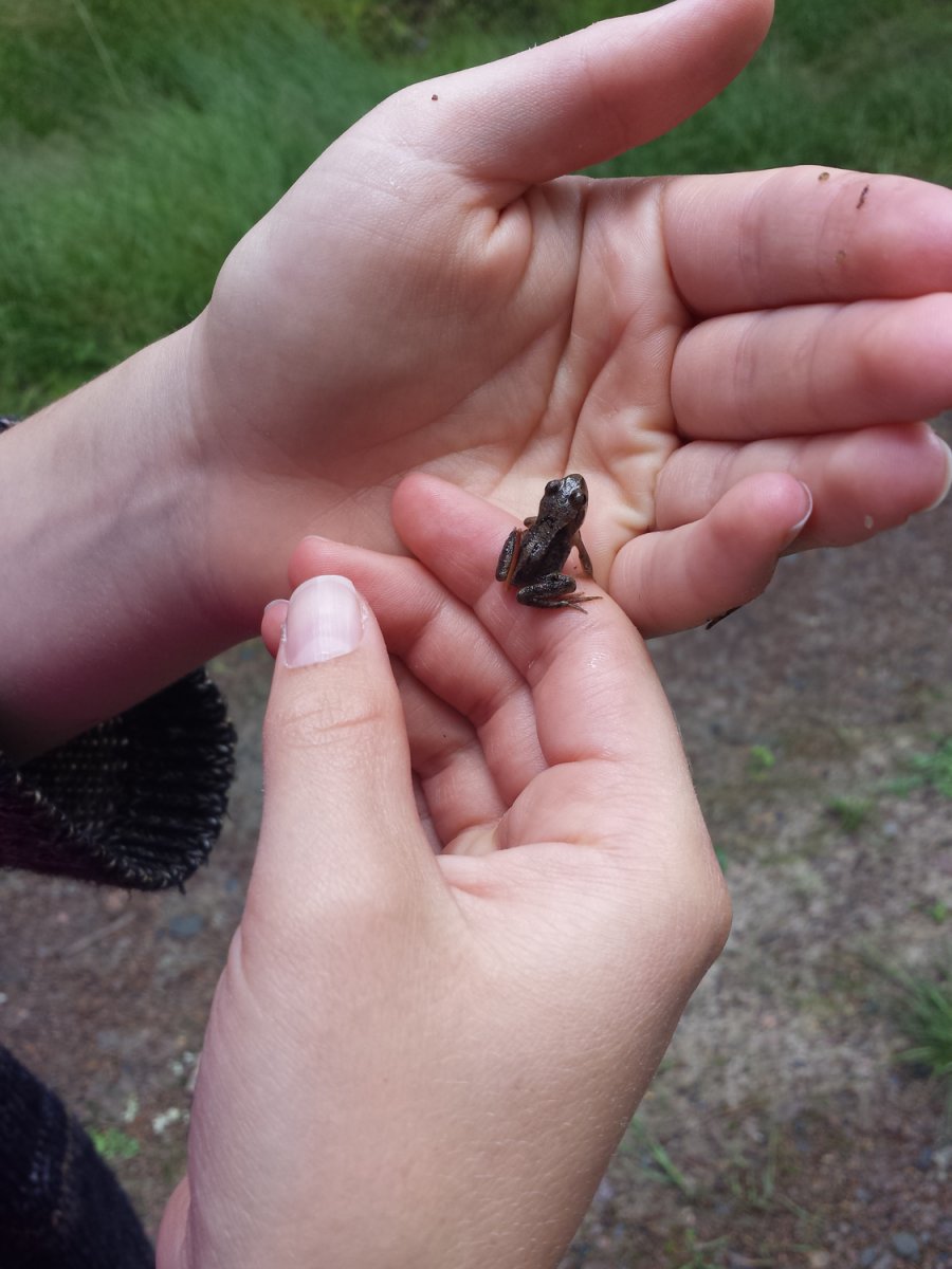 Dort kamen wir erschöpft an und waren, da ein Dauerregen eingesetzt hatte, glücklich über unser festes Dach über dem Kopf. Am nächsten Tag war das Wetter eher unbeständig, daher entschieden wir uns gegen eine längere Kanutour und machten stattdessen einen Spaziergang zu einem verlassenen Häuschen in dem nahegelegenen Wald (die Wegbeschreibung hängt bei dem Basiscamp aus). Wir waren sehr beeindruckt von dem Ambiente des Häuschens, das obwohl es vermutlich in den 1930er verlassen wurde, noch über eine vollständige Inneneinrichtung verfügt und betreten werden kann. Außerdem waren wir begeistert von dem schönen Waldweg dorthin, auf dem uns viele kleine Frösche begegneten.